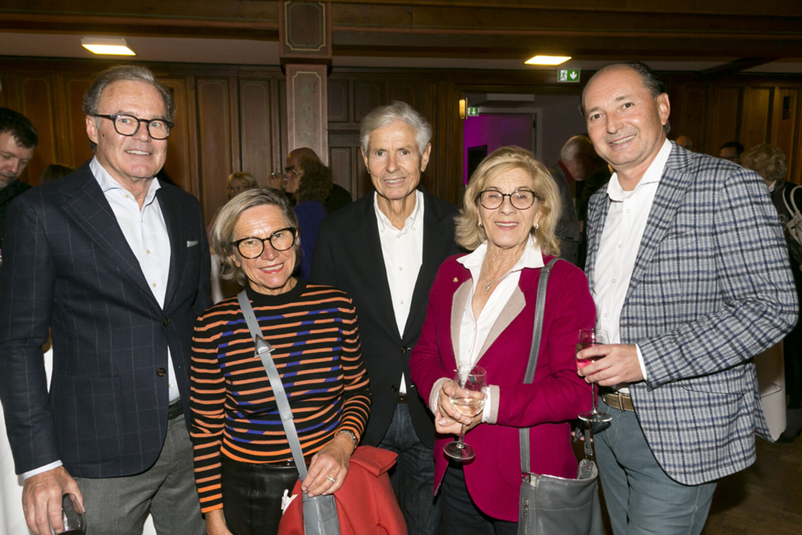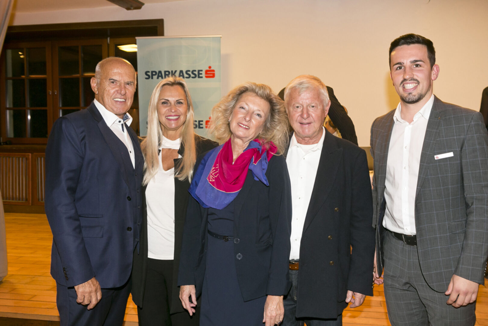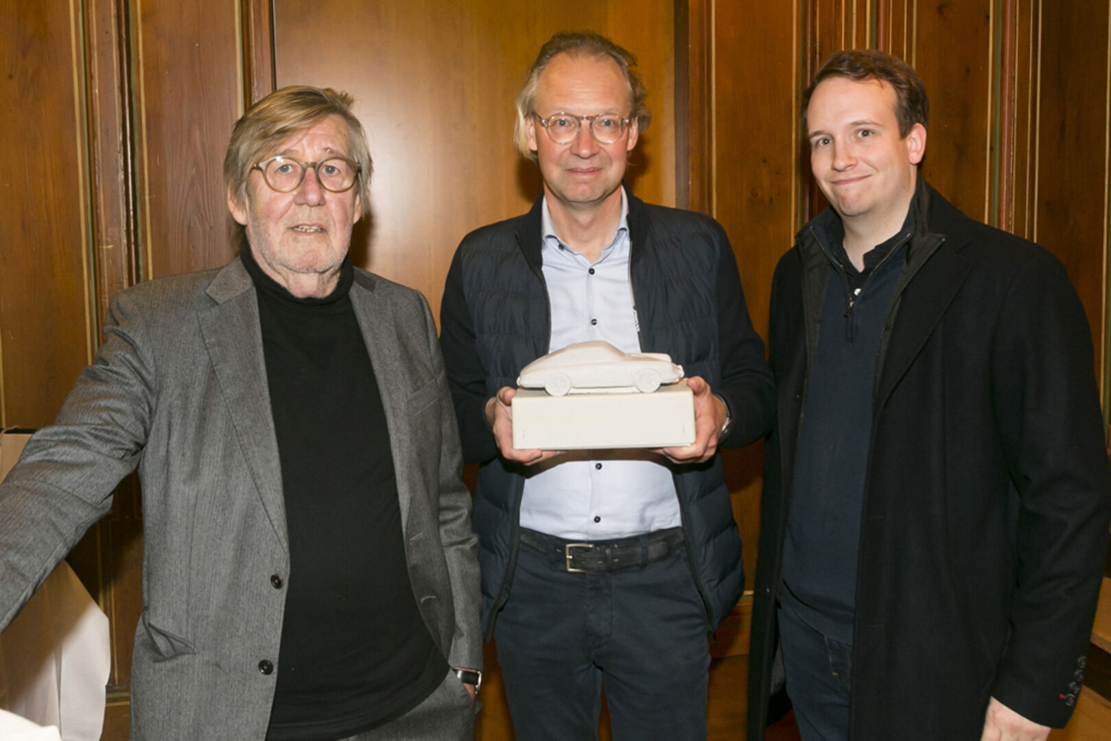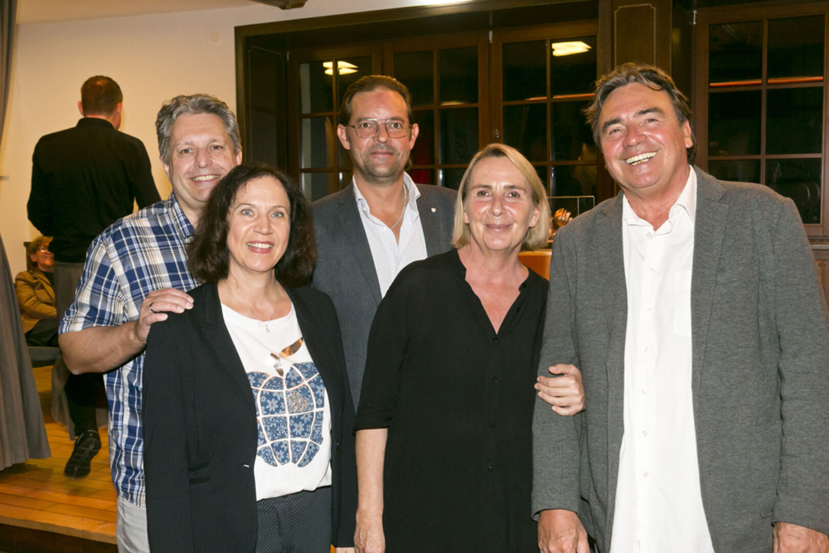 Die Vorstandsdirektoren der Sparkasse Bregenz Gerhard Lutz (li.) und Johannes Hämmerle (re.) mit Künstler und Gestalter des Kunstsparbuchs 2022 Gottfried Bechtold.