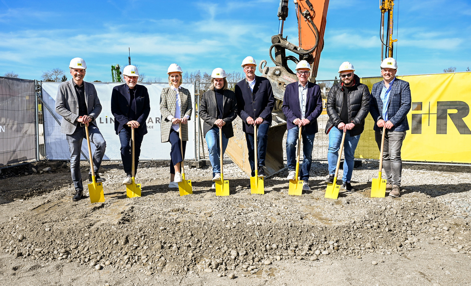 Feierten am 22. März 2023 den Spatenstich für das Vierlinden-Quartier und die Lindaupark-Erweiterung: Karlheinz Bayer (GF i+R Wohnbau Lindau), Joachim Alge (Eigentümer i+R Gruppe), Dr. Claudia Alfons (Oberbürgermeisterin Stadt Lindau), Reinhard Schertler (Eigentümer i+R Gruppe), Thomas Feneberg (Eigentümer Lindaupark), Michael Schneckenburger (Center-Leiter Lindaupark und Projektleiter), Kay Koschka (Leiter Stadtbauamt Lindau), Stefan Hämmerle (Projekt- und Bauleiter i+R Wohnbau Lindau) (Foto v. li.)