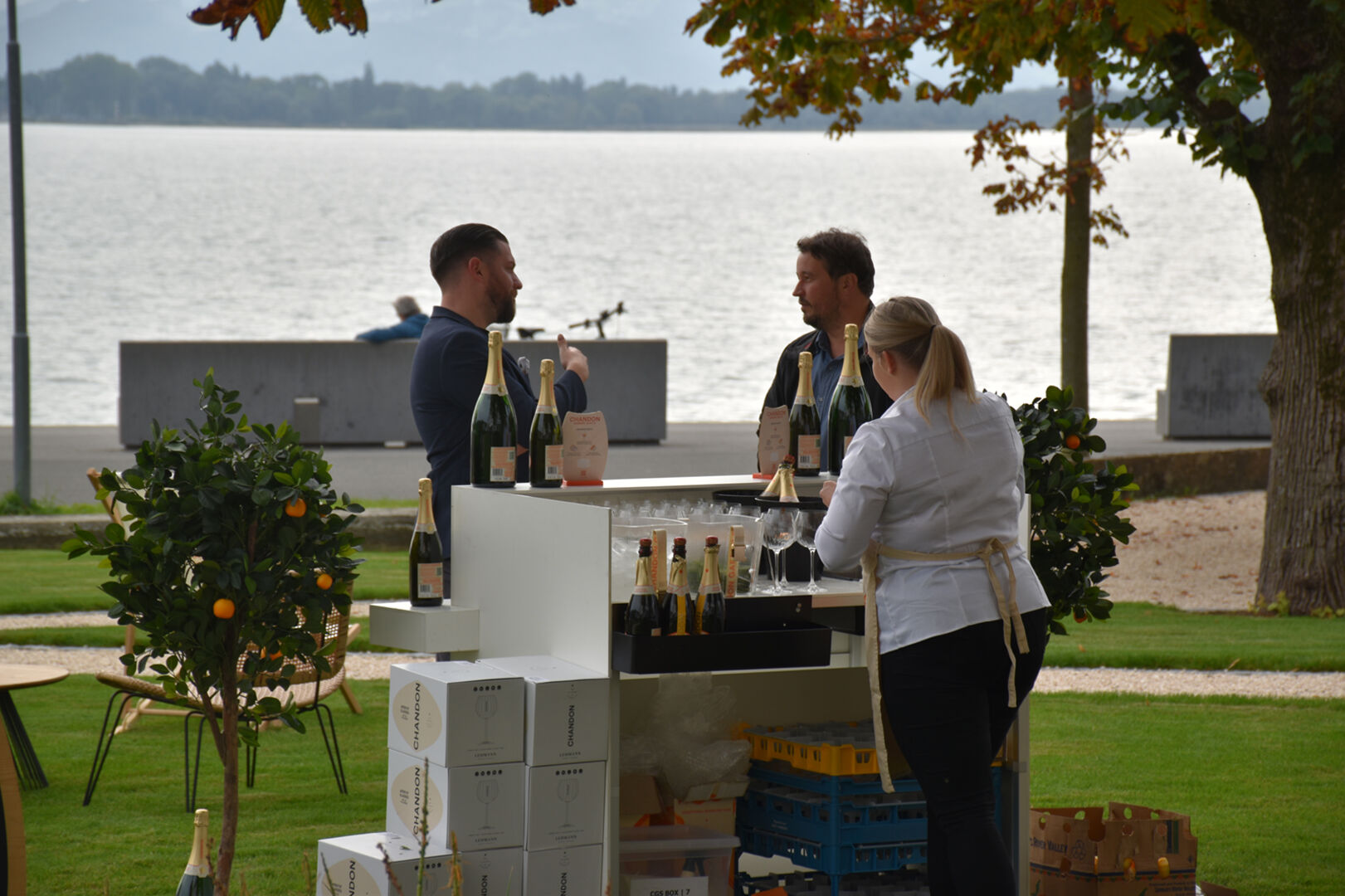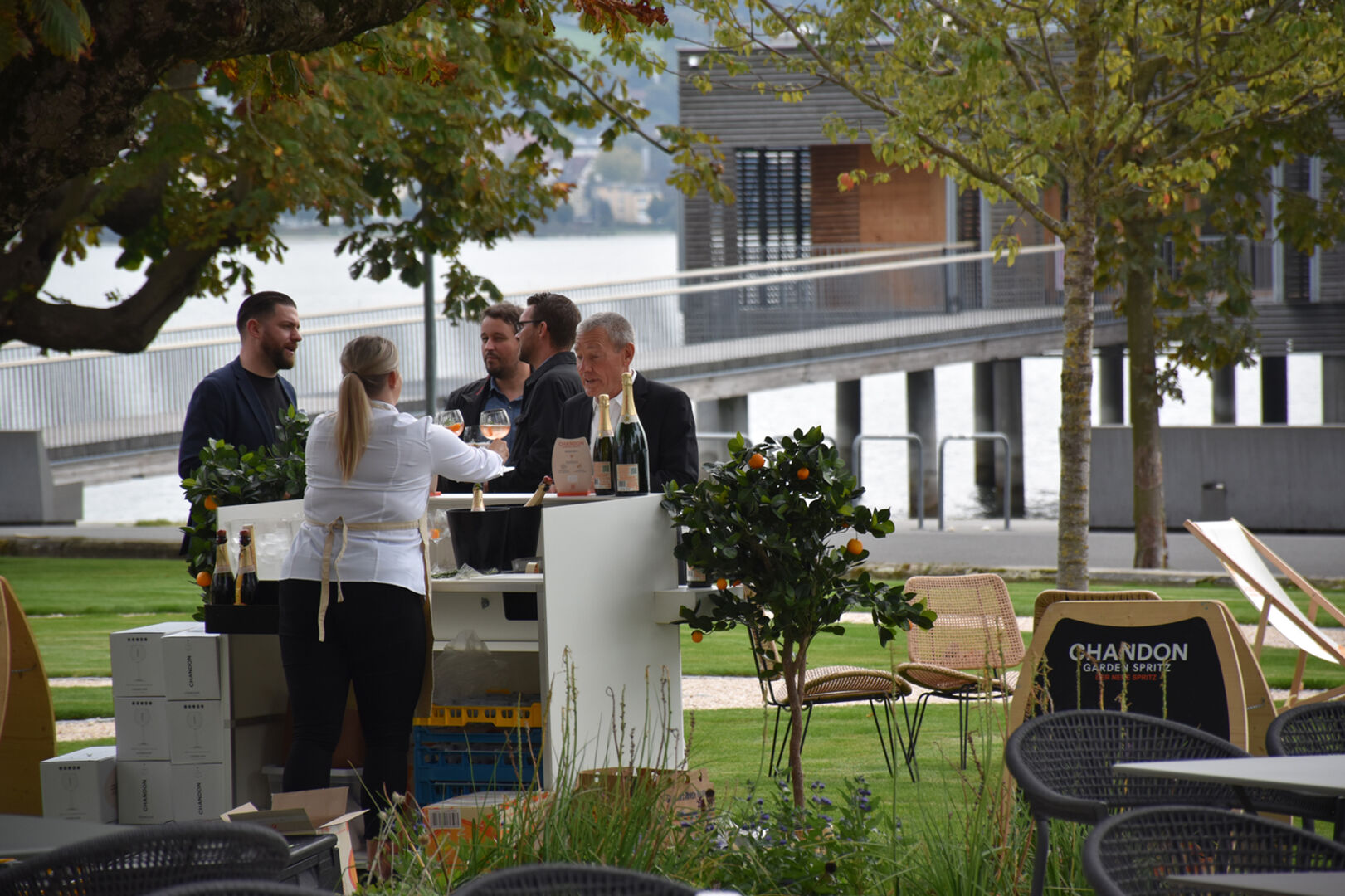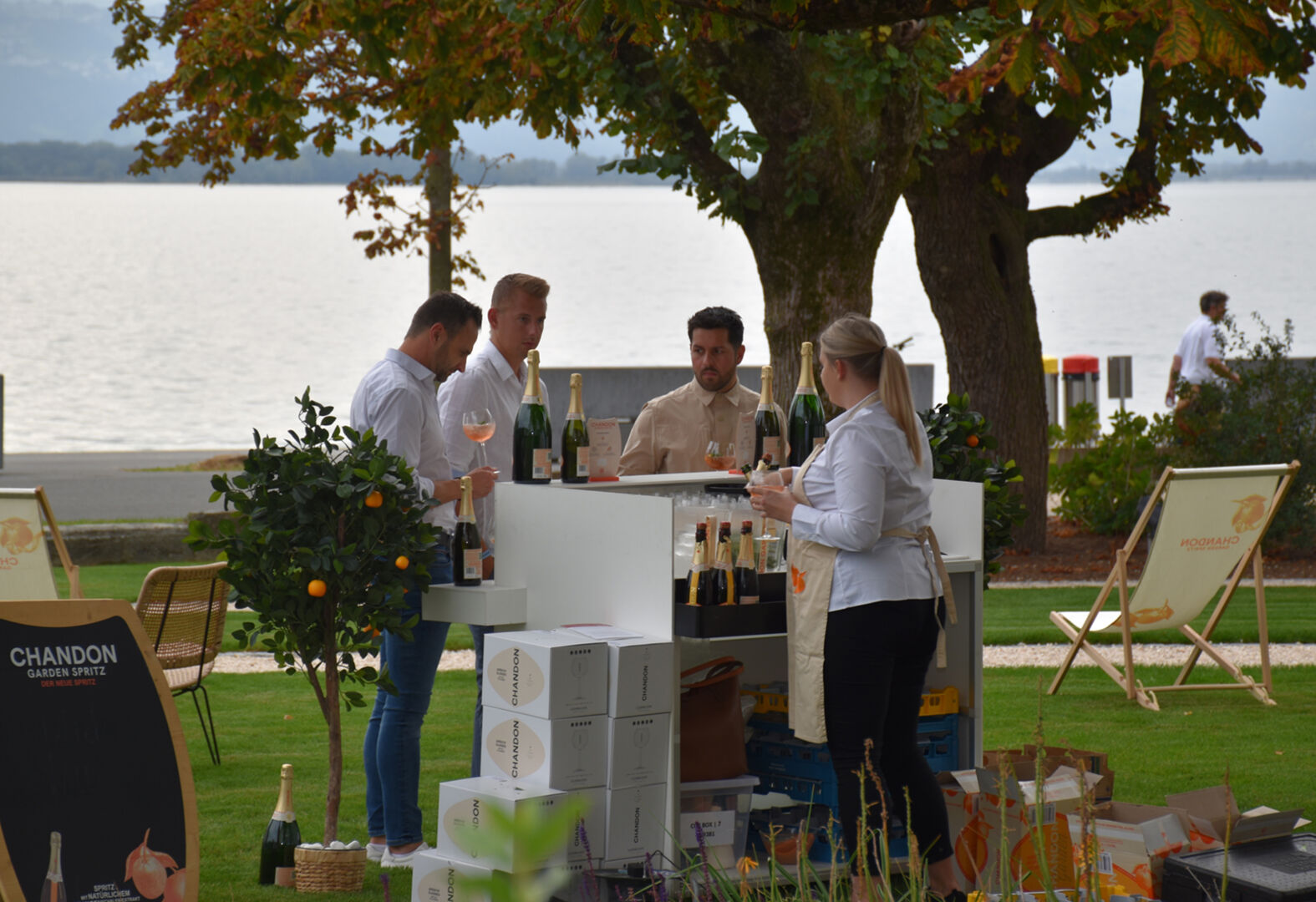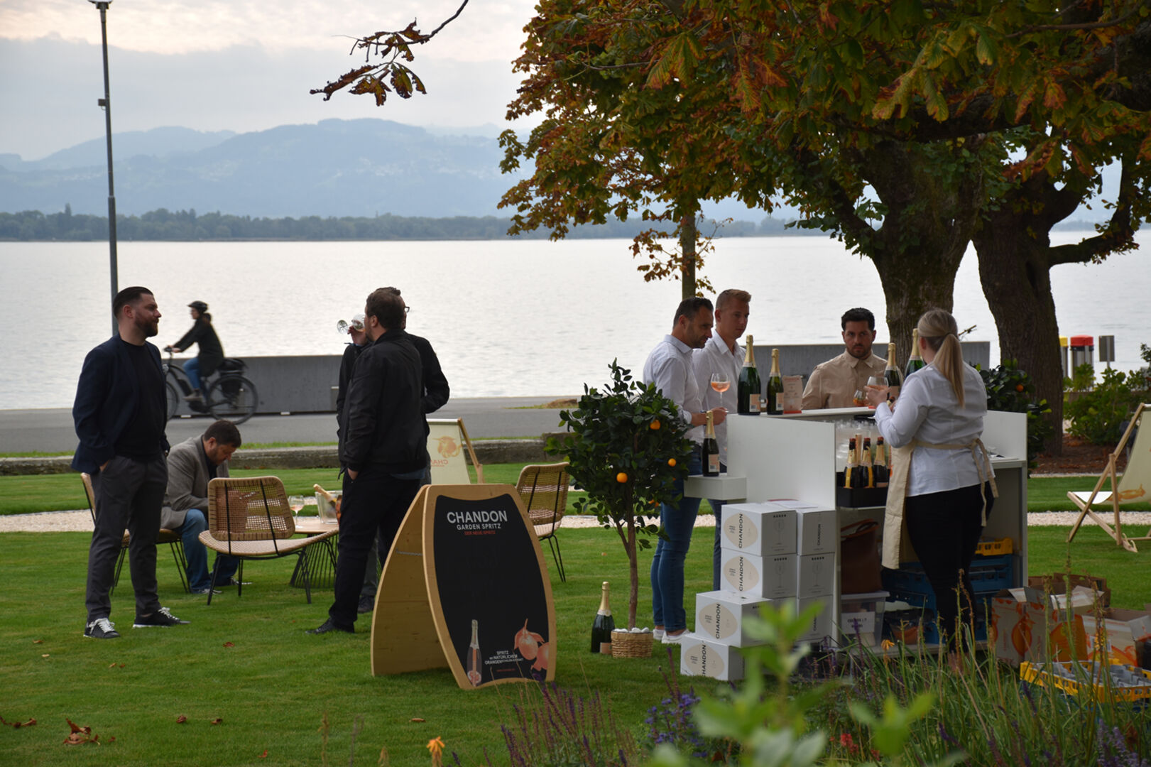 Manuel Febel (Moet Hennessy) Chandon Gardenspritz, Aperitiv, Vanessa Kleppel (Pfanner) mit Markus Pfanner und Mathias Strigl
