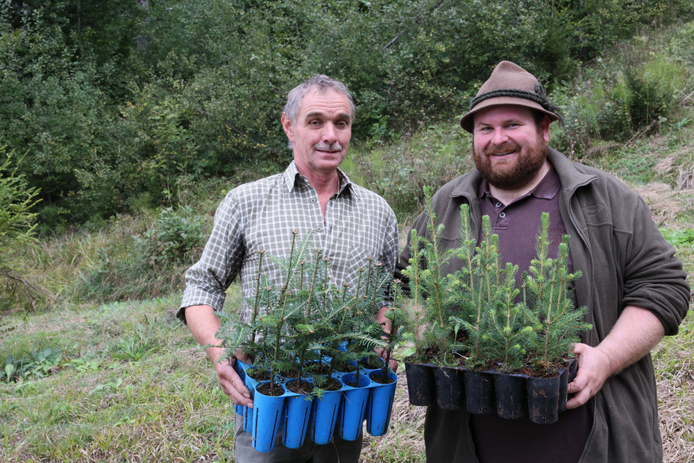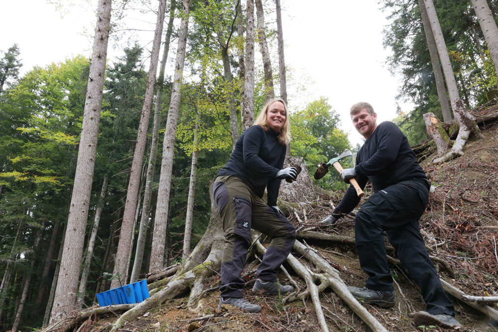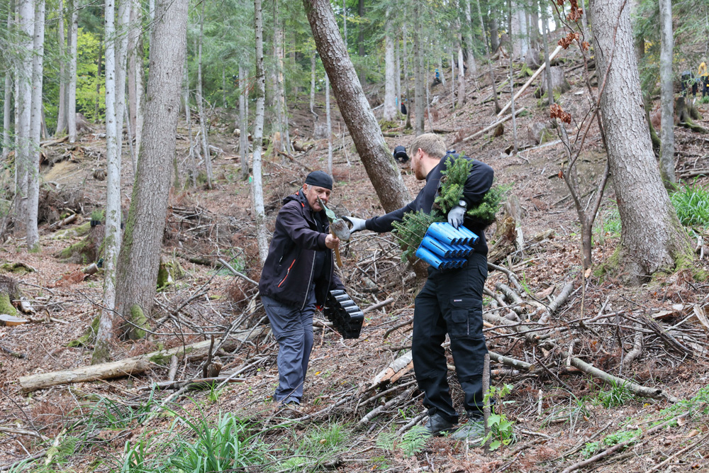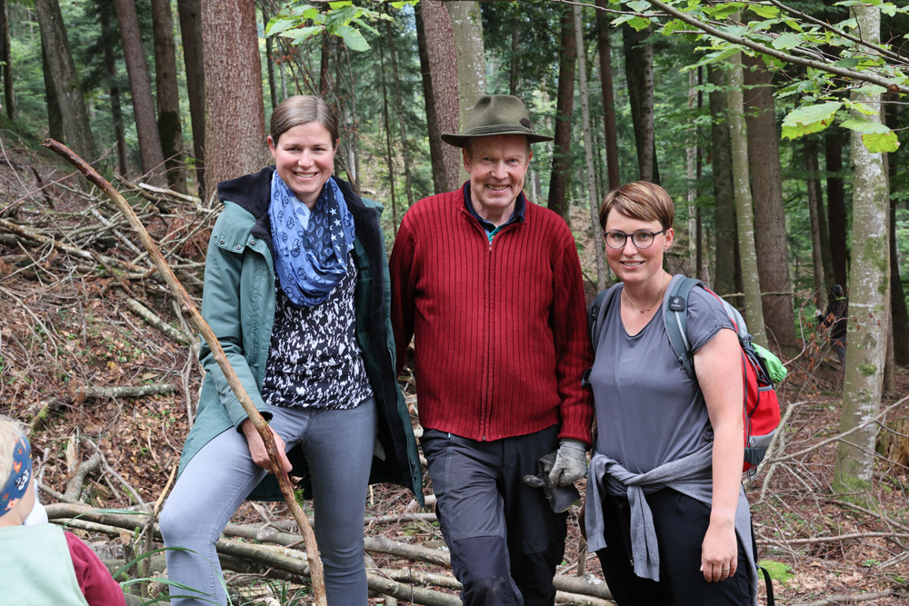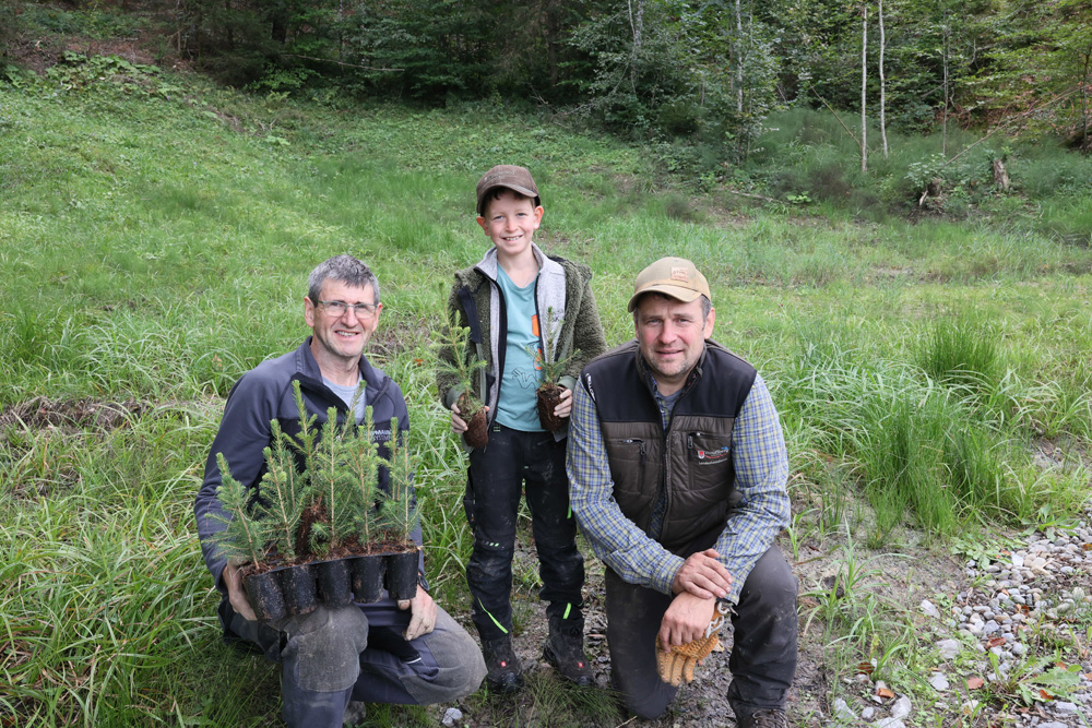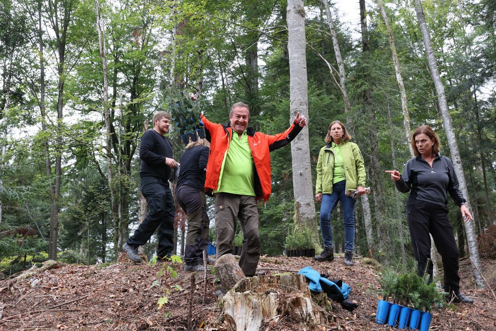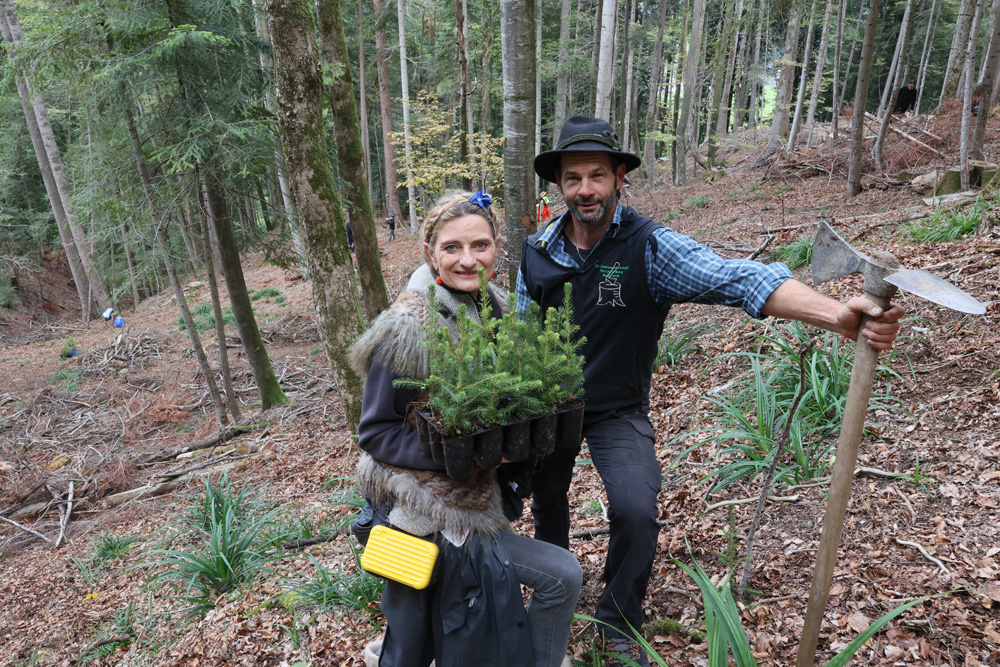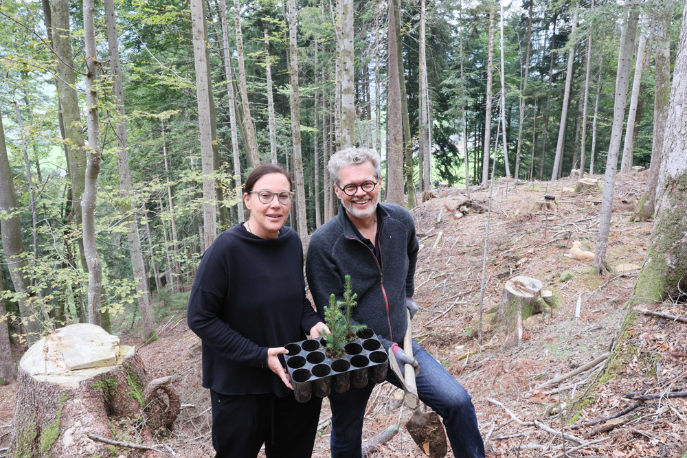 Jahrhundertwald-Initiatorin Irmi-Marie Ritter-Sachs mit Baumpater Andreas Amann und Clubpräs. Gerhard Steurer bei der Aufforstung im Bregenzerwald