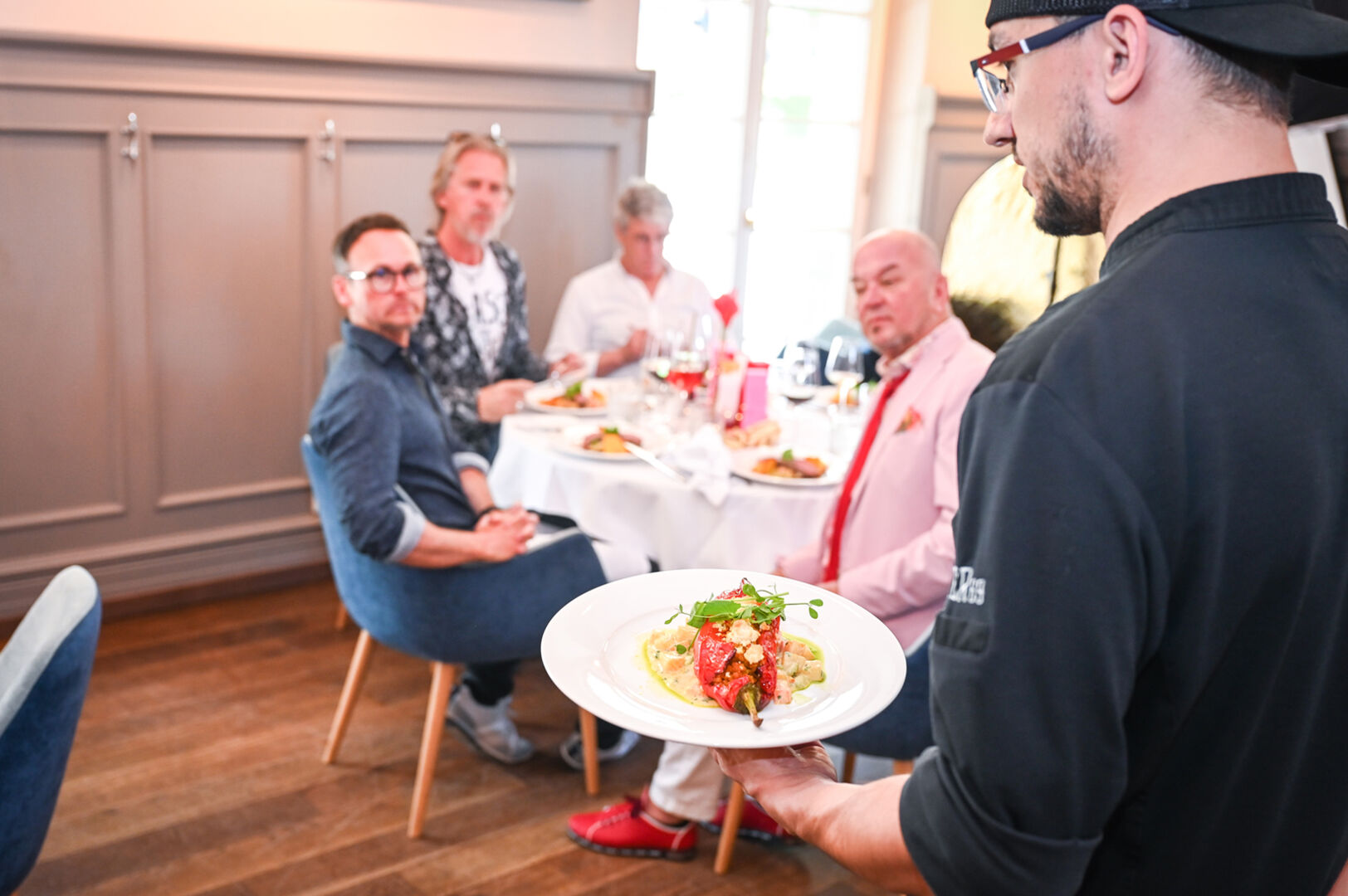Thomas Neubert (Küchenchef Pier69) mit veganer Hauptspeise: Gefüllte Spitzpaprika, Bulgur, winterliches Gemüse, Mandel-Velouté