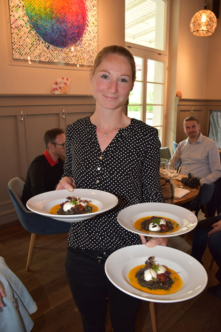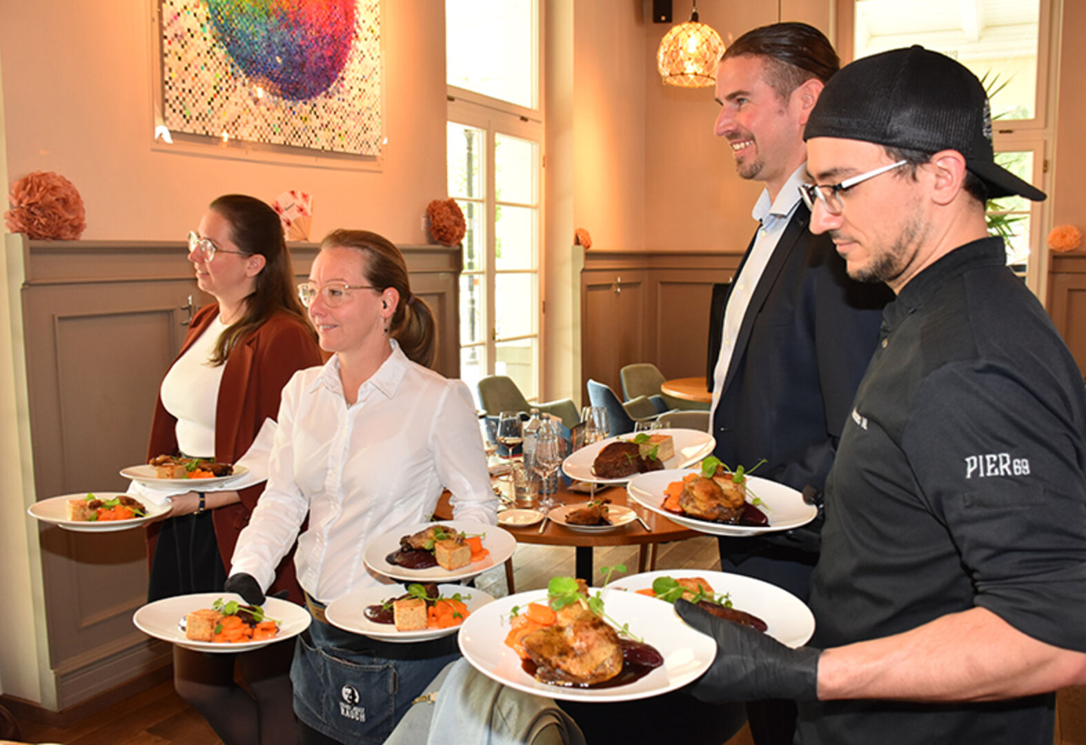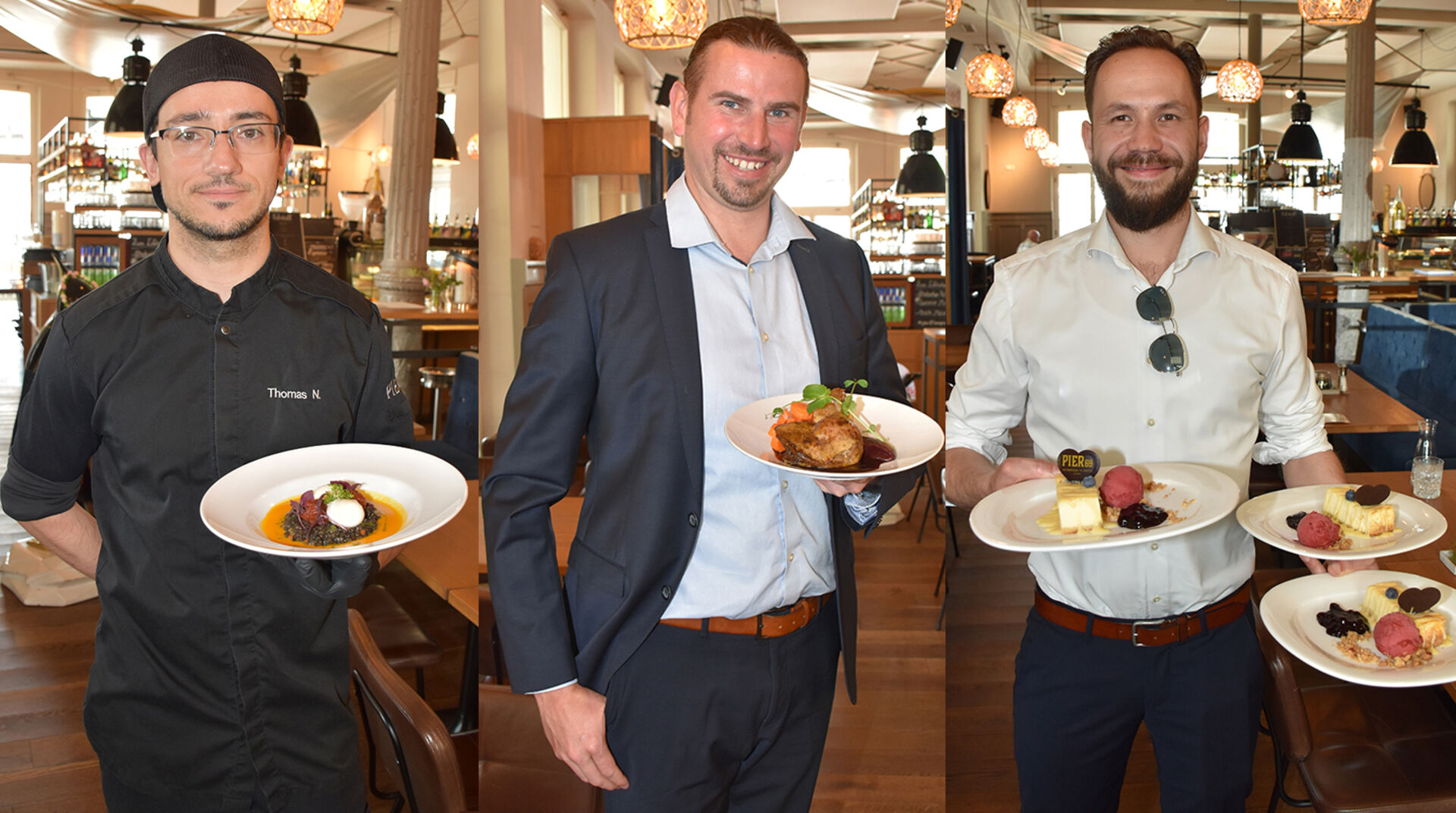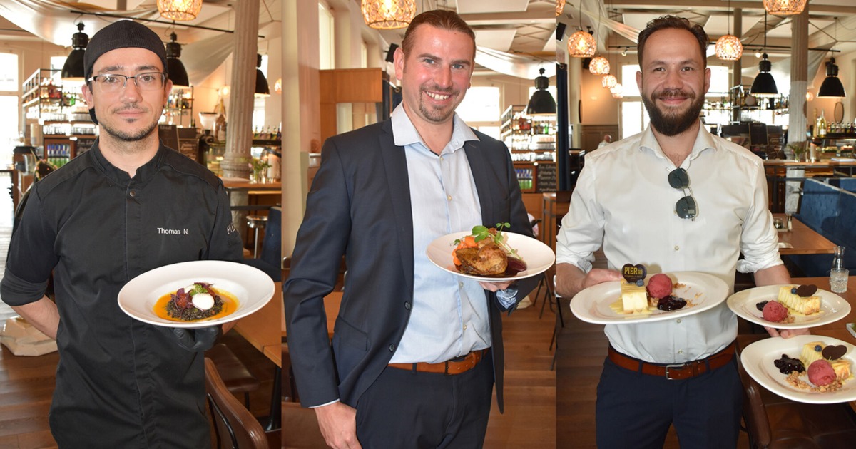 Bild oben: Küchenchef Thomas Neubert, GF Lukas Buttazoni und Betriebsleiter David Friedl (alle Pier 69) präsentieren das Varieté am Bodensee-Menü: Mini Büffelmozzarella auf Kürbis-Gazpacho, confierte Entenkeule mit Holunderbeerjus und Riebelwürfel sowie Dessert Cheesecake mit zweierlei Heidelbeer.