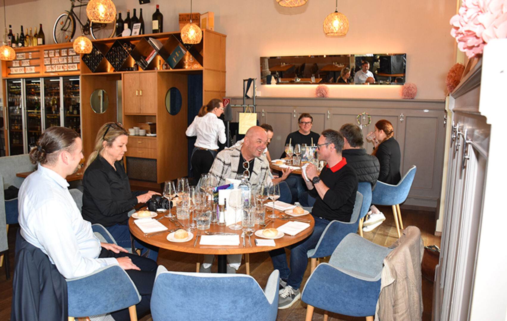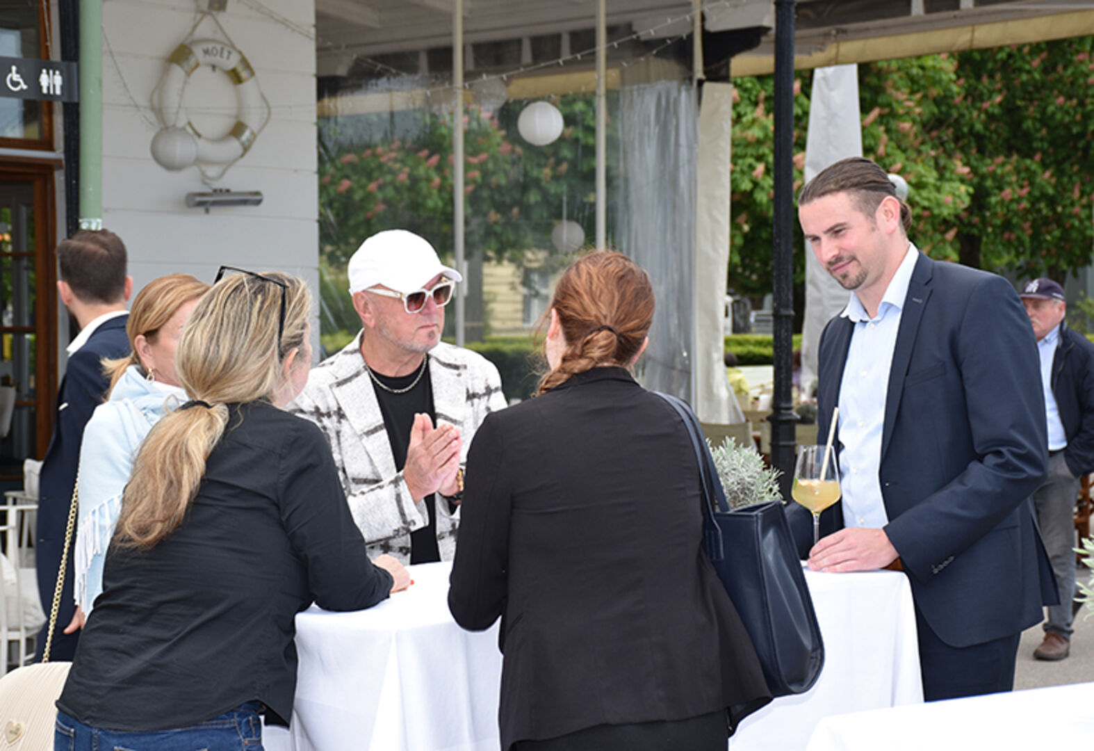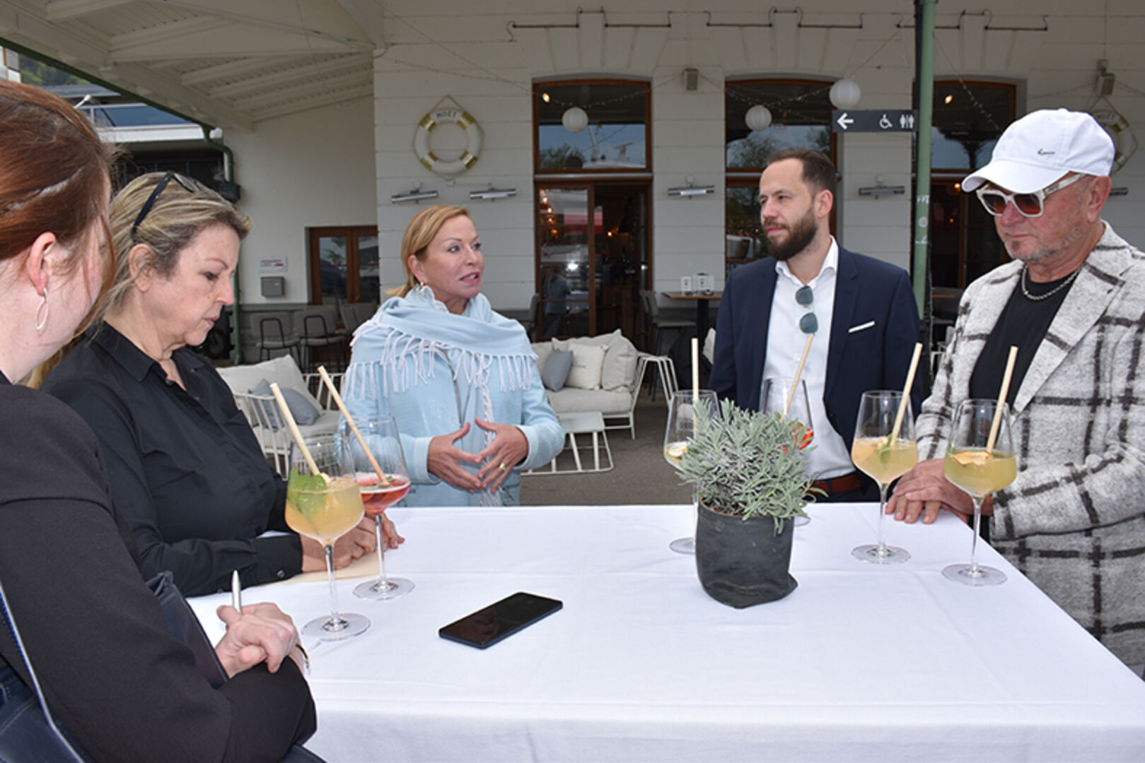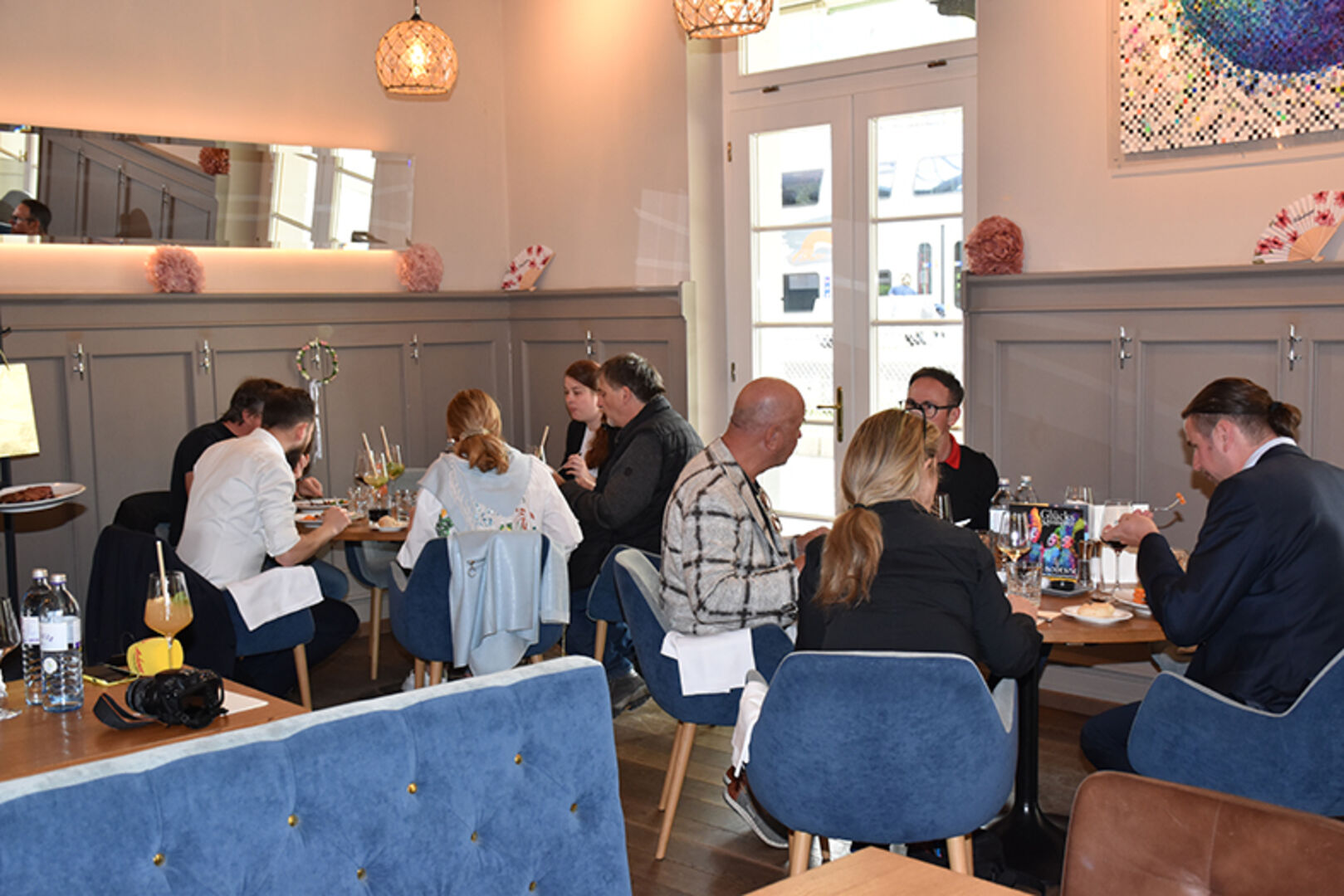 Bild oben: Küchenchef Thomas Neubert, GF Lukas Buttazoni und Betriebsleiter David Friedl (alle Pier 69) präsentieren das Varieté am Bodensee-Menü: Mini Büffelmozzarella auf Kürbis-Gazpacho, confierte Entenkeule mit Holunderbeerjus und Riebelwürfel sowie Dessert Cheesecake mit zweierlei Heidelbeer.