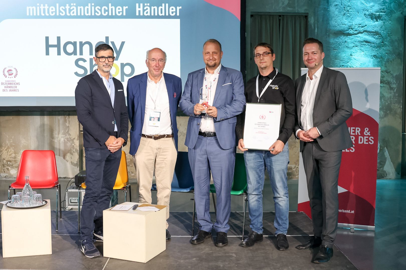 In der Kategorie "Mittelständischer Händler" (50 bis 249 Beschäftigte) gewann HandyShop.cc aus Deutschlandsberg bereits zum zweiten Mal nach 2020. Das Unternehmen bietet Beratung zu Tarifen, vertragsfreie Handys aller Marken sowie Lösungen für Internet, TV und smarte Geräte. CEO Robert Ribic und Peter Ribic nahmen den Pokal persönlich entgegen.