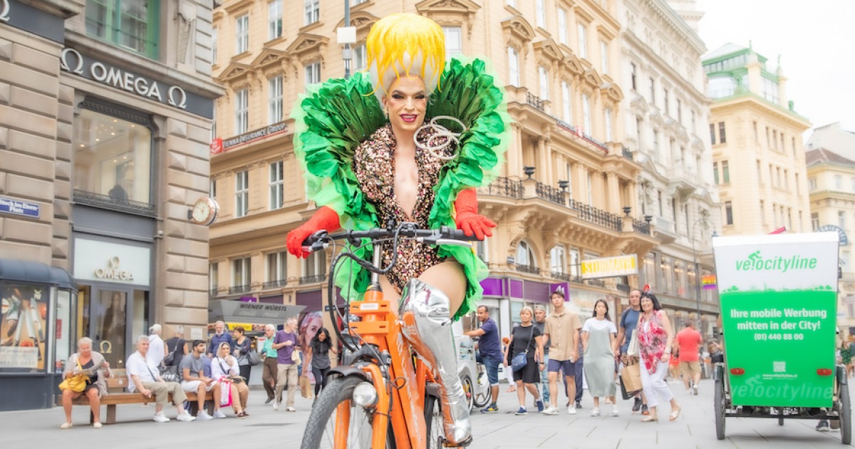 Ende Juli hat sich die Performerin in Wien in ihrem selbst entworfenen Outfit dann für den guten Zweck auf einen Lieferando-Drahtesel geschwungen. Zu den Gerichten gab es jeweils auch ein Gewinnlos für die Spenden-Lotterie. „Es hat Spaß gemacht, in die Rolle eines Lieferando-Drivers zu schlüpfen“, so die Neo-Radlerin, die sich dabei selbst als routinierte Essensbestellerin outete.