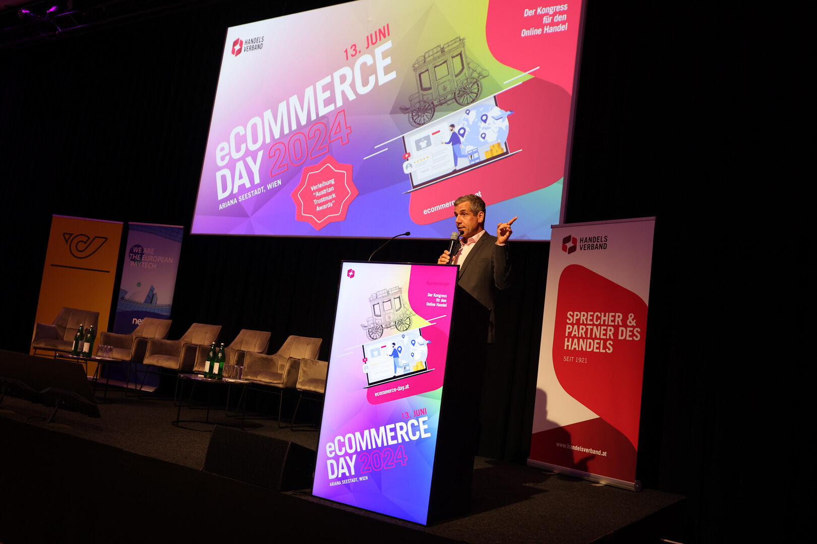 Dacapo für den Commerce Day des Handelsverbandes in der Ariana Wien (Seestadt Aspern): Die Veranstaltung bot über 350 Besuchern und branchenkundigen Speakern eine Chance, sich über aktuelle und künftige Trends im Onlinehandel zu informieren. HV-Präsident Stephan Mayer-Heinisch, der HV-Geschäftsführer Rainer Will und Puls4-Moderator Werner Sejka stellten Themen wie QuickCommerce, Payment-Innovationen, Conversion-Optimierung und Retail-KI vor.