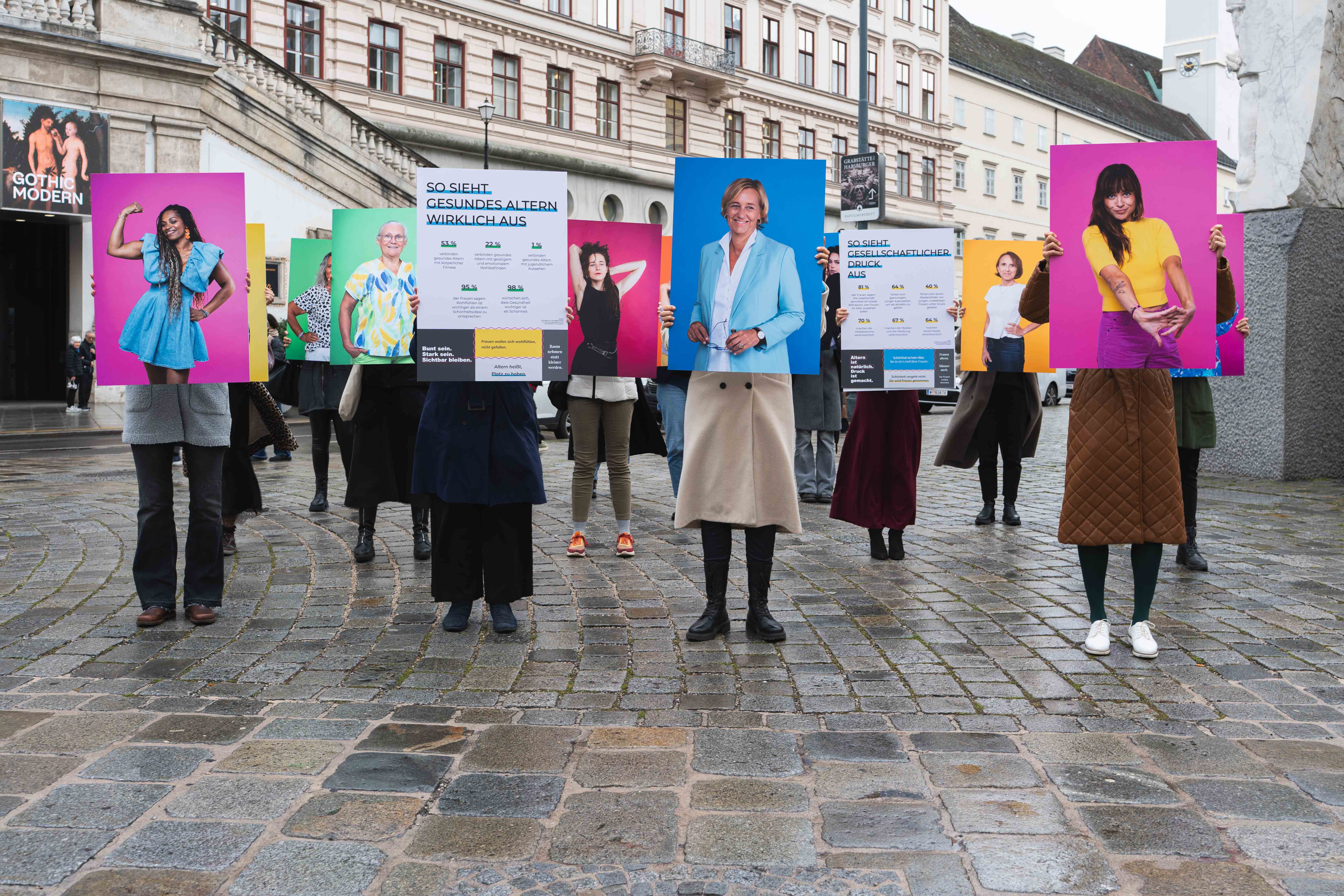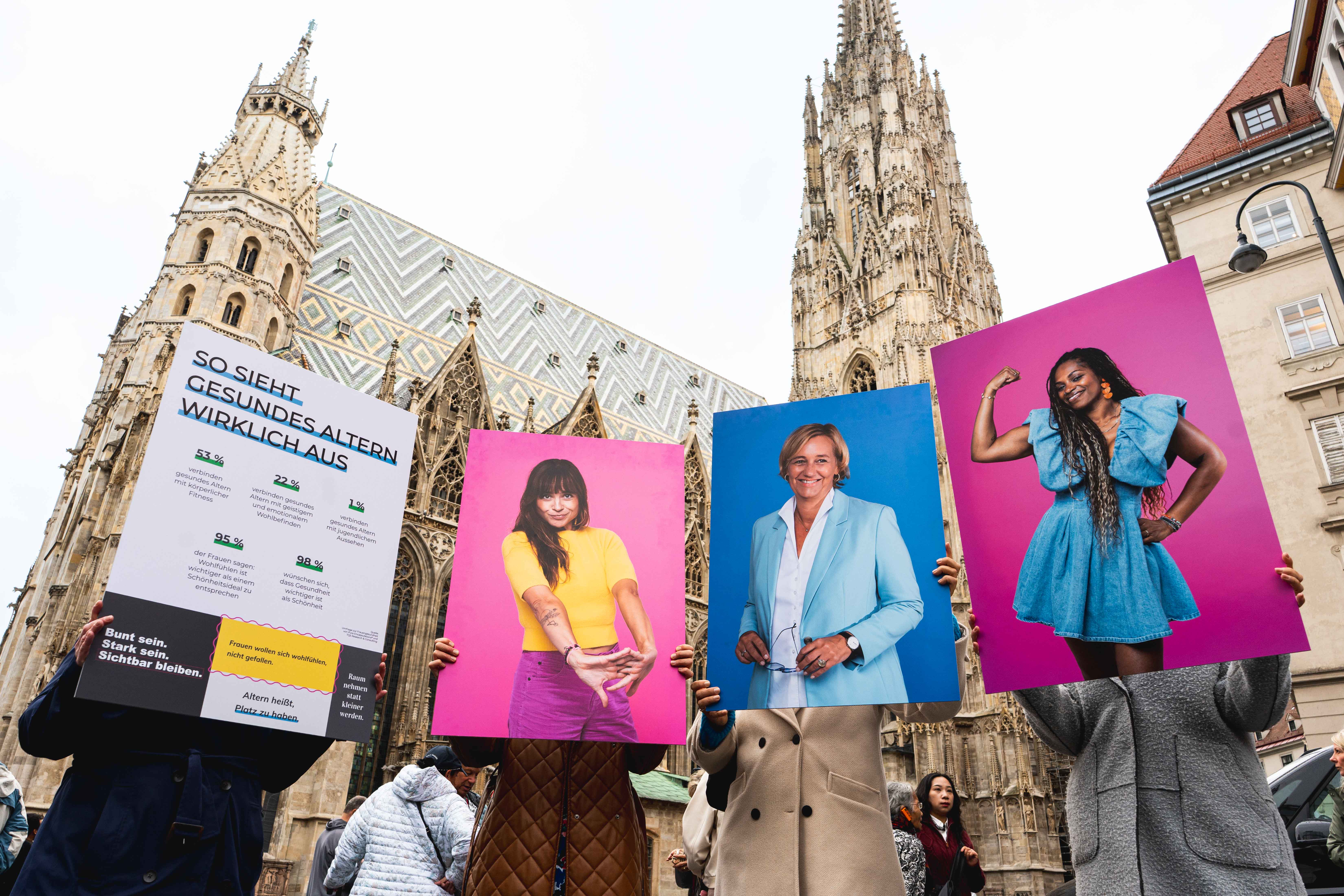 Frauen jeden Alters zogen mit großformatigen Porträts durch die Wiener Innenstadt und nahmen sichtbar Raum ein. Bunt, laut und vielfältig machten sie im Rahmen einer Walking Exhibition deutlich, was sonst oft unsichtbar bleibt: den Druck durch unrealistische Schönheitsideale, Diskriminierung durch Ageismus und gesellschaftliche Erwartungen.