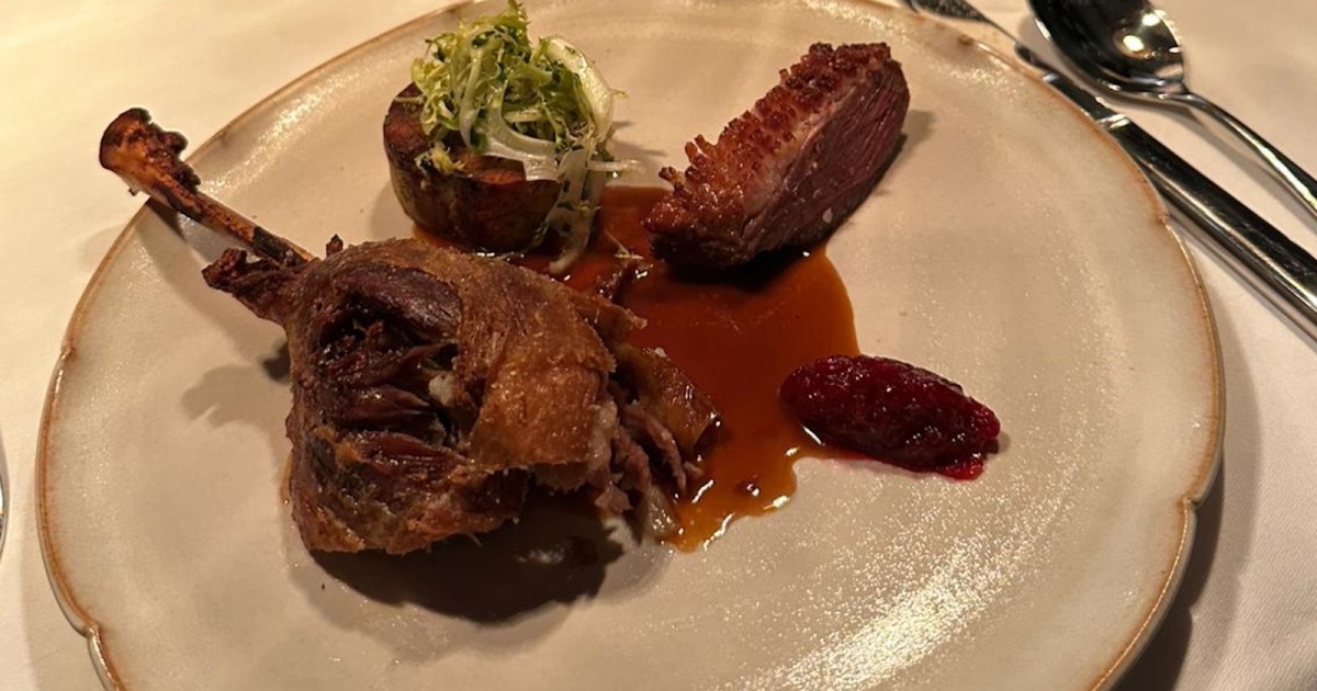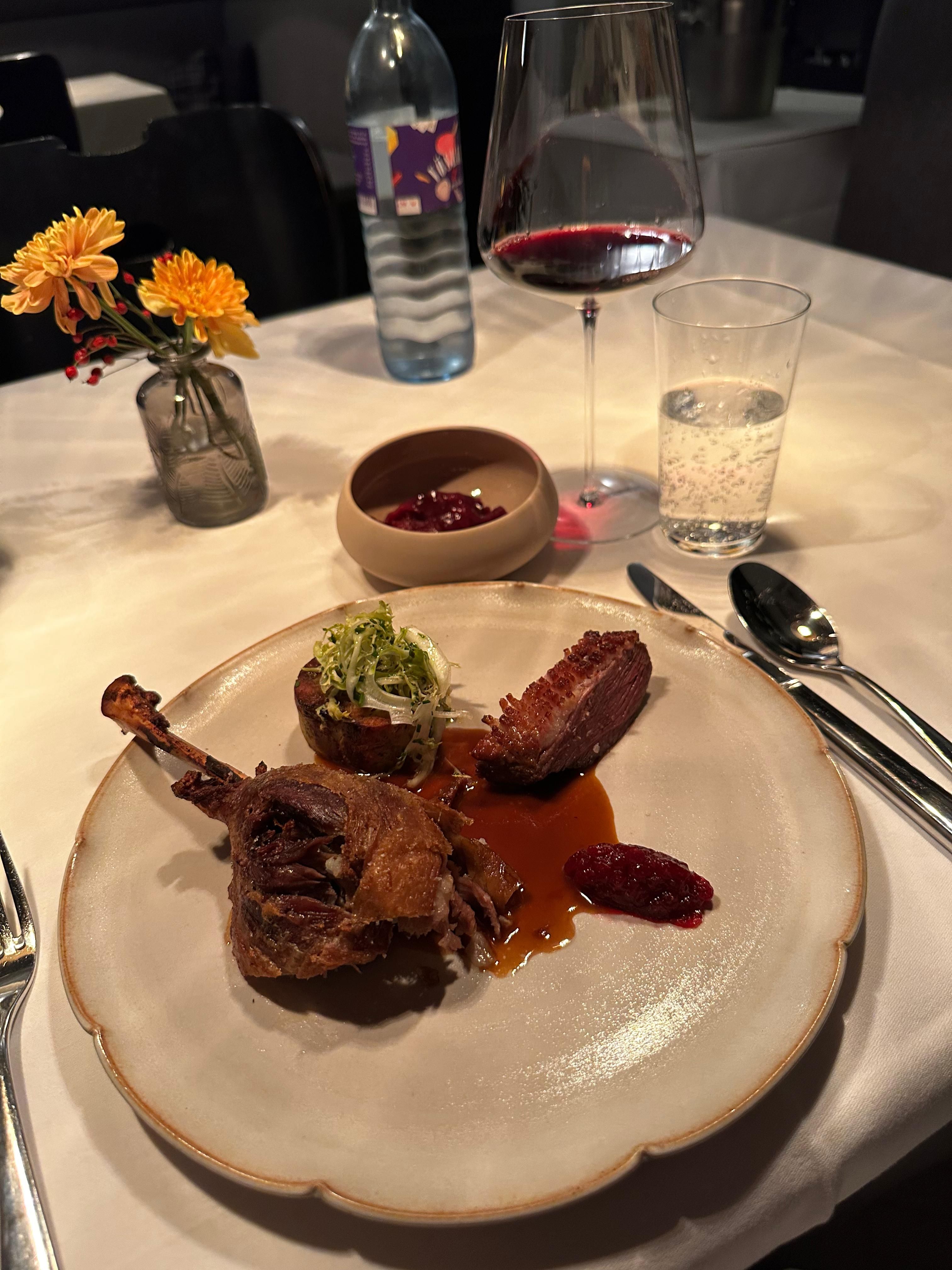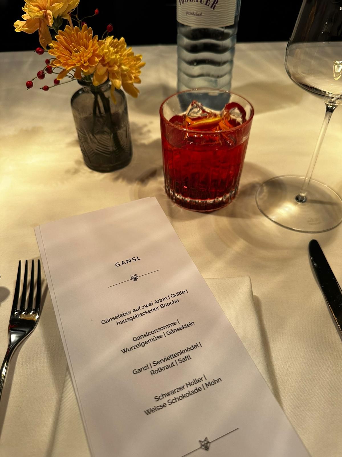 Bevor das Gansl auf den Tisch kommt, überrascht die Küche mit "Ganslgyoza" in Rote-Rüben-Saft und Dill-Öl. Süß, sauer, salzig und voller Umami. Dann der Hauptgang – das Gansl klassisch gebraten, die Brust rosa, das Haxerl mit knuspriger Haut und zartem Fleisch. Der Semmelknödel fluffig, das Rotkraut fruchtig und festlich. Begleitet wird das Ganze von einem Syrah aus Carnuntum, kräftig, warm und perfekt abgestimmt.