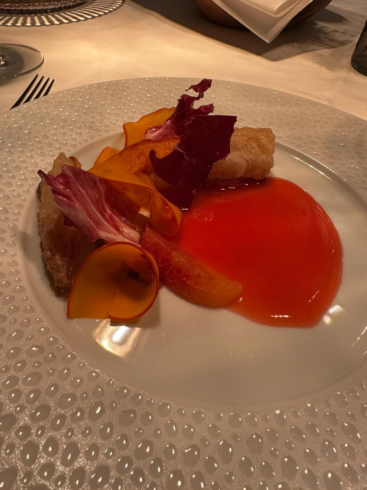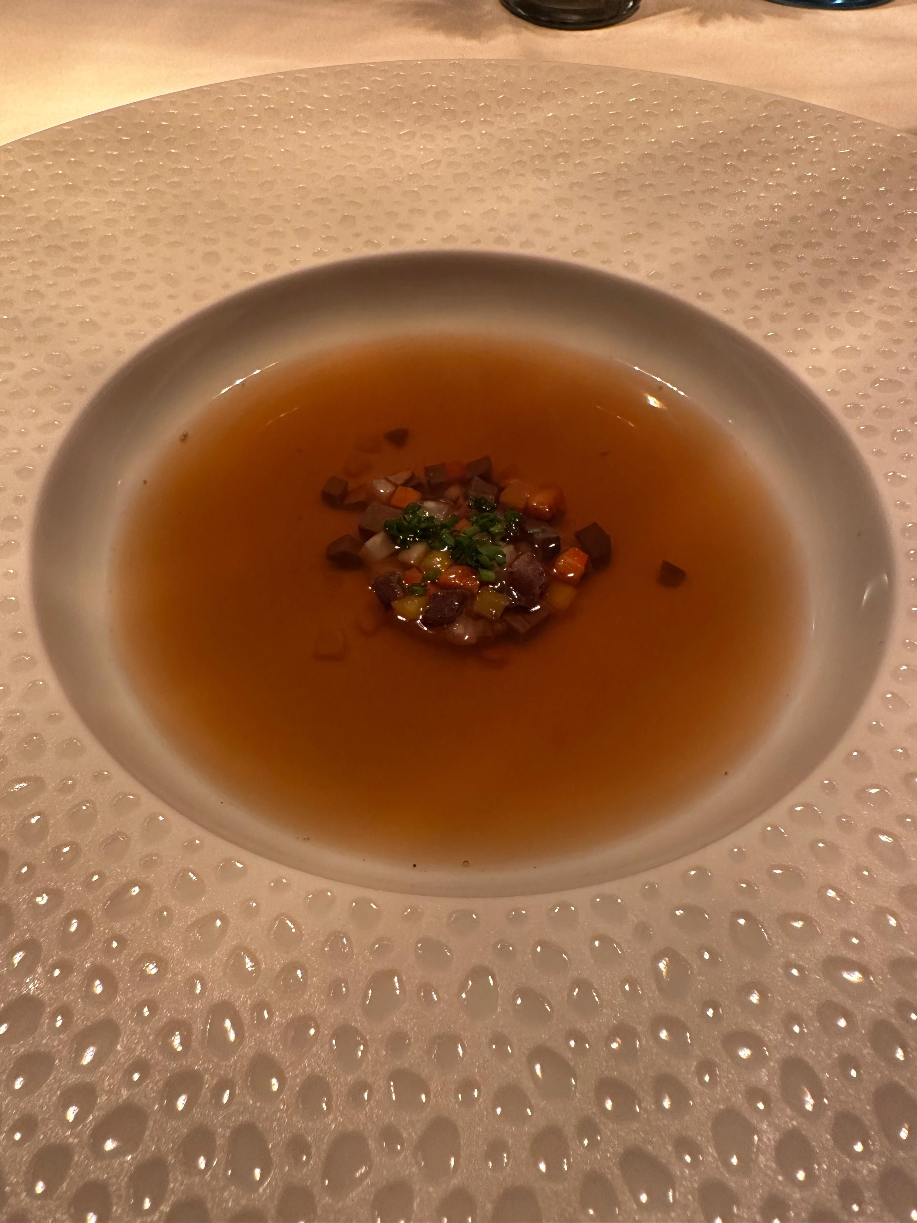 Der Kürbis spielt die Hauptrolle im Zwischengang, geschmort, eingelegt und im Tempura gebacken. Kross, nussig und zart. Dazu Radicchio und ein Hauch Gochujang für das gewisse Etwas. Die folgende Gansl-Consommé mit Wurzelgemüse und Gänseklein duftet nach Herbst und einem Hauch Weihnachten. Leicht, herzhaft und genau richtig.
