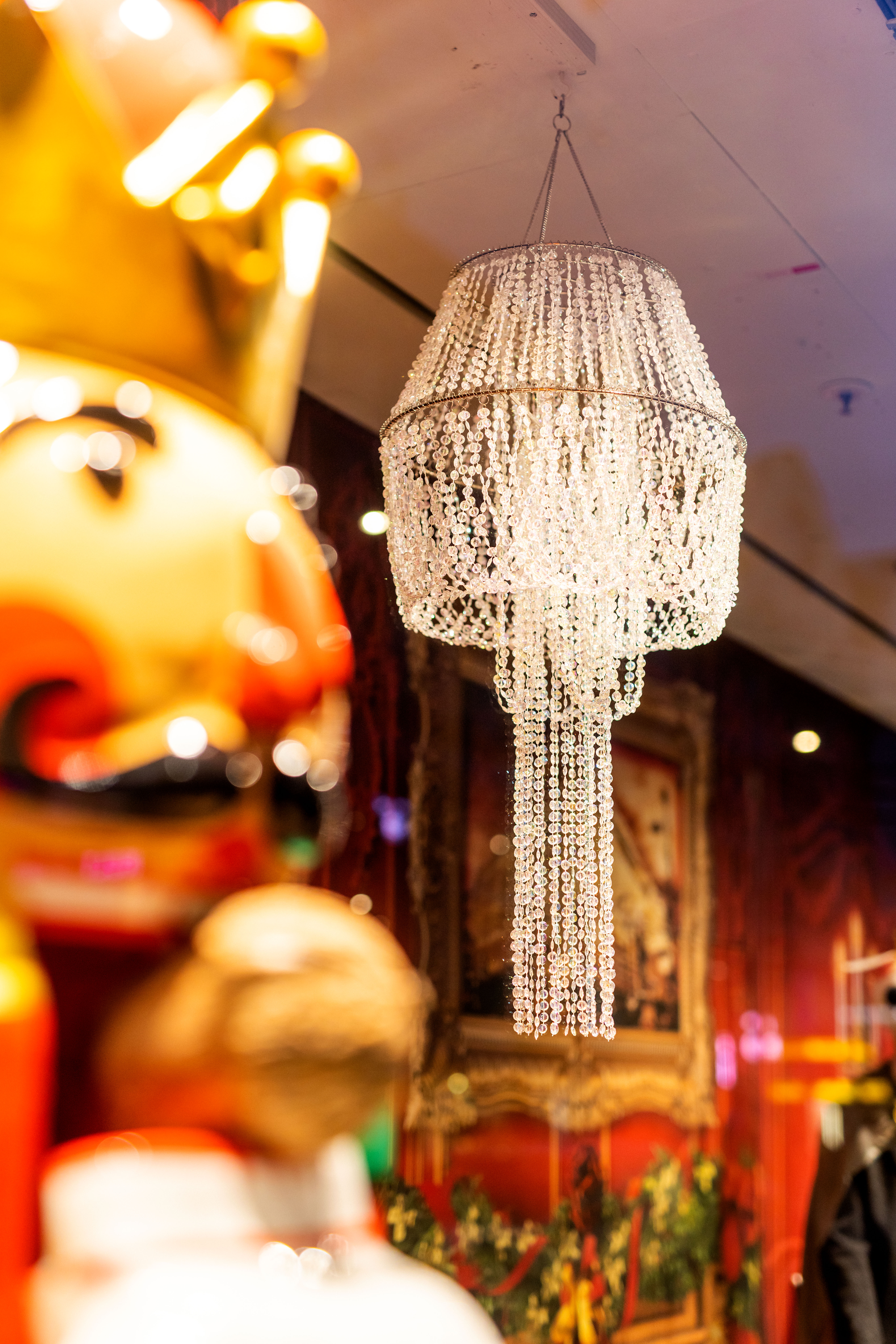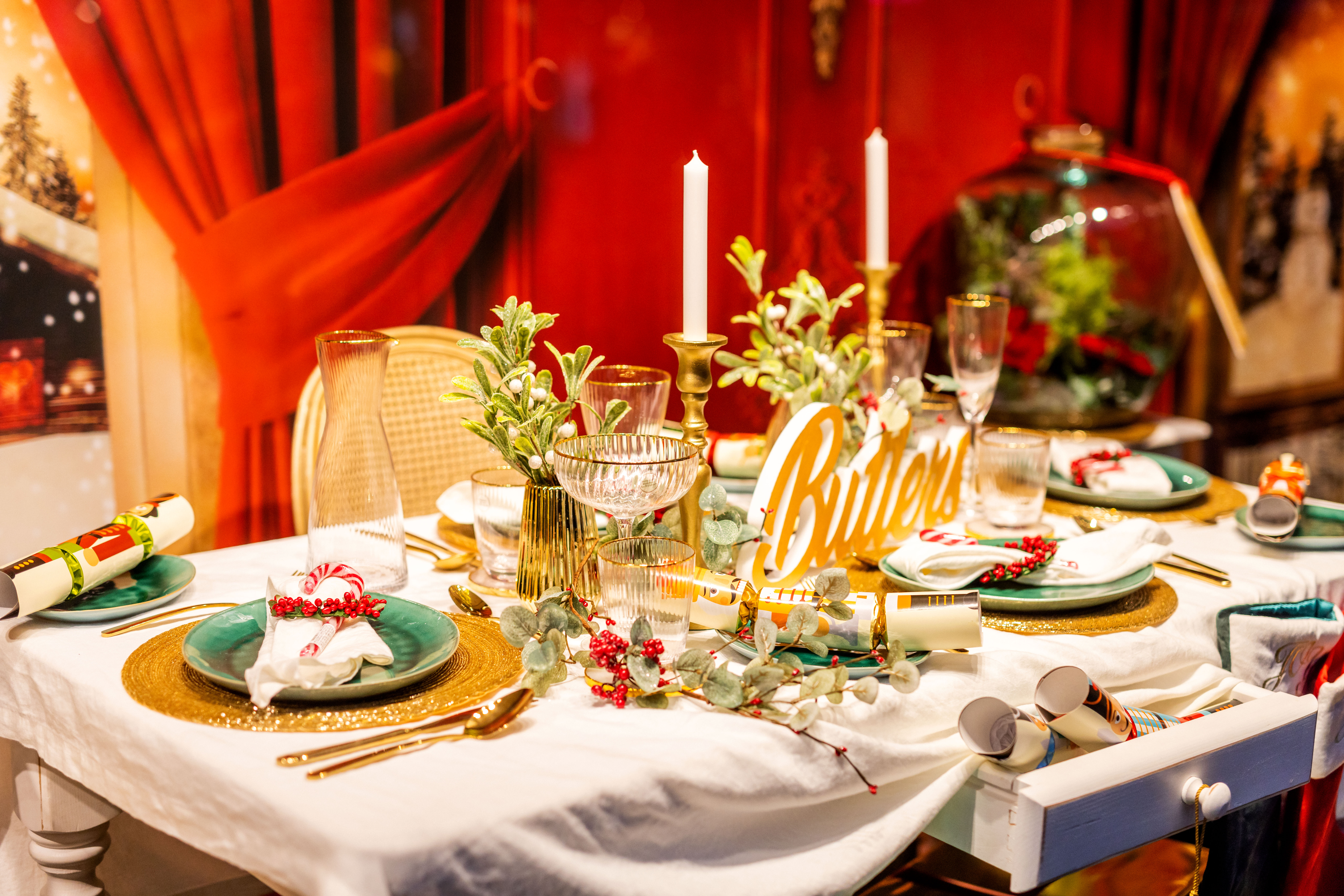 Das weihnachtliche Märchen ist in eine Szene mit roten Stuckwänden, hohen Flügelfenstern plus schweren Samtvorhängen, einem Kaminfeuer, Kandelaber und Kristallluster eingebettet. In einem traditionellen Rot-Grün-Gold-Farbkonzept aus üppigen Geschenksaufbauten, einem Christbaum samt ihn umkreisender Lokomotive steht ein lebensgroßer Nussknacker. Die bunte Warenwelt wird auf überdimensionalen Nüssen präsentiert, Kleidung führt - in Anlehnung an Tschaikowskis Version - ein Mäuseballett vor. Ein kleines Mädchen schaut verschmitzt zum Nussknacker hin, in einer riesigen Schneekugel wird das Kaufhaus selbst beschneit.