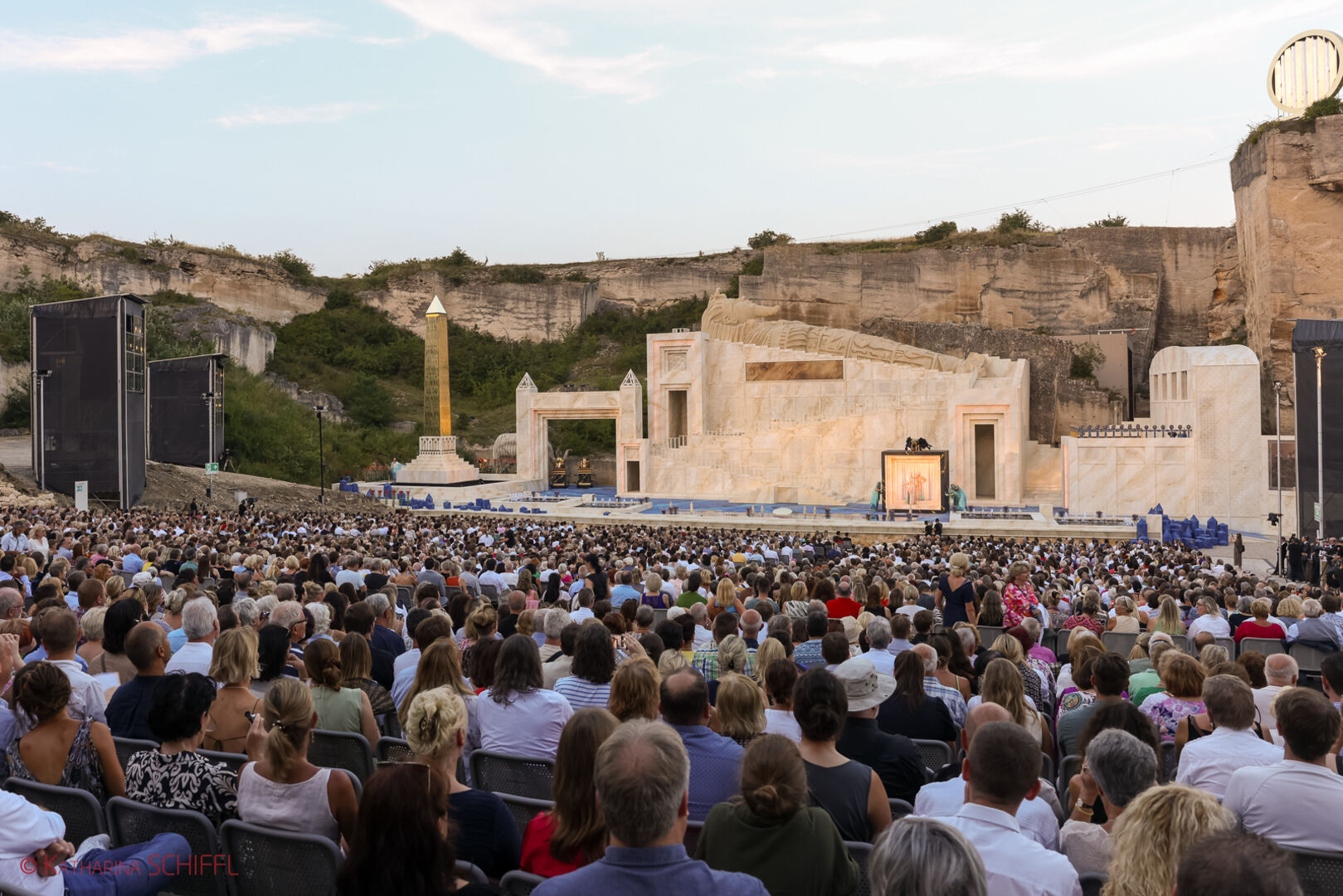 Die weltberühmte Oper steht noch bis zum 24. August 2024 auf dem Spielplan. Für die Inszenierung wurde der Veranstaltungsort aufwändig umgestaltet. Seit 2021 verantwortet das kreative Duo Thaddeus Strassberger und Giuseppe Palella die Produktion im Steinbruch.