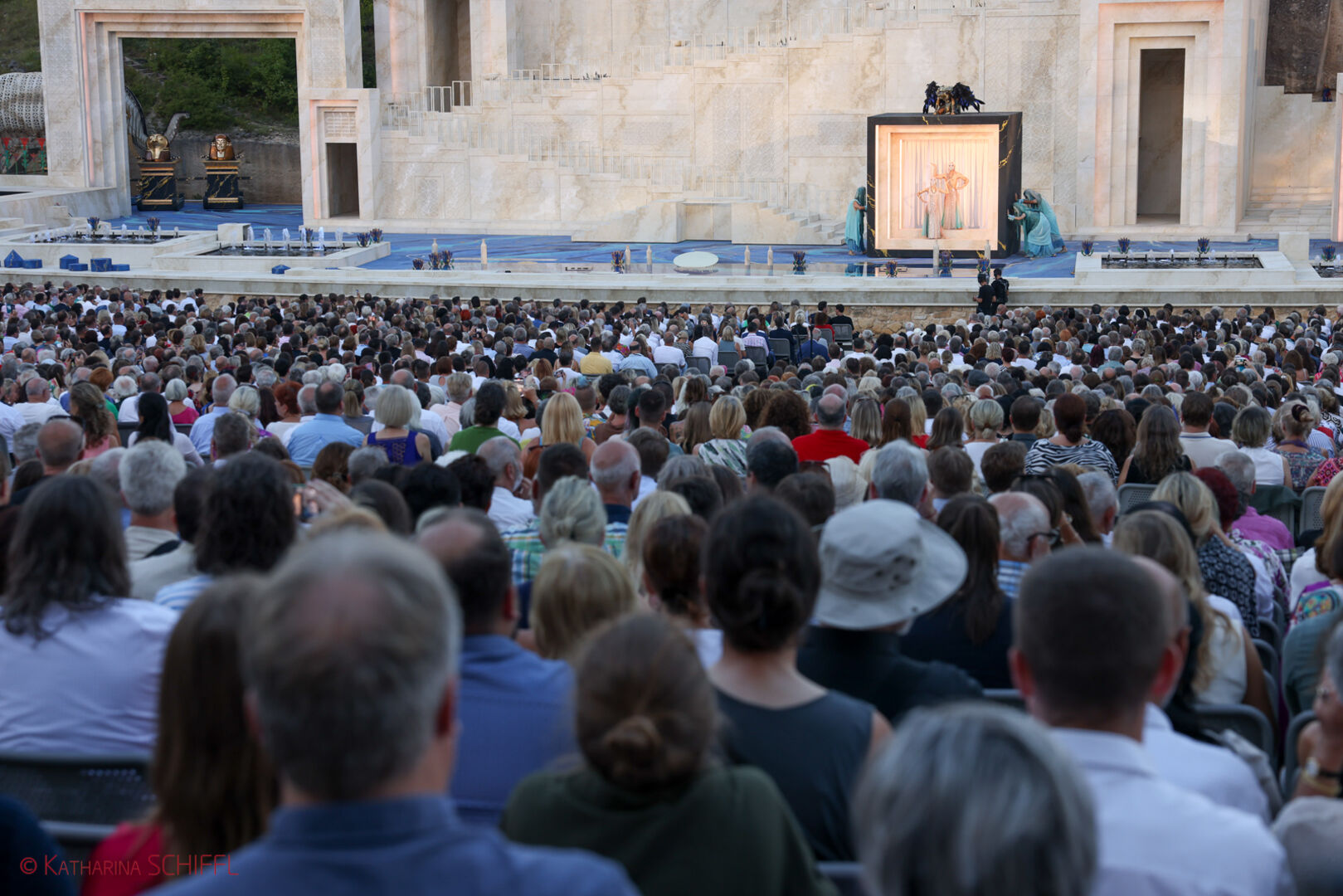 Mit seinen gewaltigen Ausmaßen thront das Pharaonengrab beeindruckend oberhalb der Tempelanlage. Ergänzt wird das spektakläre Setting durch raffinierte Choreografien, auffällige Videoprojektionen und die herausragende Performance der Darsteller und Darstellerinnen.