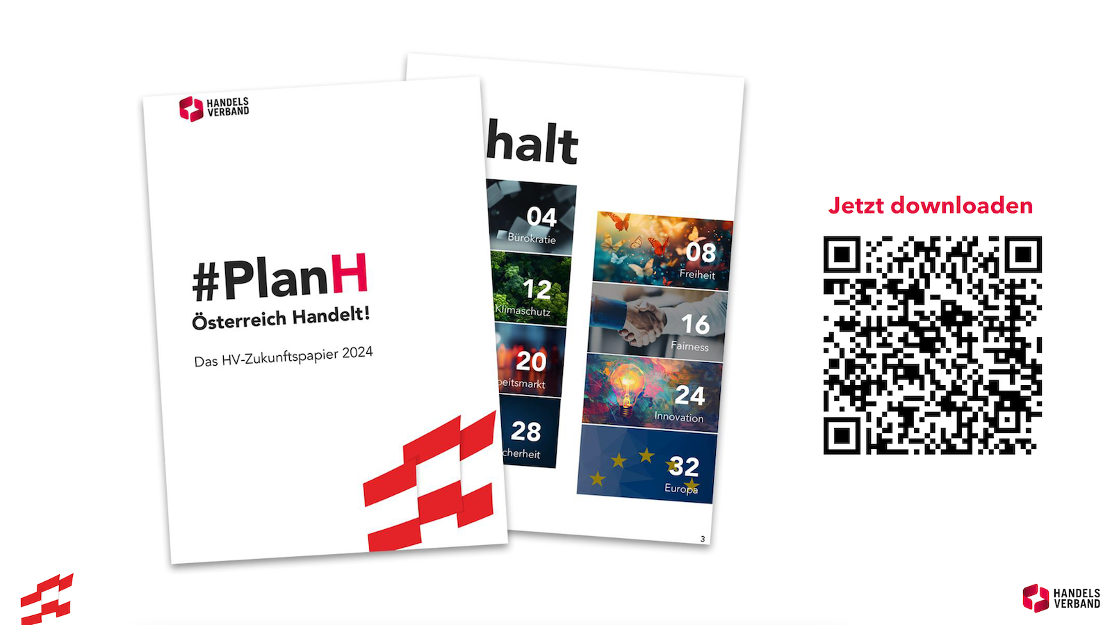 Der österreichische Handel befindet sich in einer entscheidenden Phase, in der eine Kurskorrektur zugunsten des Wirtschaftsstandorts notwendig ist, um den Wohlstand zu sichern. Zum "Plan H" mittels QR-Code: