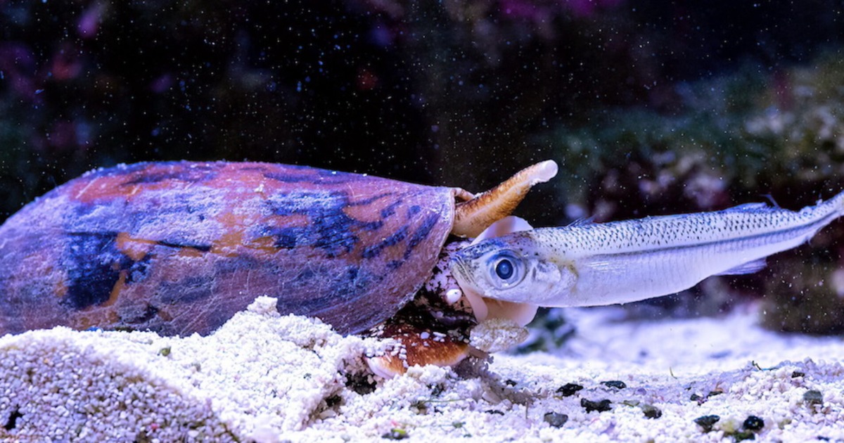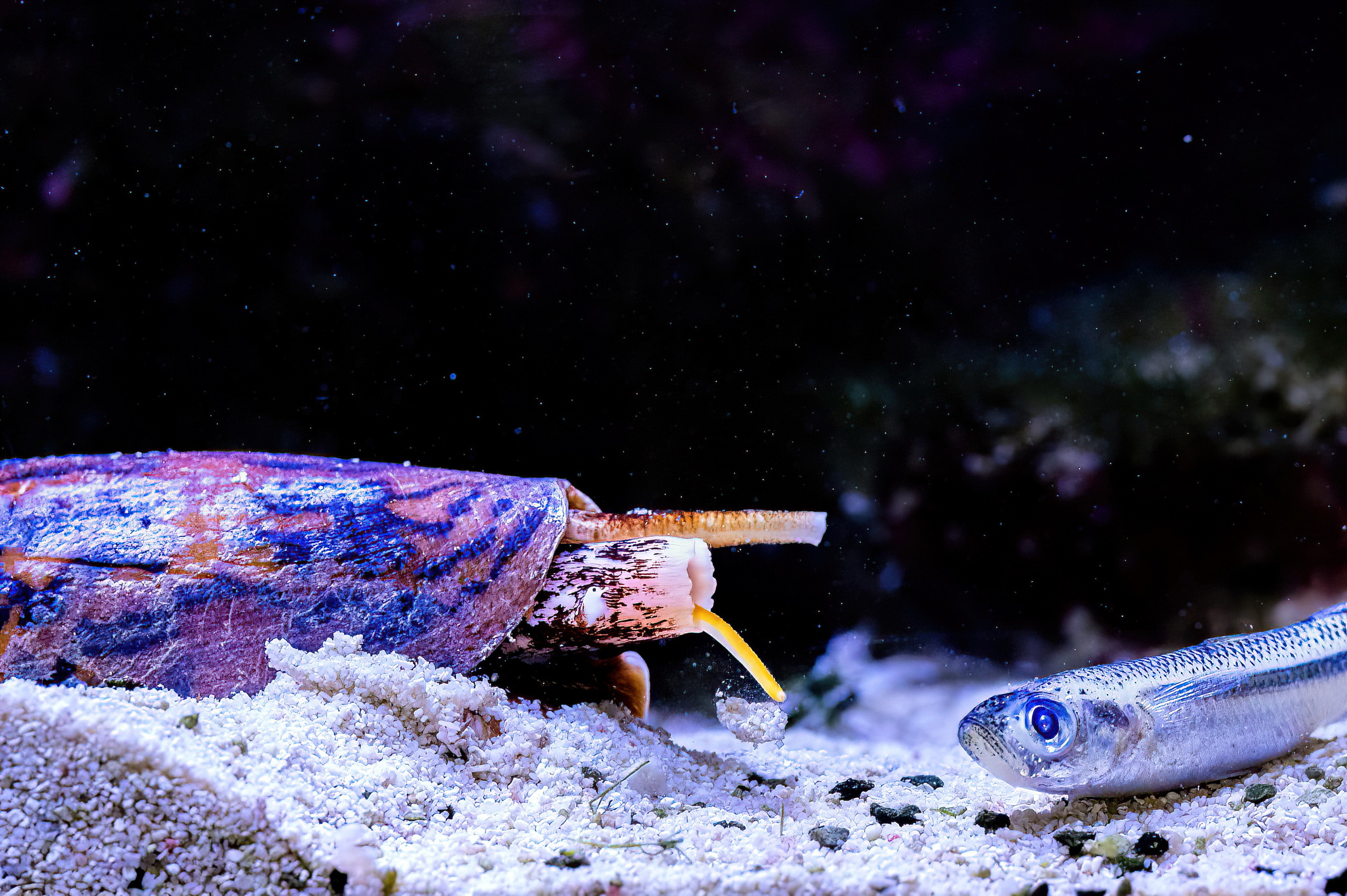 Mit der zehn Zentimeter langen Streifen-Kegelschnecke ist ein geschickter Jäger ins Haus des Meeres eingezogen. Um an ihre Leckerbissen zu kommen, greift die von Natur aus langsame Schnecke zu einer hoch effizienten Technik: So harpuniert sie mit einem Giftpfeil kleine Fische. Diese werden dadurch sofort gelähmt. Die Schnecke hat damit genügend Zeit, ihre Beute im Ganzen zu verschlucken.
