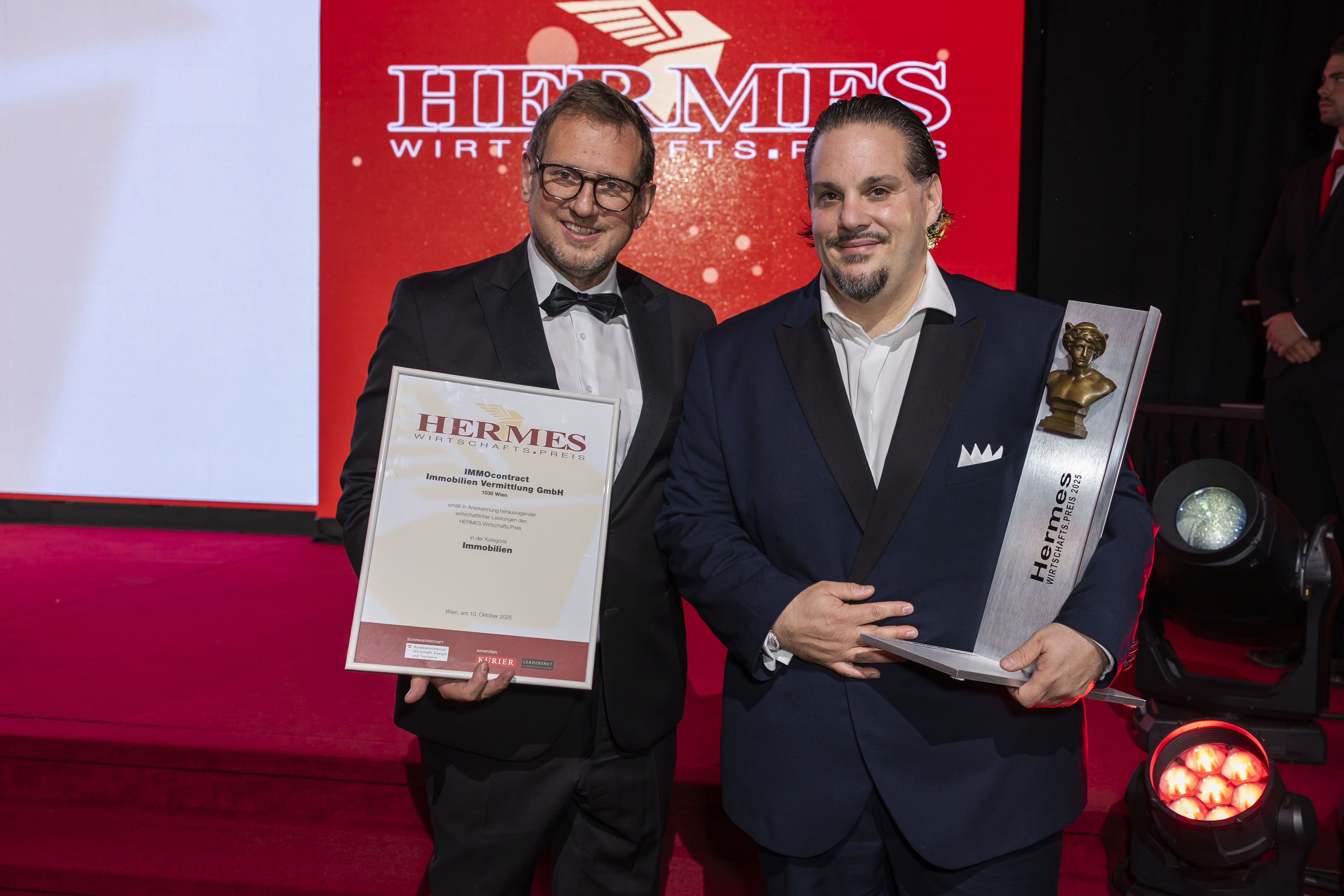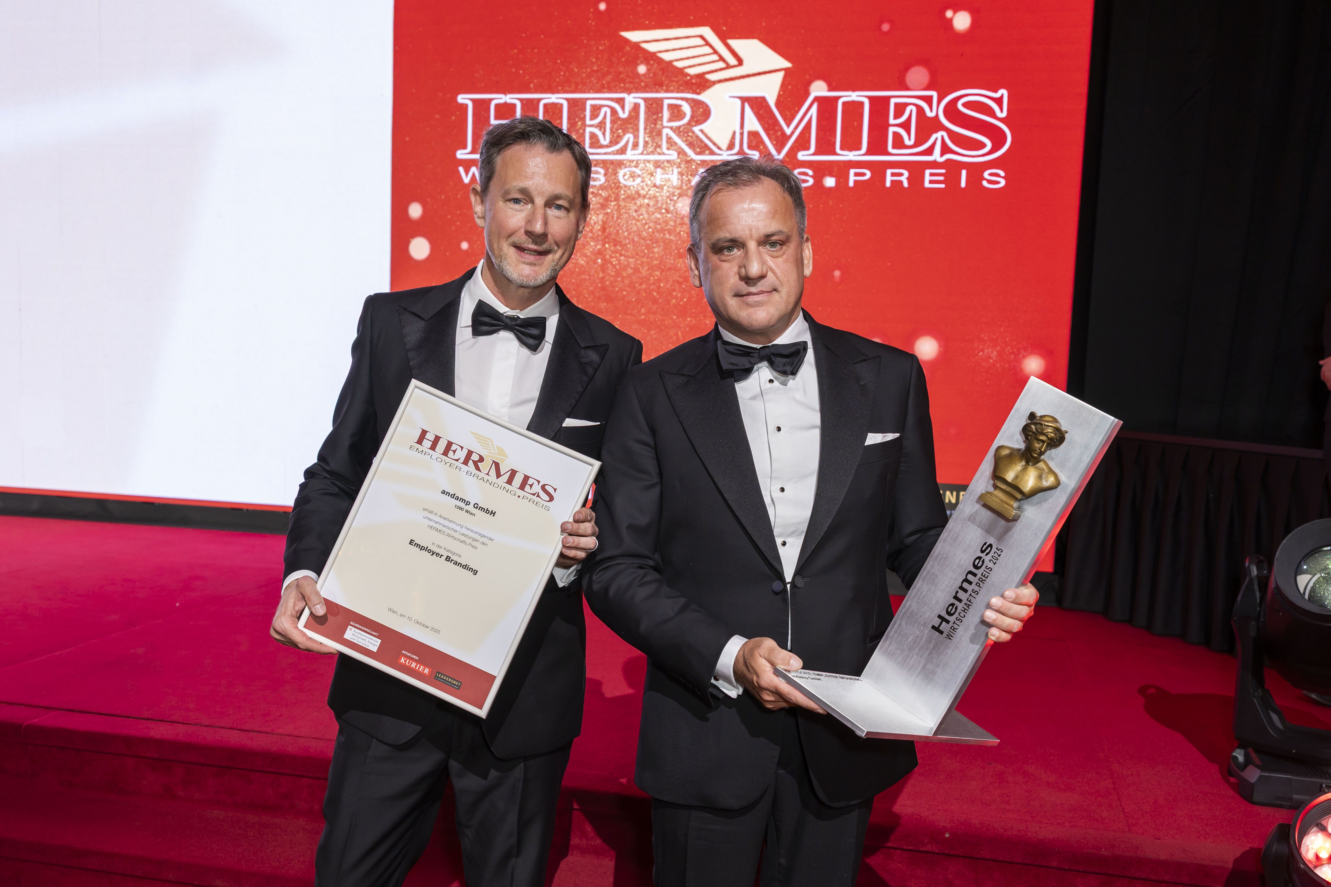 Feierlaune bei den zwölf glückliche Kategorie-Siegern auf der Bühne der Wiener Hofburg: Beim Hermes Wirtschaftspreis 2025 rückte die Leistungskraft der heimischen Wirtschaft ins Scheinwerferlicht. Denn trotz anhaltend angespannter Rahmenbedingungen zeigten Österreichs Klein- und Mittelbetriebe täglich Einsatz, um erfolgreich zu wirtschaften, Arbeitsplätze zu sichern und den Standort zu stärken. Durch den Abend führten Andi Knoll und Sandra Baierl, die die Vertreter der Top-Unternehmer des Abends auf der rot-weiß-roten Bühne begrüßten.