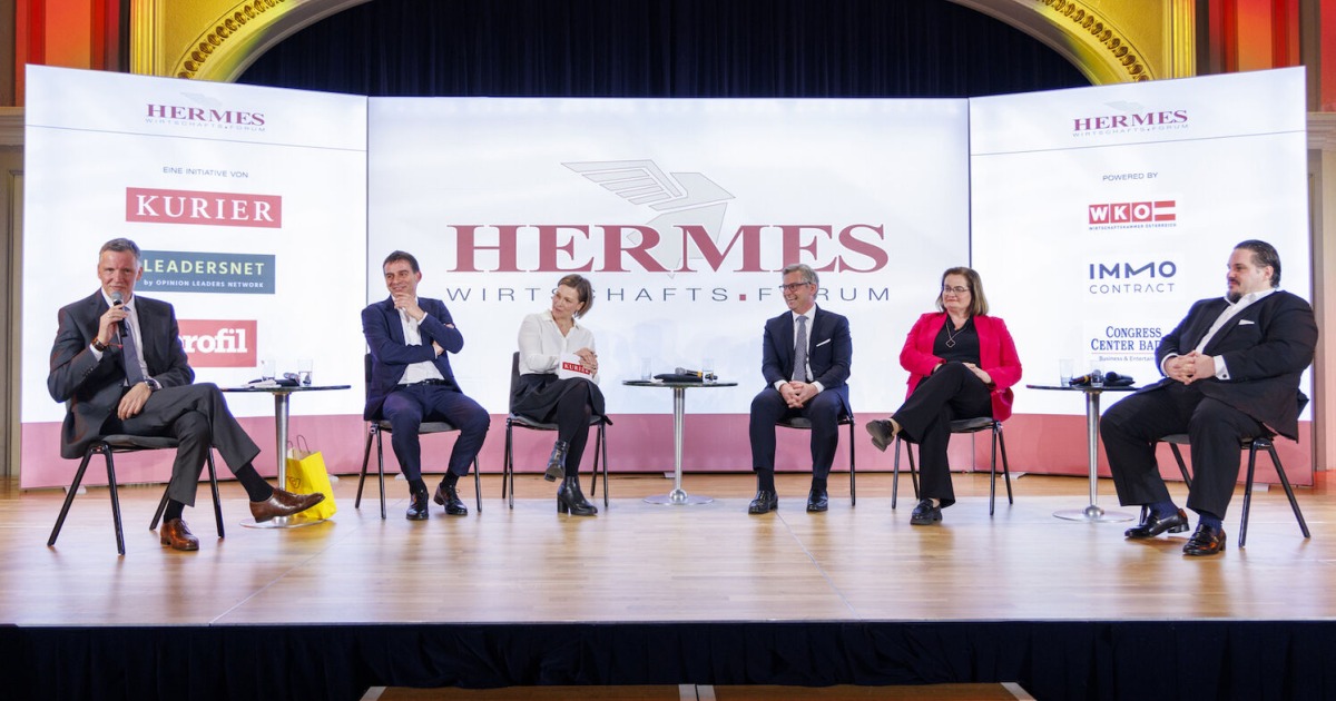 Das Hermes Wirtschafts.Forum ist ein von Gerhard Schlögel gegründetes unabhängiges Kommunikationsnetzwerk für Wirtschaft, Wissenschaft und Politik. Nicht nur die Themen im Forum sind brisant und top-aktuell, auch die Diskussionsteilnehmer am Podium sind ausgesuchte „Hochkaräter“. Deshalb war es auch kürzlich nicht verwunderlich, dass zum Thema „Wirtschaftsstandort Österreich“ im Congress Center Baden Finanzminister Magnus Brunner mit Anette Klinger (Eigentümerin Internorm), Peter Umundum (Vorstand Österr. Post), Sascha Haimovici (Geschäftsführer Immocontract) und Alexander Klacska (WKO Transport und Verkehr) am Podium Platz genommen hatten.