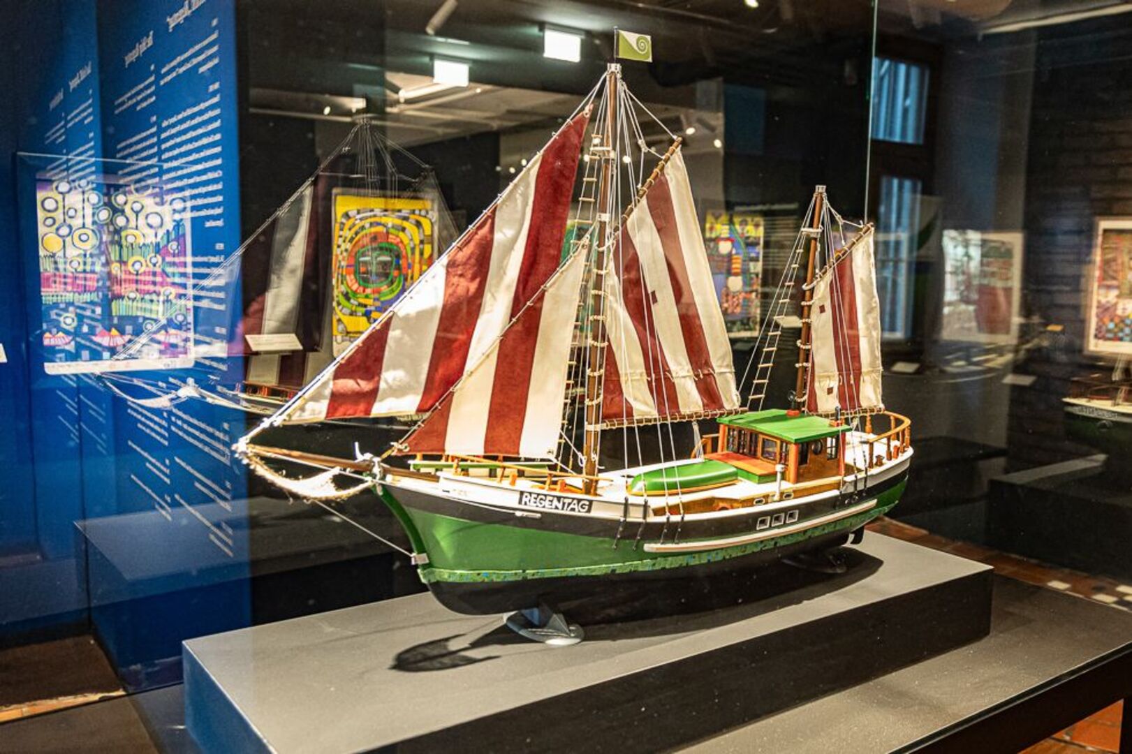 Die Schau bietet zudem Einblicke in Hundertwassers Wirken für hochaktuelle und für die Arbeit des Kunst Haus Wien essenzielle Anliegen: für einen Friedensschluss zwischen Mensch und Natur, für ein menschen- und naturgerechteres Bauen sowie für weltweiten Frieden. Ein Highlight der Ausstellung ist das neue Modell der „Regentag“ – dem Schiff Hundertwassers, das vom Museum eigens für die Schau in Auftrag gegeben wurde.