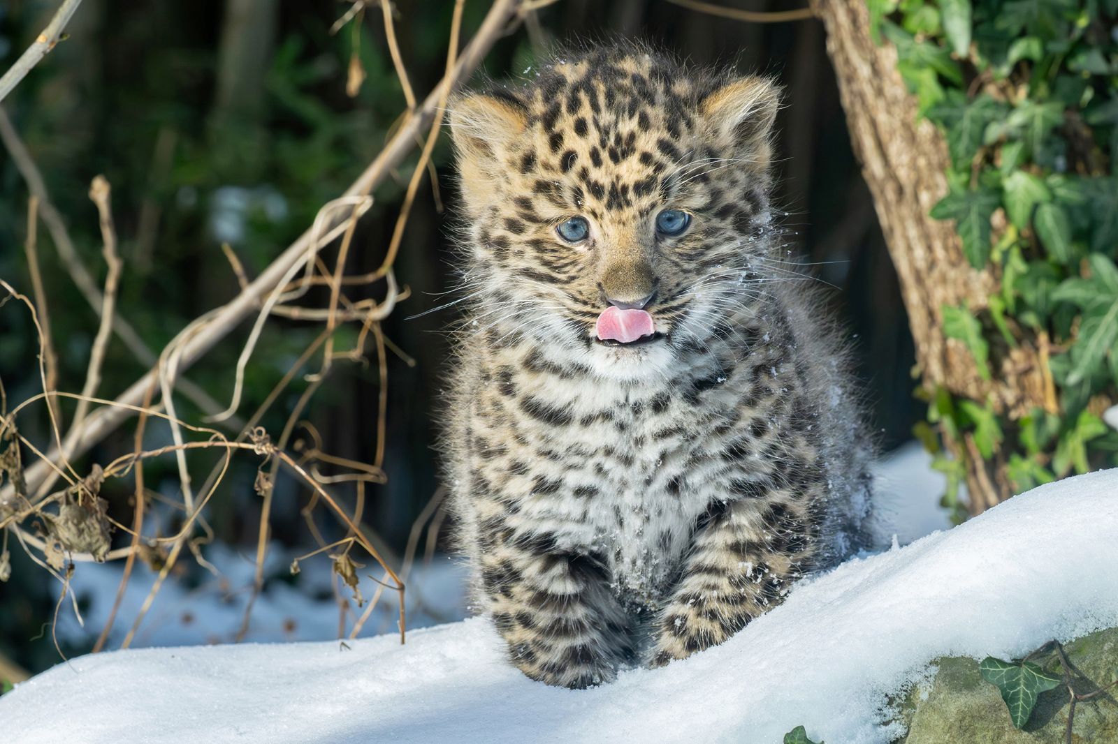 „Der kleine männliche Leopard wurde Anfang November in einer Wurfhöhle geboren. In dieser hat das Jungtier gut versteckt die ersten Lebenswochen verbracht. Denn wie alle Großkatzen sind Amurleoparden Nesthocker. Die Jungtiere kommen blind zur Welt und müssen erst entsprechend wachsen und sich weiterentwickeln“, erklärt Tiergartendirektor Dr. Stephan Hering-Hagenbeck.
