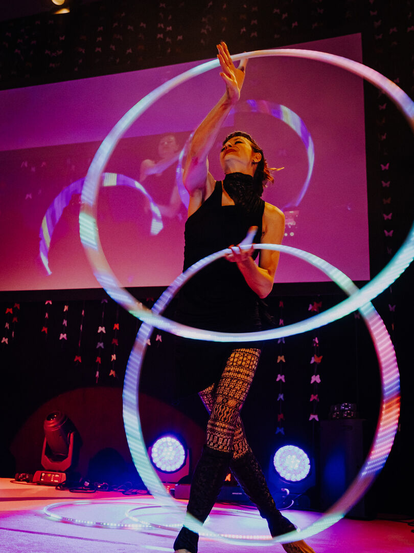 Auf der Showbühne ging es nicht minder bunt zu. Schuhplatter performten zu karibischen Klängen, Beatboxing traf auf Blasmusik, Akrobatik auf akustische Schmankerl. Applaus gab es auch für die stimmgewaltigen Ladies Conchita, Virgina Ernst und Drag Queen Tamara Mascara. Mit dabei war auch Geigerin Celine Roschek.