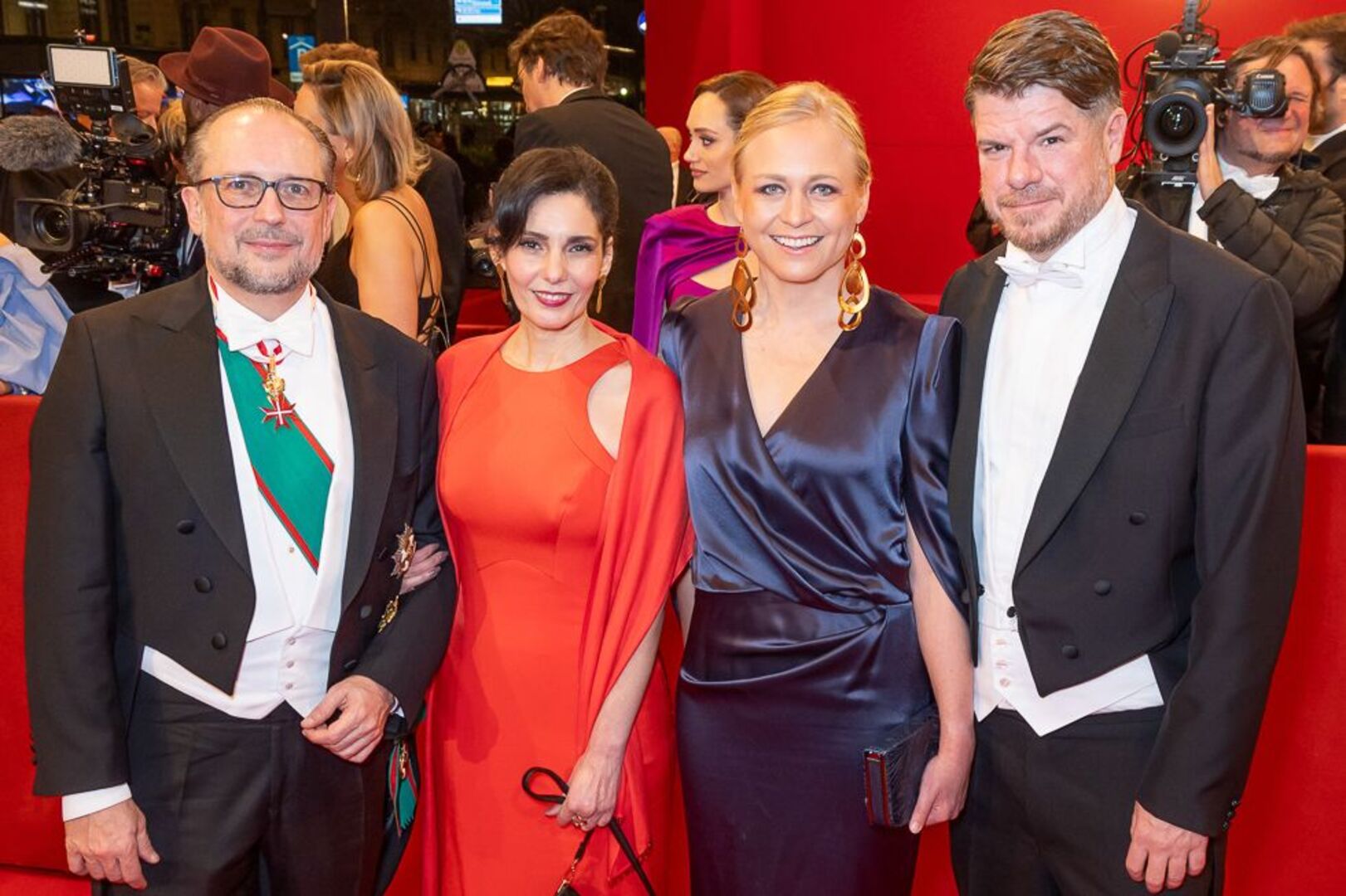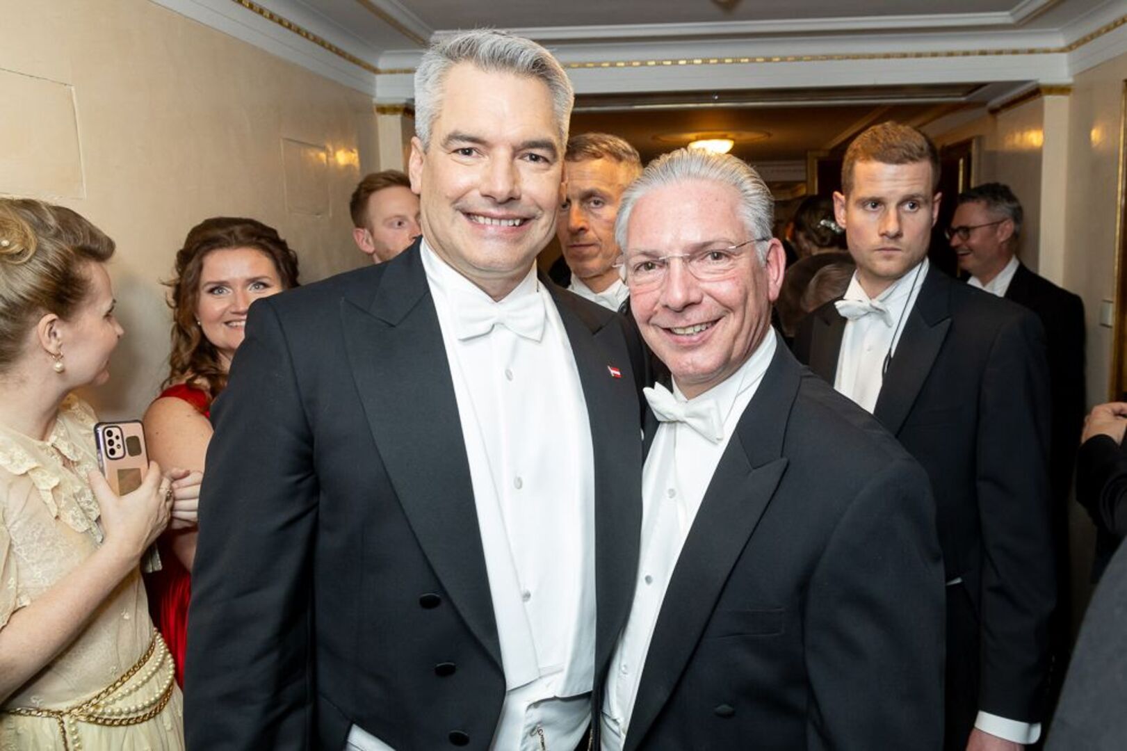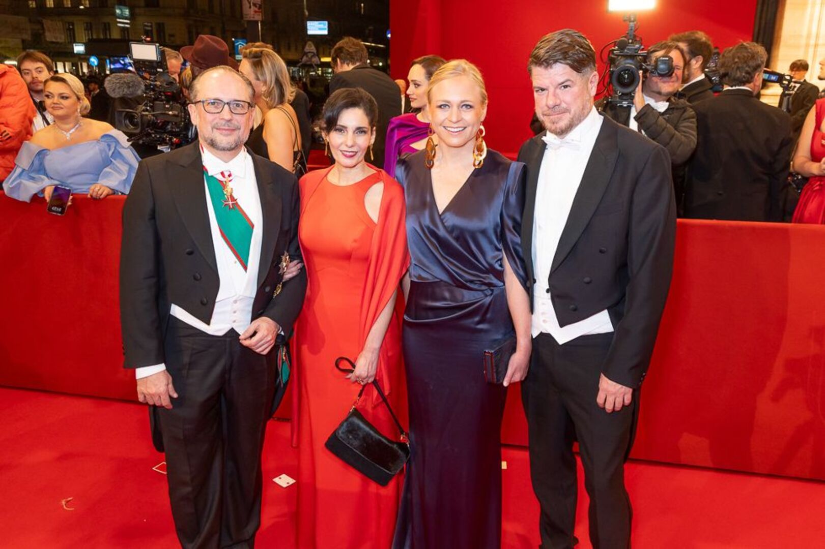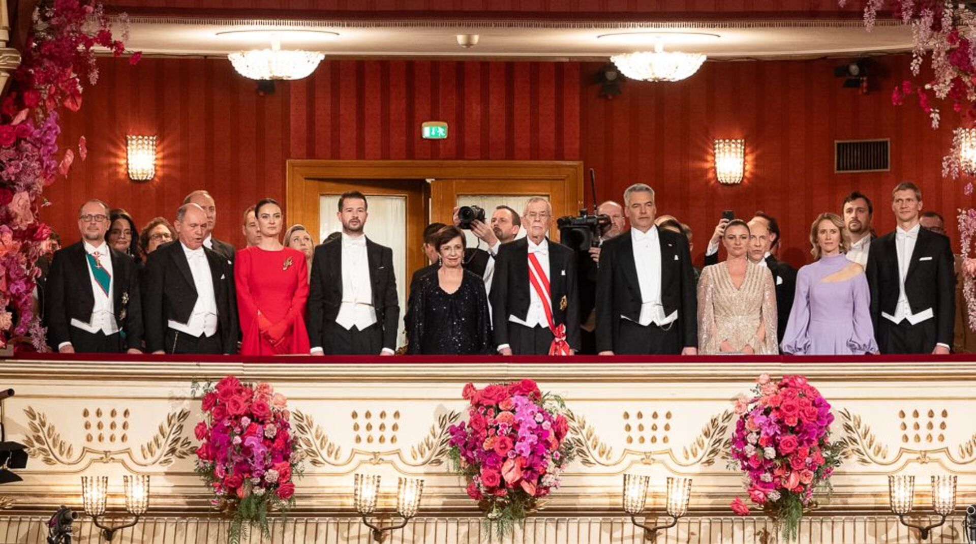 Mitten unterm Blitzlichtgewitter war einmal mehr Bundespräsident Alexander Van der Bellen mit seiner Gattin Doris Schmidauer. Begleitet wurde das First Couple vom montenegrinischen Präsidenten Jakov Milatovic. Auch Bundeskanzler Karl Nehammer kam mit Polit-Begleitung: Er hatte die estnischen Regierungschefin Kaja Kallas zum Staatsball eingeladen. Außenminister Alexander Schallenberg wurde von seiner finnischen Amtskollegin Elina Valtonen begleitet.
