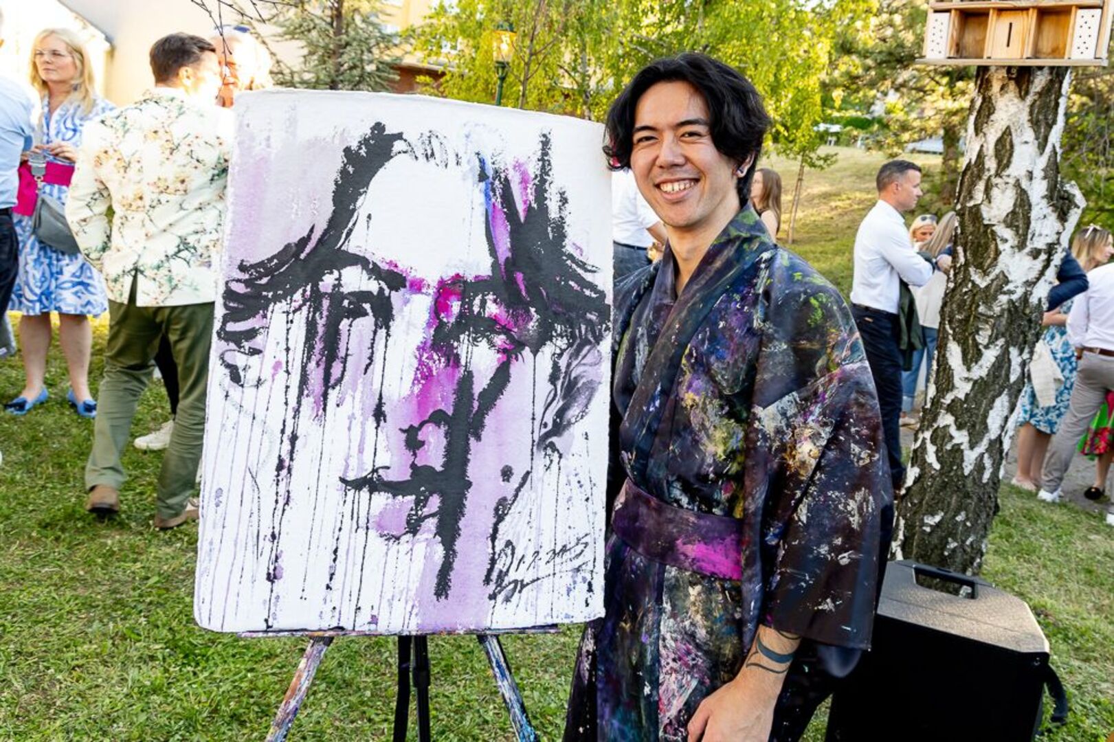 Ein weiteres Highlight war die Perfomance des zeitgenössischen japanischen Künstlers Hirooki Hatori, der für seine ausdrucksstarken Porträts und seinen experimentellen Umgang mit Farbe bekannt ist. Hatori überraschte die Gäste mit spontan angefertigten Werken im Kleinformat sowie einem Bild, das live vor Ort gemalt und auch versteigert wurde.