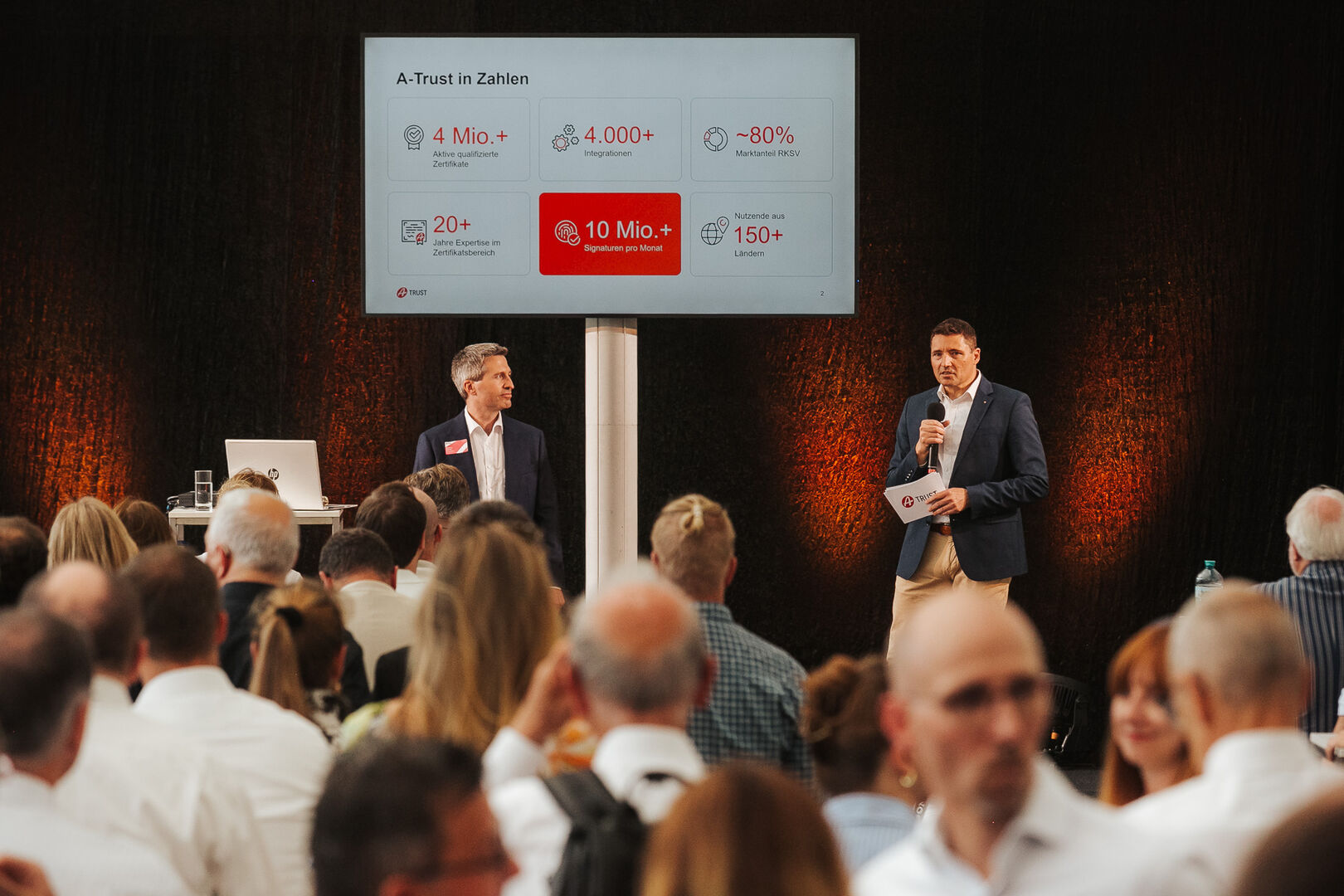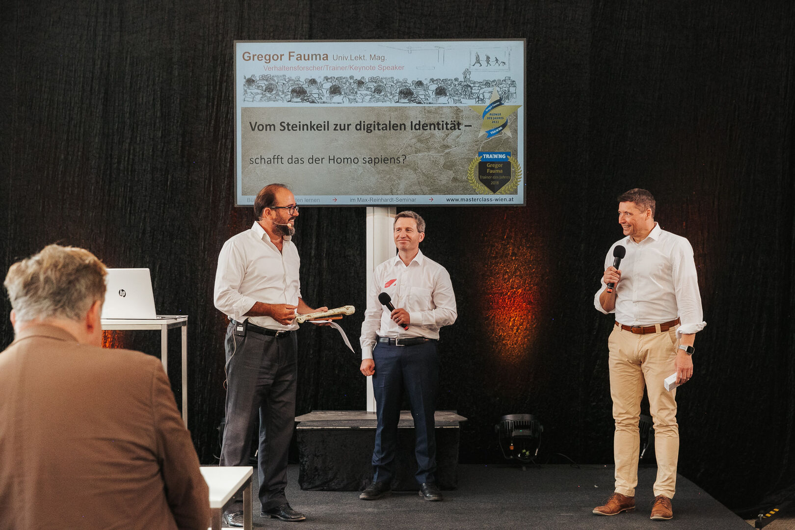 Sie begrüßten den Redner des Jahres 2022, Gregor Fauma, auf der Bühne. Seine Keynote drehte sich um das spannende Thema „Vom Steinkeil zur digitalen Identität – schafft das der Homo Sapiens?“.