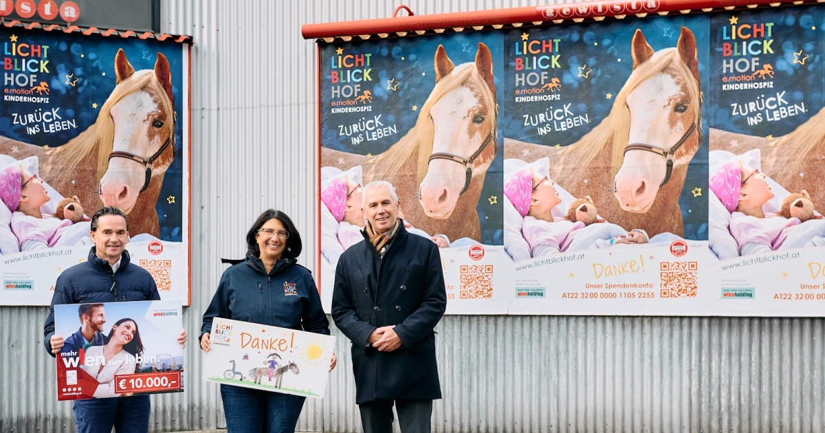 Der Lichtblickhof bietet palliative Begleitung und Entlastungsaufenthalte für unheilbar erkrankte Kinder und ihre Familien an. Speziell ausgebildete Therapietiere schenken hier auch in schwersten Zeiten Glücksmomente, Lichtblicke und besondere Erlebnisse. Die Wien Holding unterstützt diese Kampagne mit einer Spende in Höhe von 10.000 Euro, die Plakatierung wird von der Gewista kostenfrei durchgeführt. Dr. Kurt Gollowitzer und Mag. Oliver Stribl, Geschäftsführer der Wien Holding: