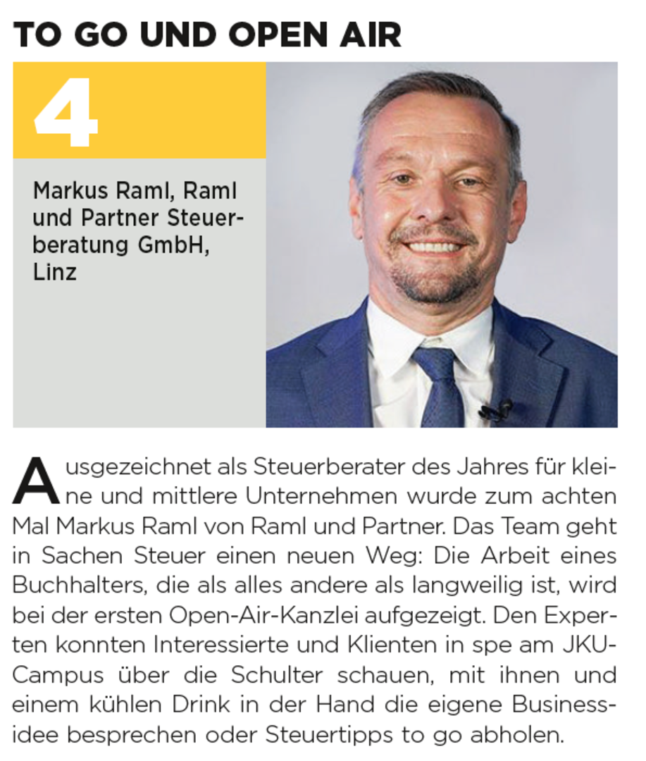 Steuerberater leisten wertvolle Arbeit, bleiben dabei selbst aber meist im Hintergrund. Vor den Vorhang trat heuer Stefan Bendlinger. Er wurde zum „Steuerberater des Jahres“ in der Kategorie „Private Clients“ gekürt. Akademische Wissenstiefe, jahrzehntelange Erfahrung, intensiver Praxisbezug und überragendes Experten-Know-how überzeugten die Jury. „Jede Auszeichnung ist ein Auftrag: Freuen, dann wieder zurück in die Zukunft“, so Bendlinger. ICON-Gründer Karl Mitterlehner: „Wir sehen derartige Awards als Gradmesser für Qualität und Marktführerschaft. Das Ergebnis bestätigt unseren Weg, aber wird sind zeitgleich auch schon wieder unterwegs in eine innovative Zukunft mit neuen, spannenden Lösungen.“