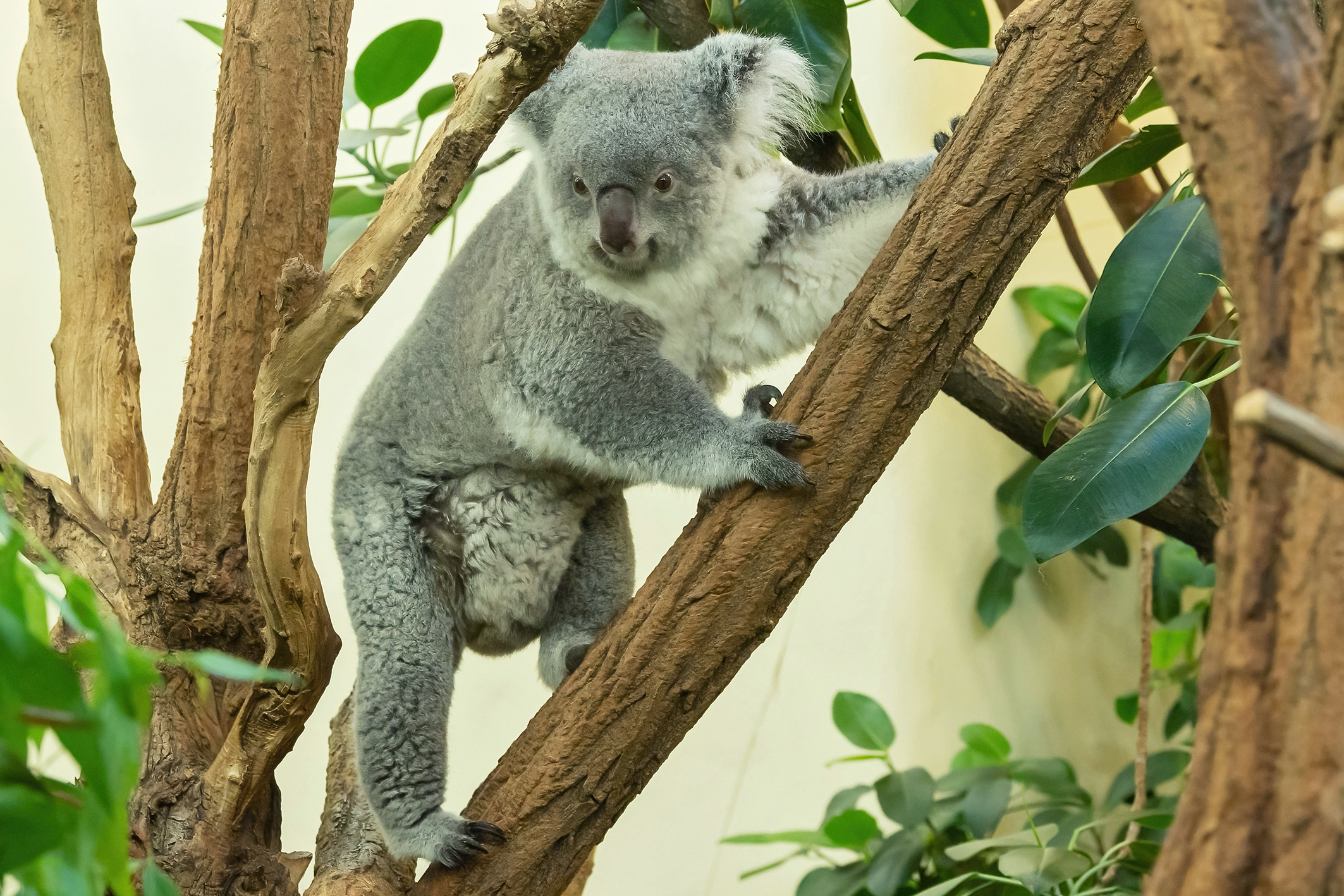 Besucher des Tiergartens müssen ganz genau hinsehen, um ein kleines bisschen vom Koala-Baby zu sehen. Denn aktuell fühlt es sich noch sehr wohl bei Mama. Die Entwicklung im Beutel dauert bis zu sechs Monate, mit etwa 22 Wochen öffnet das Jungtier dann erst seine Augen. Das Geschlecht kann erst zu einem späteren Zeitpunkt festgestellt werden. Ab und zu kann man jedoch einen Blick auf ein kleines Füßchen oder eine Hand erhaschen, die aus dem Beutel winkt, als wolle es sagen: „Hallo Welt, ich komme gleich!“
