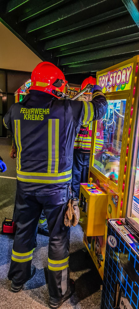Kurz nach 22 Uhr wurden die Einsatzkräfte von Feuerwehr Krems und Rettungsdienst in das Kremser Cinemaplexx gerufen. Das Mädchen steckte in der Ausgabeklappe des Automaten fest und konnte sich weder vorwärts noch zurückbewegen. Das Mädchen bleib trotz der misslichen Lage aber ruhig und gefasst. Mit dem Halligan-Tool, einer speziellen Art eines Brecheisens, öffneten die Feuerwehrmänner die Türe des Automaten. Mit wenigen Handgriffen wurde das Mädchen aus dem Gefängnis befreit und konnte den Eltern übergeben werden.
