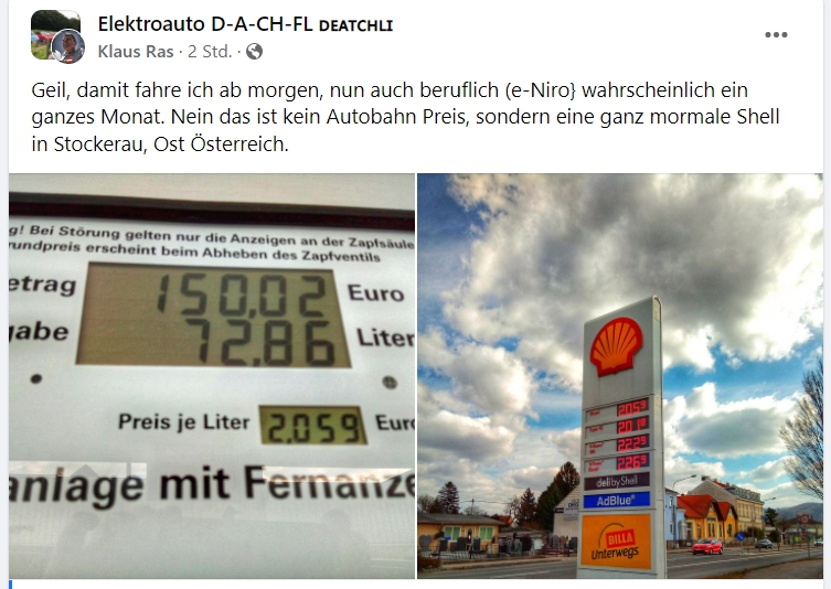 Wie hier User Klaus Ras in einer E-Auto Gruppe auf Facebook berichtet, hat er heute in der Nähe von Stockerau für 2,059 Euro pro Liter getankt. Für 72,86 Liter Diesel wurden damit sagenhafte 150,02 Euro fällig. Aber auch User auf Twitter nehmen die aktuelle Situation eher mit Galgenhumor: