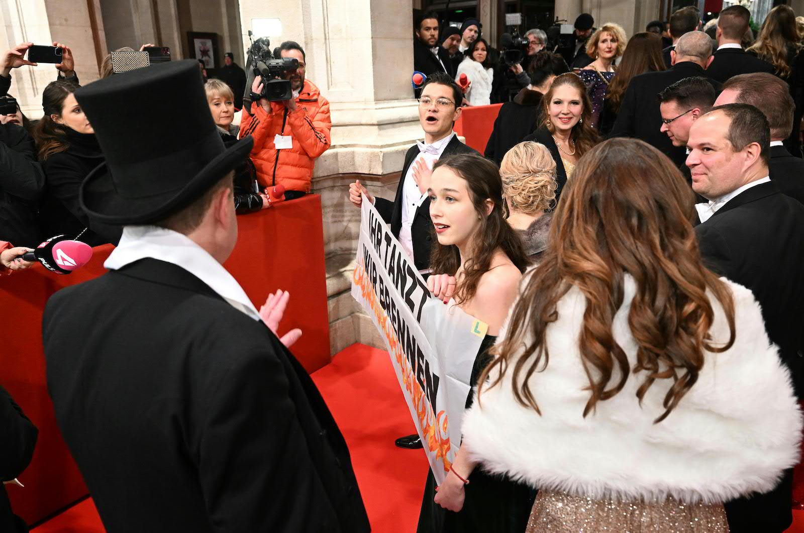 Großes Thema am Ball war auch die Klimakrise. Auf dem roten Teppich vor der Staatsoper entrollten die Klima-Aktivisten Lena Schilling und Daniel Shams ein Transparent mit der Aufschrift "Ihr tanzt, wir brennen". Schilling und Shams wiesen nach eigenen Angaben "auf die übergroße Schuld der Reichen und Mächtigen an der Klimakrise" hin.