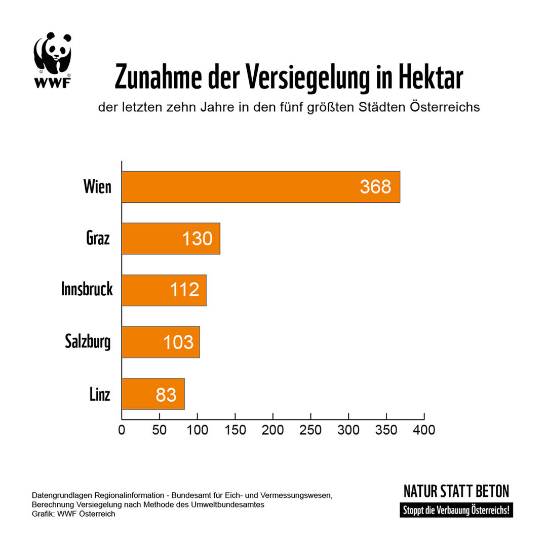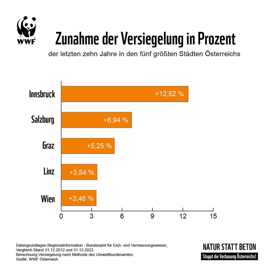 Während der letzten zehn Jahre verzeichnete Innsbruck den größten Anstieg der versiegelten Fläche um 12,5 Prozent. Dies wird gefolgt von Salzburg, Graz, Linz und Wien. Trotzdem hat Wien in absoluten Zahlen mit 368 Hektar den größten Flächenzuwachs an versiegeltem Land. Angesichts dieser Entwicklungen ist der Handlungsbedarf für den WWF evident. Straßen und Parkplätze nehmen die meiste Fläche ein. Pories fordert eine schrittweise Reduzierung und die Wiederherstellung zerstörter Lebensräume, wie es auch die EU-Biodiversitätsstrategie 2030 und das geplante EU-Renaturierungsgesetz vorsehen.