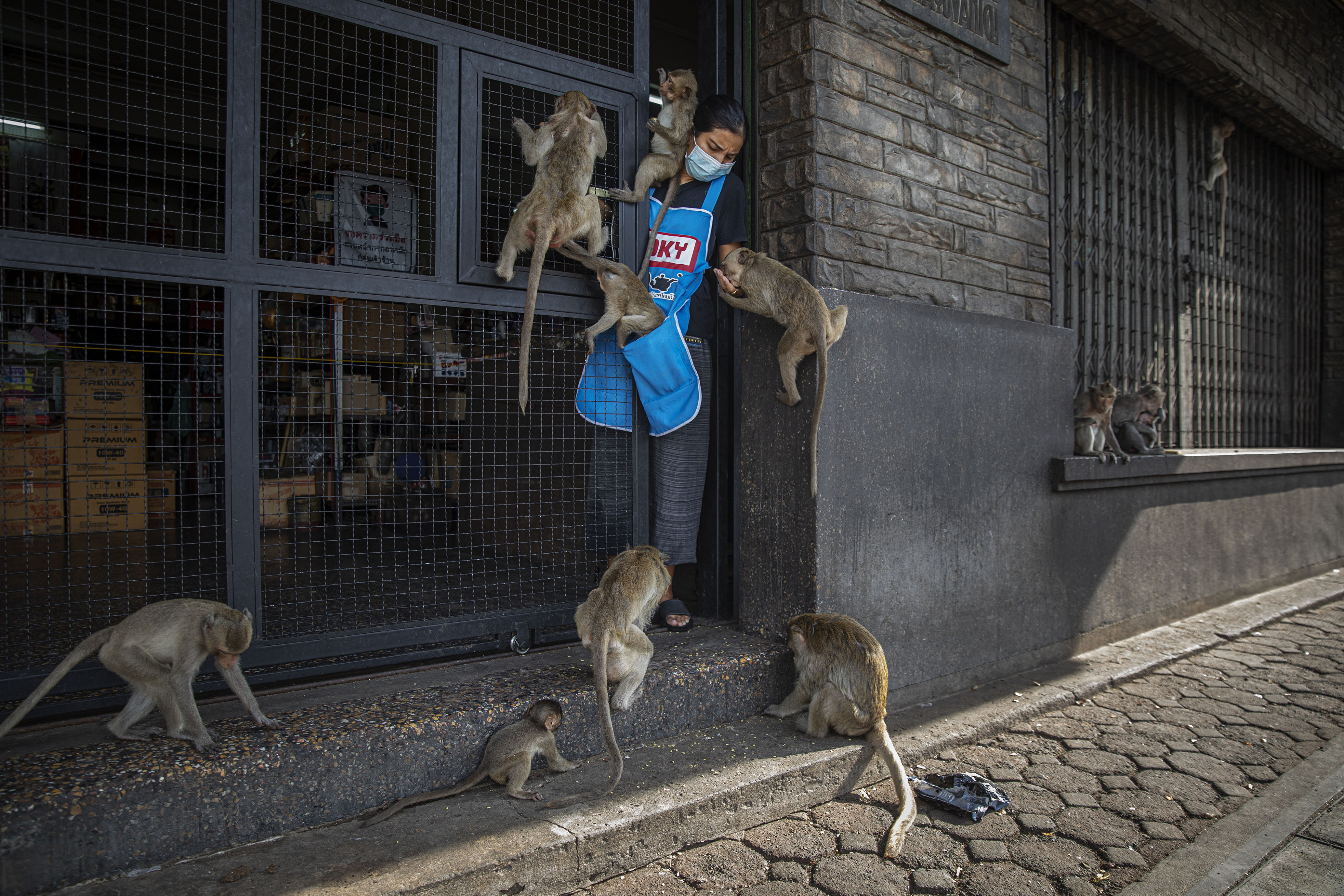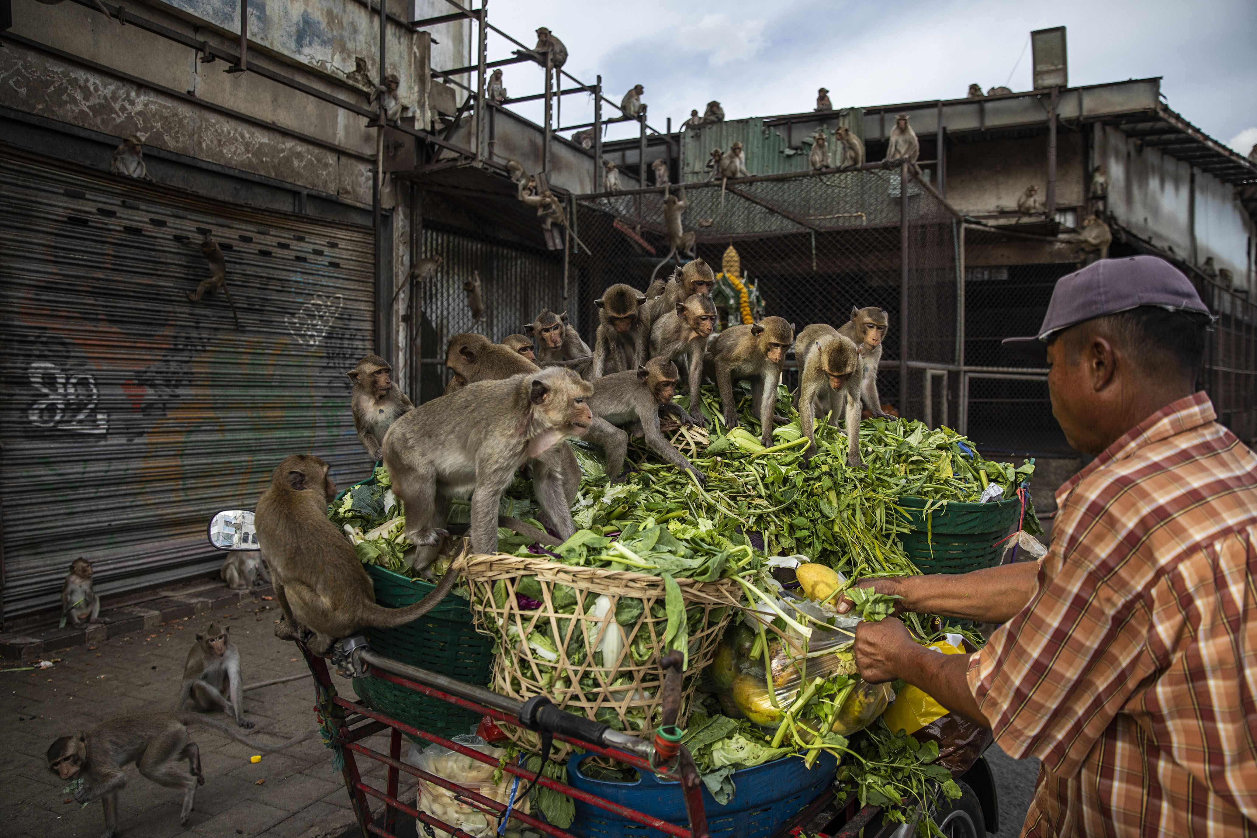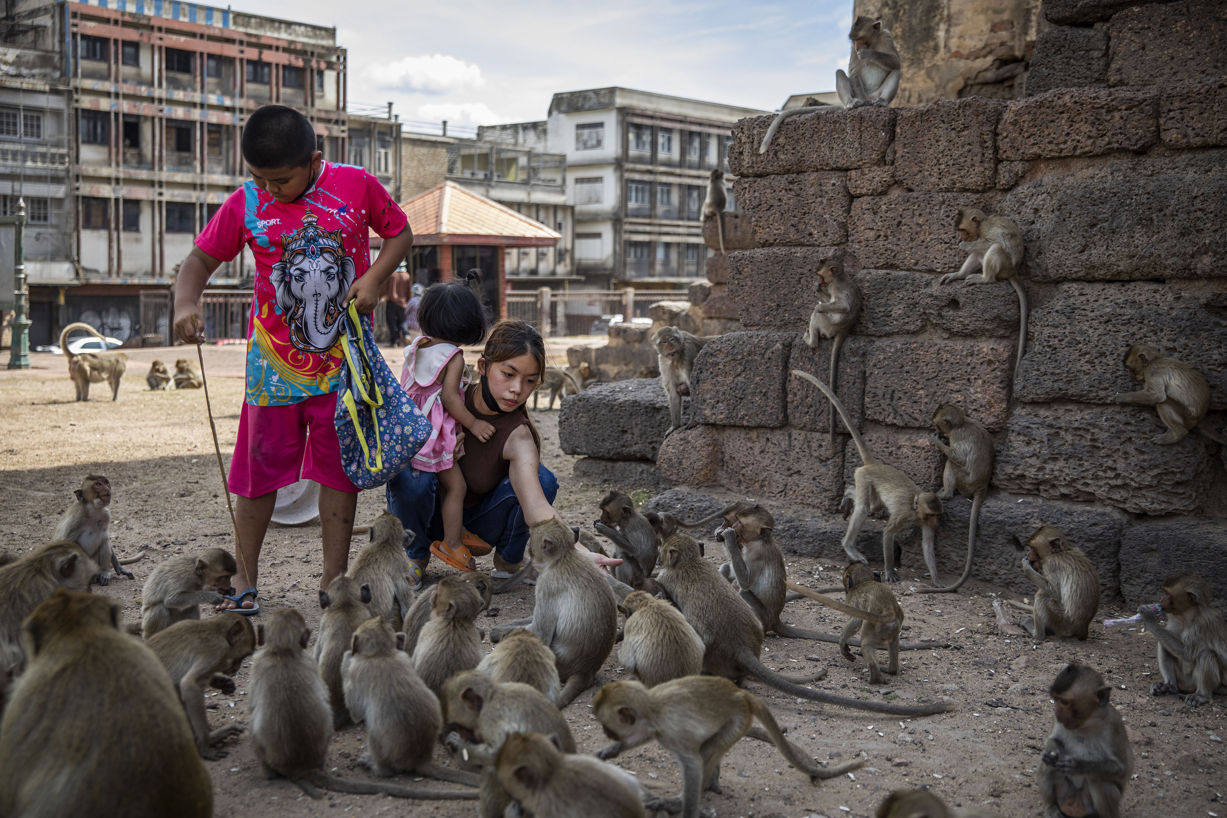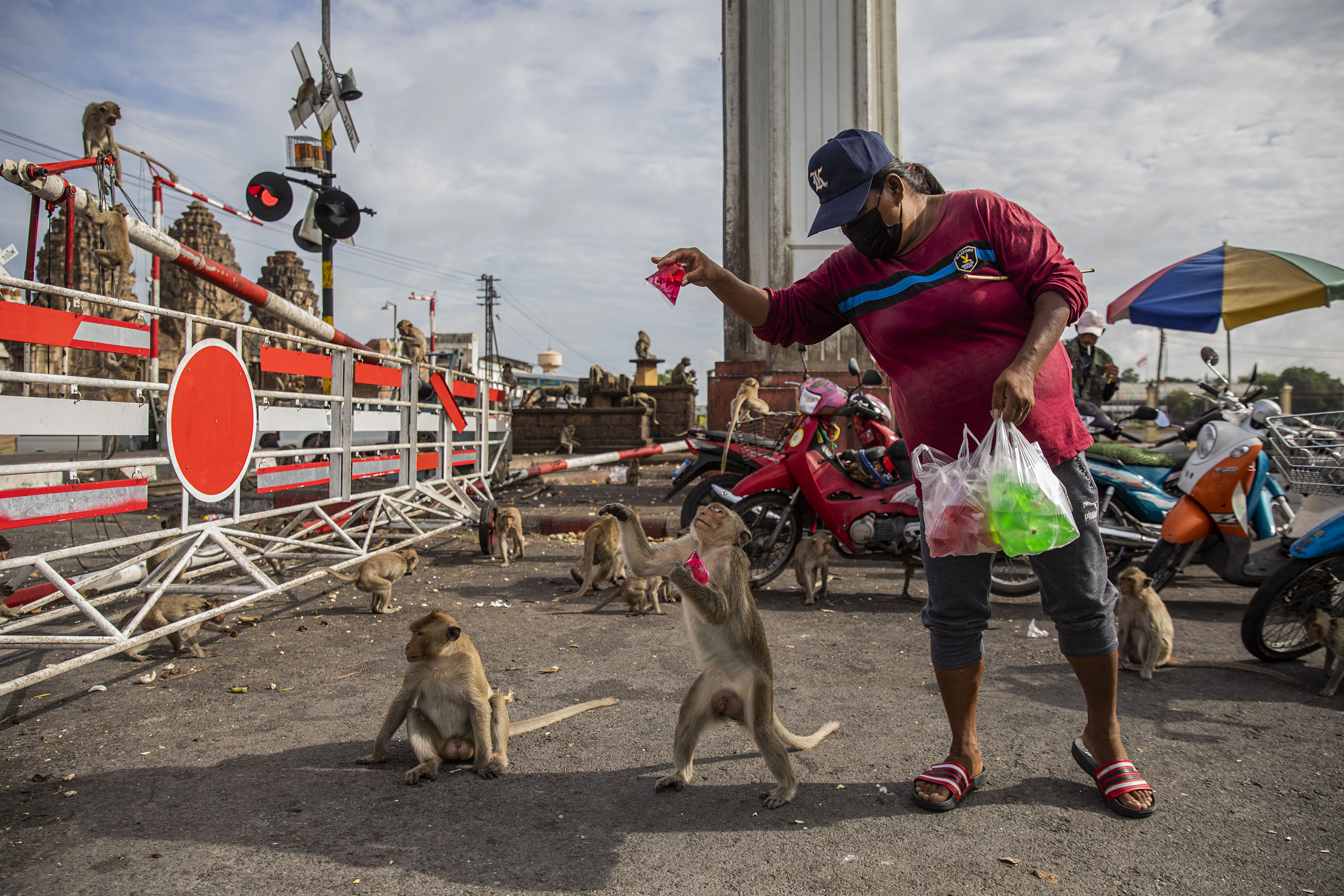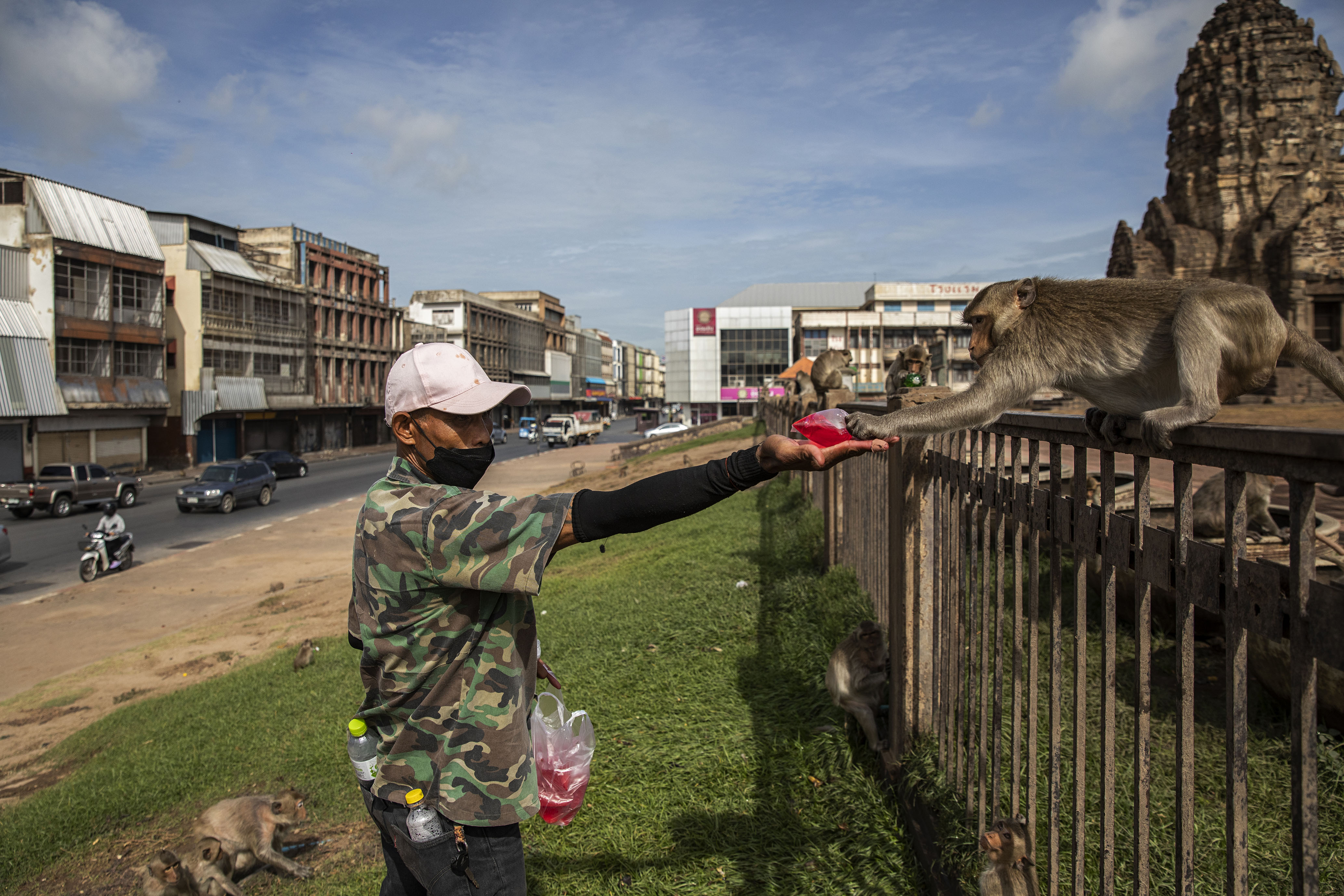 Seit das Virus auf der Welt grassiert, kommen kaum mehr Touristen mehr nach Lopburi. Und Urlauber waren gern gesehene Gäste für die dort in den antiken Tempeln lebenden Langschwanzmakaken, weil sie von ihnen immer schön brav gefüttert wurden.