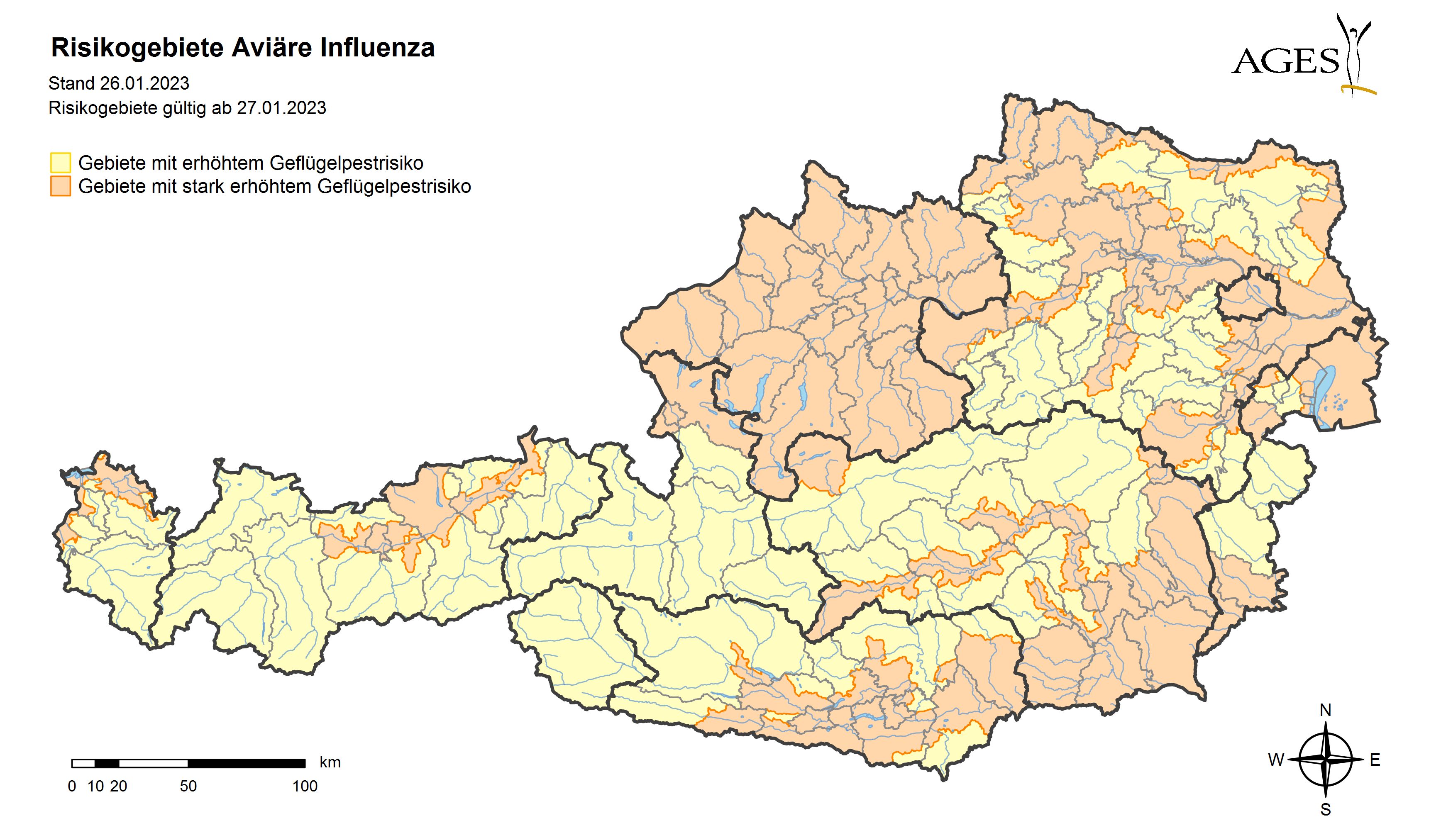 Um das Risiko weiterer Übertragungen auf Geflügelbestände zu minimieren, werden daher mit 27. Jänner die „Gebiete mit stark erhöhtem Geflügelpestrisiko“ in Österreich ausgeweitet. Die Bundesländer Oberösterreich und Wien gelten flächendeckend als solche Risikogebiete. Auf der Karte der AGES ist zu sehen, welche anderen Teile Österreichs ebenfalls stark betroffen sind.