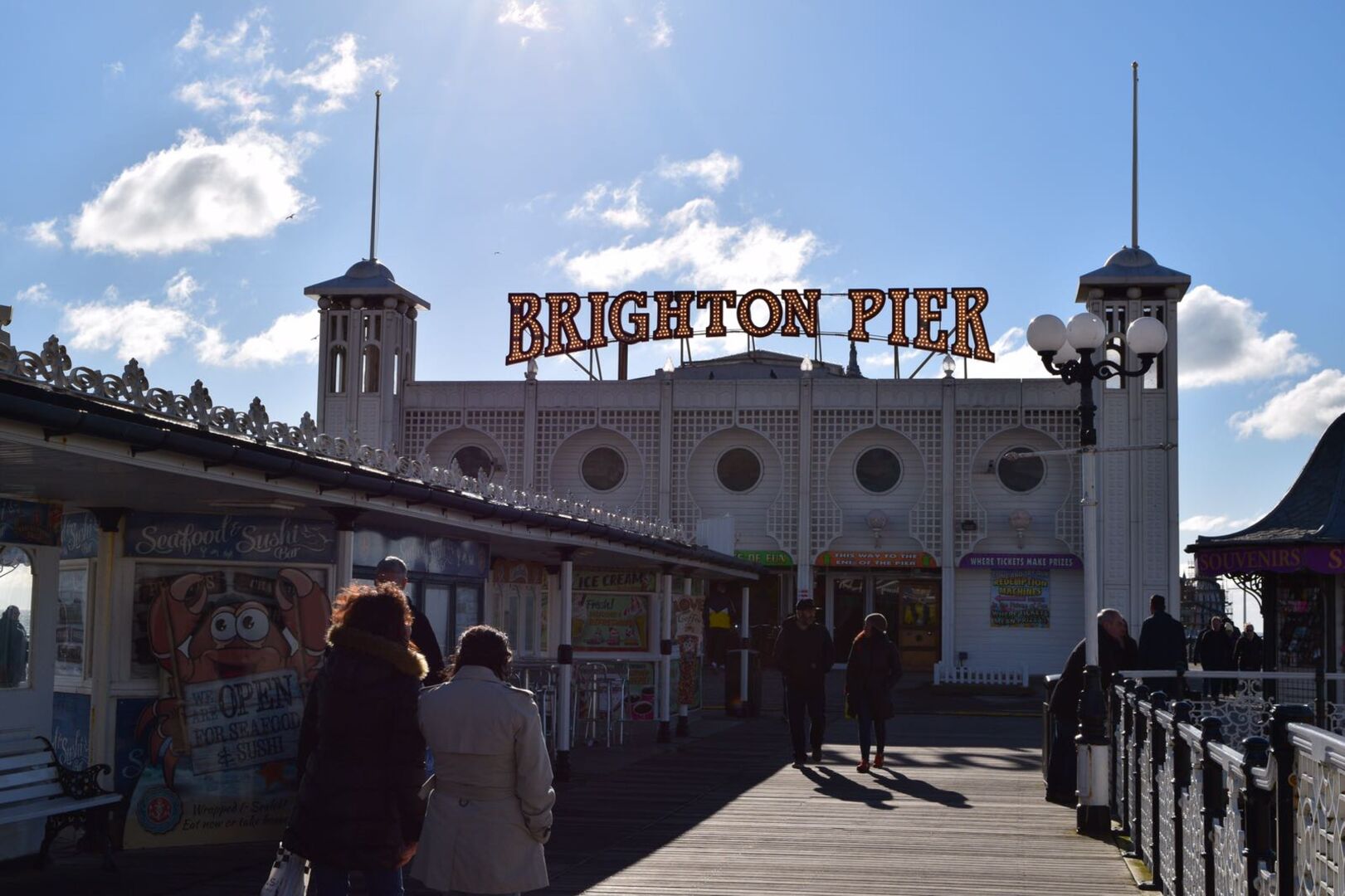 Als wir also in Brighton ankamen führte uns unser erster Weg direkt an den Strand, zumal einen die Hauptstraße und der Menschenstrom auch direkt dorthin locken. Und wie so oft schon überkam mich sofort dieses Gefühl der Ruhe, als ich aufs Meer hinausschaute in die Vormittagssonne, die trotz Kälte tapfer durch die Wolken blinzelte. Ich wusste einfach sofort, dass mich diese Stadt begeistern würde. Und meine Hoffnungen wurden erfüllt: Nach dem allgemeinen Wohlfühl-Moment am Meer spazierten wir weiter die Strandpromenade mit ihren niedlichen Shops, Imbissbuden und Cafés entlang und kamen schließlich unweigerlich an den berühmten Brighton Pier, einen langen und breiten Steg aufs Meer hinaus, auf dem sich nicht nur diverse Fahrgeschäfte und Achterbahnen, sondern auch ein Großteil der Touristen tummelten.