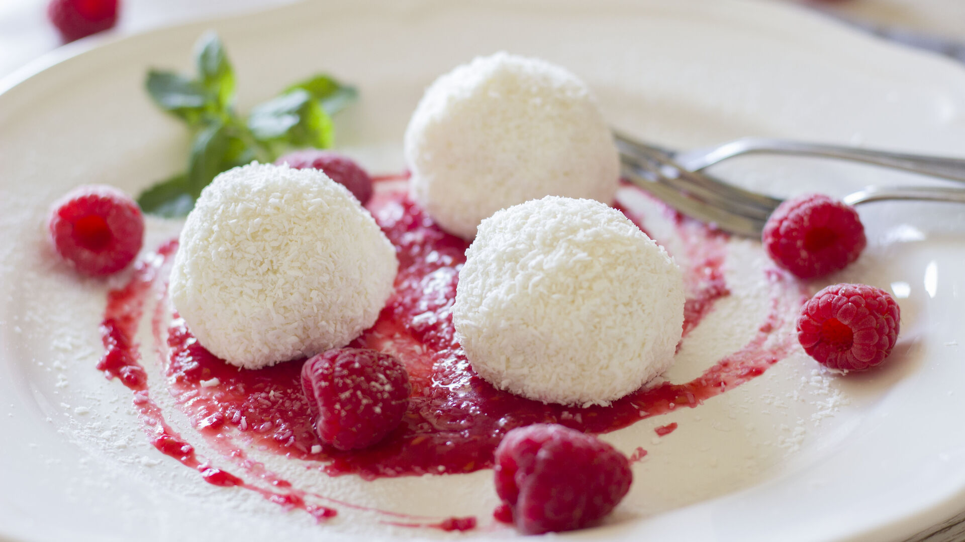 Zum Anrichten legt ihr jeweils 2-3 Eis-Topfenknödel auf einen Teller, bestreut alles nochmal großzügig mit Kokosraspeln (Tipp: besonders aromatisch werden sie, wenn ihr sie für wenige Minuten in einer Pfanne ohne Öl anröstet) und dekoriert den Teller mit der Himbeersauce.