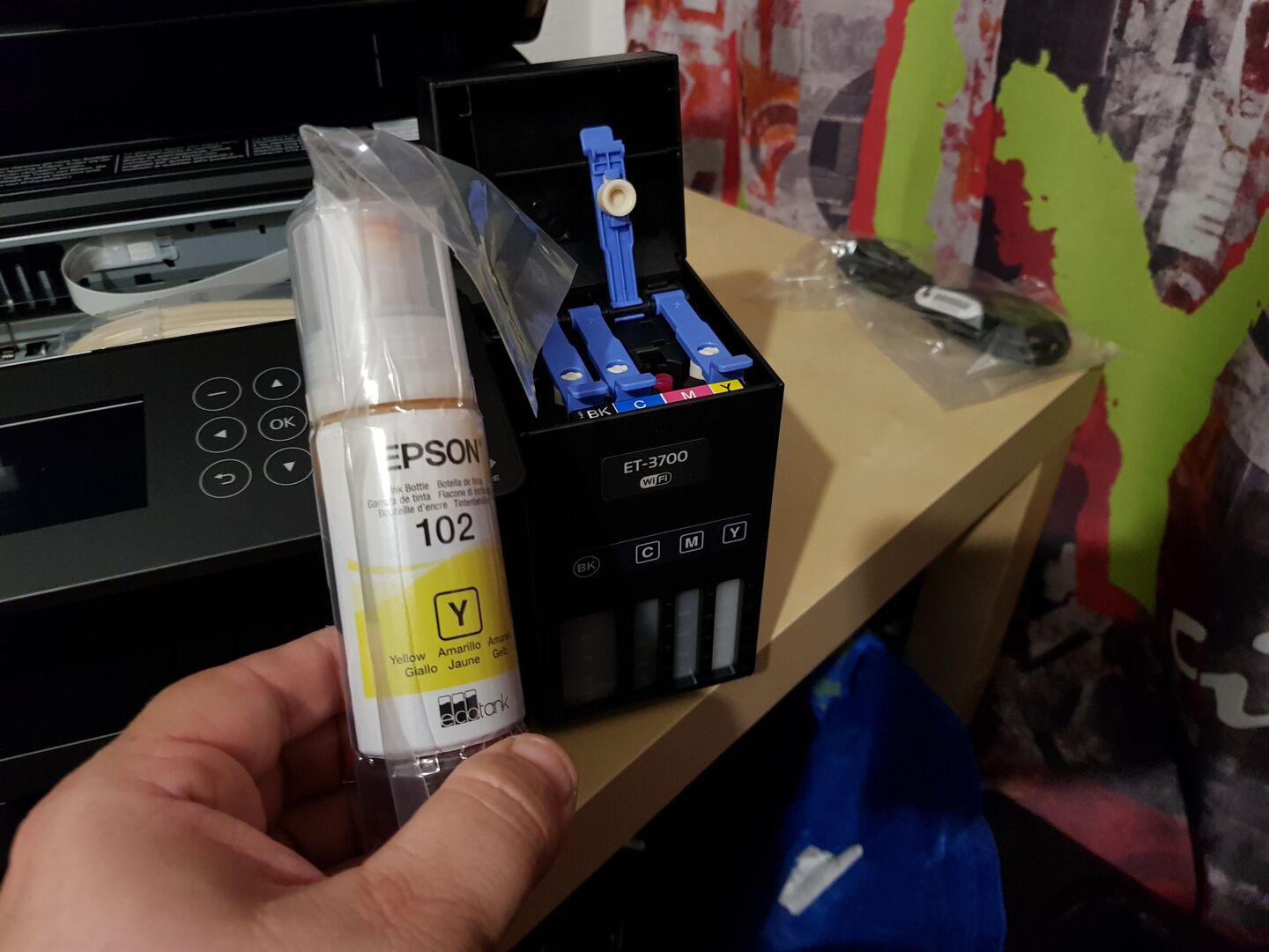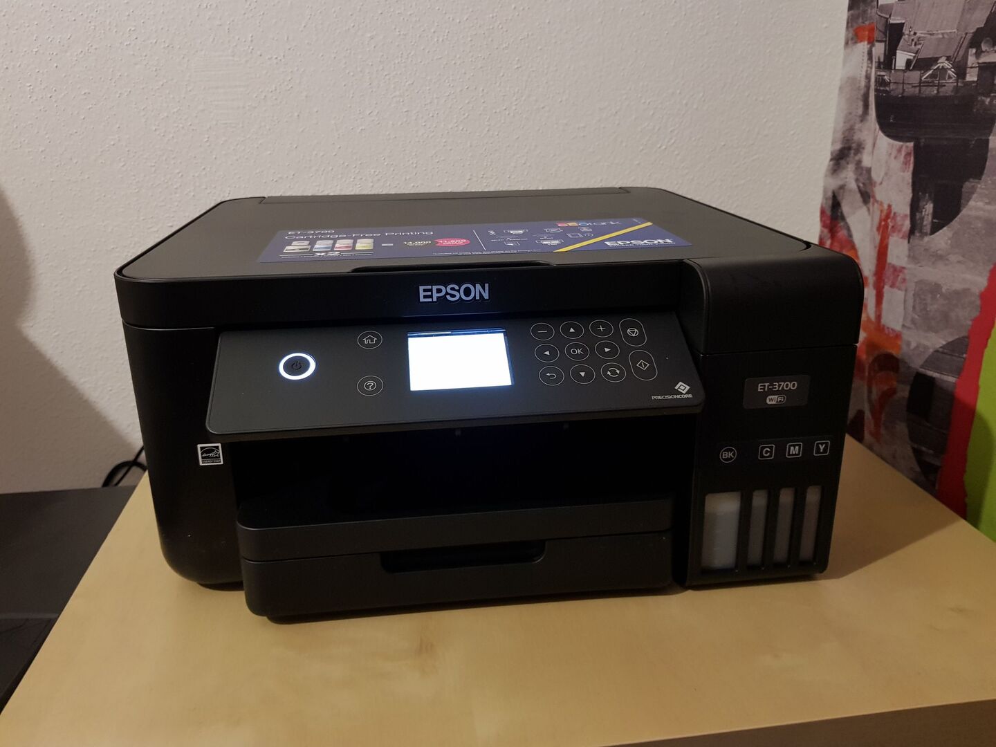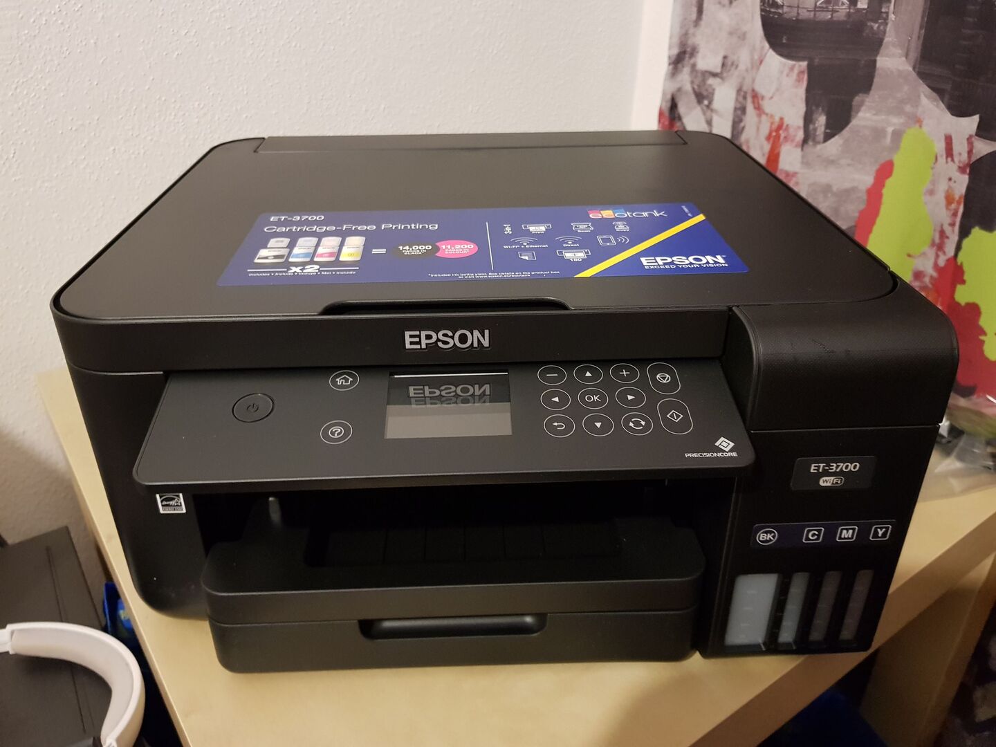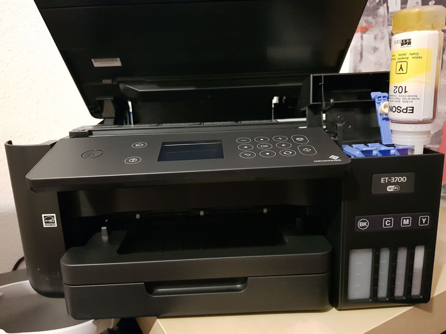 Wer kennt die Situation nicht? Die Druckerpatrone ist leer, und man steht im Elektromarkt auf der Suche nach der richtigen Patrone. Allein diese Aufgabe ist schon schwierig, weil es gefühlt tausende verschiedene Patronen gibt. Aber das böse Erwachen kommt meist erst, wenn die Patrone gefunden ist und man das Preisschild sieht. Es kann schon mal vorkommen, dass die Patrone gleich teuer ist wie ein neuer Drucker. Jetzt wäre das in Ordnung, wenn da literweise Tinte drinnen wäre, aber das spielt's auch nicht! Meist sind nur ein paar Milliliter der wertvollen Druckertinte in den kleinen Patronen. Wer dann den Literpreis ausrechnet, kommt auf Summen von Gebrauchtwagen! Ein absoluter Wahnsinn, aber nicht umsonst gilt die Druckerpatrone als die teuerste Flüssigkeit der Welt. Aber warum erzähle ich euch das eigentlich? Ganz klar, weil Epson ein neues System auf den Markt gebracht hat, um diese Kosten einigermaßen zu reduzieren - den EcoTank-Drucker. Der kostet zwar etwas mehr in der Anschaffung, hat aber einiges an Tinte bereits dabei (Epson meint Tinte für drei Jahre - hängt natürlich davon ab, wieviel man druckt). Der ET-3700 hat es damit auf meinen Schreibtisch geschafft.