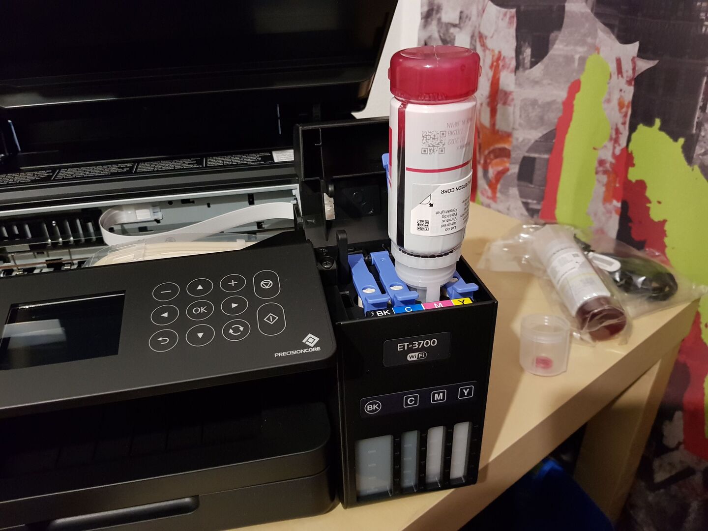 Beim Auspacken des Druckers fällt mir auf, dass da wirklich ordentlich Tinte mit dabei ist. Was ich auch noch nie erlebt habe ist, dass die Tinte nicht per Patrone in den Drucker kommt, sondern in kleine Tintentanks eingefüllt wird. Zuerst sträube ich mich, ein Tintenfass in ein elektronisches Gerät zu kippen, aber Epson hat sich da einen cleveren Mechanismus ausgedacht, und es tropft absolut nichts! Nachdem der Drucker aufgestellt ist, und die Tinte im Gerät ist, initialisiert sich das Gerät selbst - das dauert eine gefühlte Ewigkeit. Ansonsten ist die Installation einfach und in der beiliegenden Anleitung gut erklärt (Ja ich oute mich - ich habe die Anleitung gebraucht).