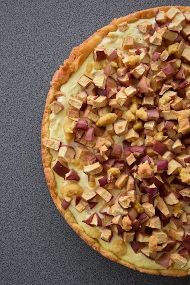 Die Äpfel in kleine Würfel schneiden und circa die Hälfte davon in die Creme unterheben. Die Masse auf den vorgebackenen Mürbteig streichen und die restlichen Äpfel drauflegen. Nun den Teig, der zur Seite gelegt wurde in kleine Kugeln formen und auf die Äpfel legen.