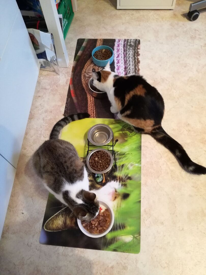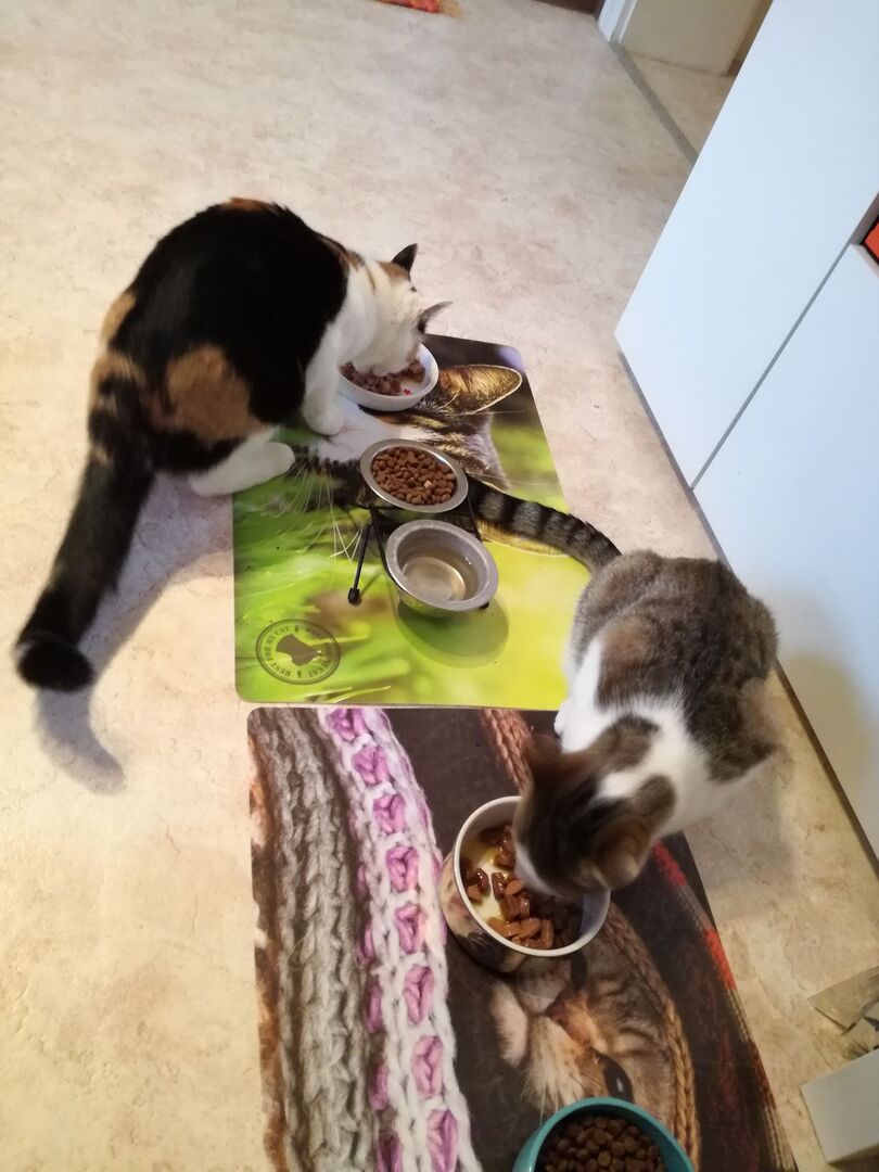 Während Ella mittlerweile schon ein bisschen über ein Jahr alt ist, wird Carlos demnächst erst sechs Monate alt. Das "Problem" (ich mag das Wort nicht) dabei: Carlos ist zuhause der Chef! Also er legt sich hin, wo er will – ohne Rücksicht auf Ellas Lieblingsplatzerl zu nehmen – und er geht zu der Futterschüssel, die ihm gerade besser anschaut. Oft wechselt er dabei drei Mal von einem Napf zum anderen – und Ella geht halt dann zu dem, aus dem er gerade nicht schnabuliert. Sie fügt sich ihm. Ich mische mich da nicht ein, Hauptsache es gibt keinen Futterneid oder Aggressivität zwischen den beiden. Jedenfalls ist dieses Essverhalten schwierig, wenn einer der beiden ein Diätfutter essen soll und der andere nicht bzw. wenn Carlos Junior-Futter und Ella Erwachsenen-Futter zu sich nehmen sollte.