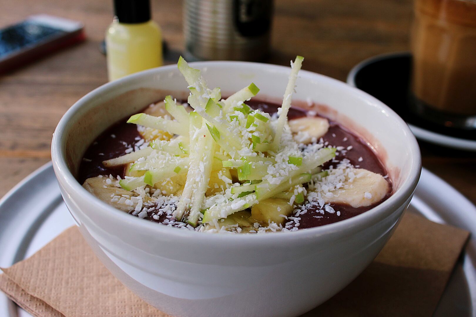 Für die Grundzusammensetzung der Açai Bowl wird das Açai-Püree benötigt. Dies gibt es alternativ auch in Pulverform. Zusammen gemixt wird es mit Blaubeeren, Bananen und Mandelmilch. E voilà. Je nach Café aber auch Geschmack kann die “Bowl” mit verschiedenen Obststücken oder Toppings garniert werden, zum Beispiel Apfel- oder Bananenscheiben, Granola Müsli, Erdbeeren, Kiwi, Ananas aber auch Chia- Samen oder Kokosraspeln.