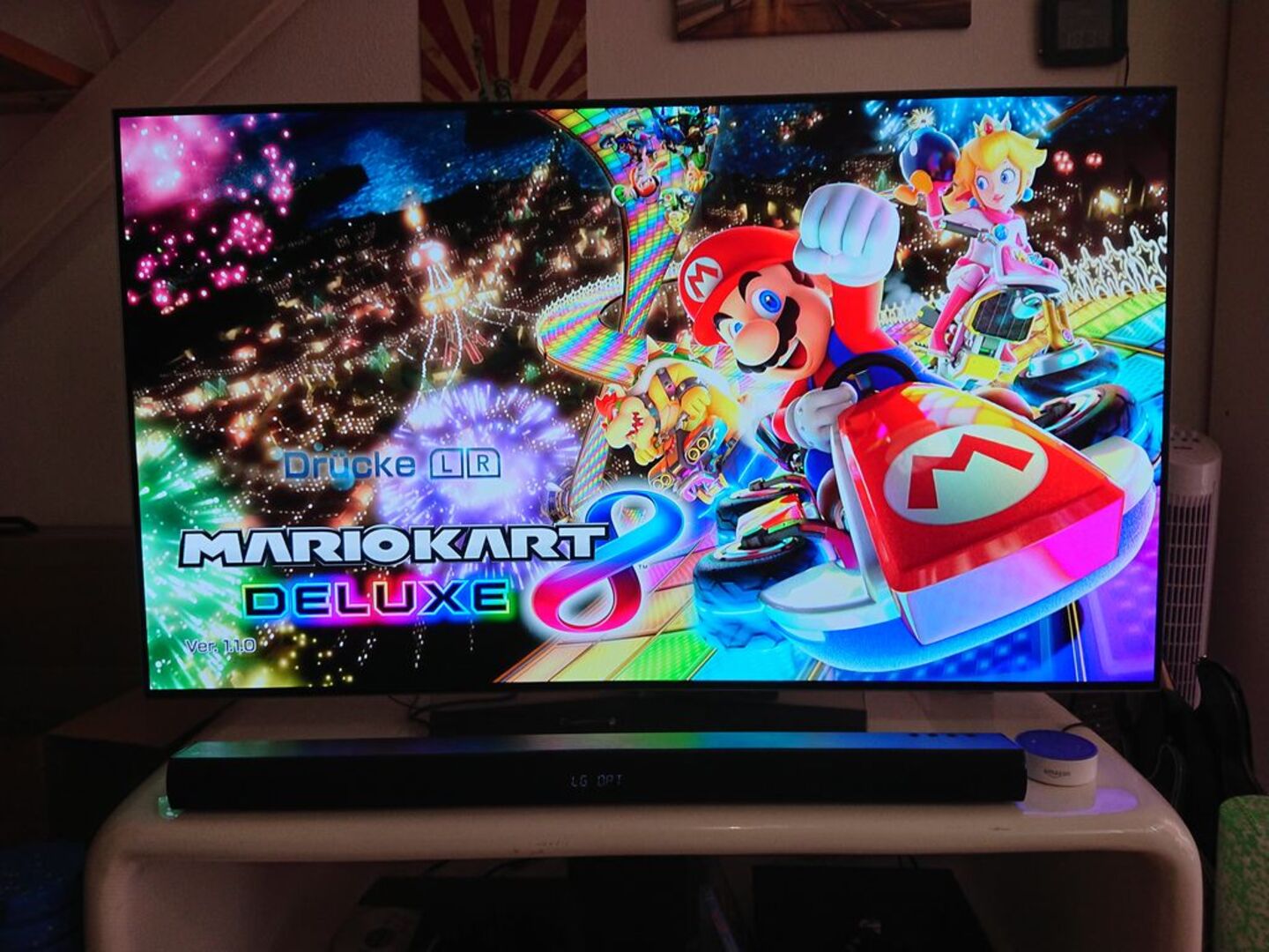 Ich bin so vertieft und merke nicht, dass ich am Handheld schon eine halbe Stunde verbracht habe. Jetzt ist es natürlich Zeit die Switch am Fernseher zu testen. Also rein in die Docking-Station und ab. Sofort erscheint mir Mario auf meinem 55-Zoll-Fernseher und ich bin beeindruckt. Während Spiele im Handheld-Modus nämlich „nur“ auf 720p - also HD Ready - laufen, ist es am Fernseher Full-HD. Nintendo hat noch nie schöner ausgesehen - die Mario Kart-Welten fliegen mir um die Ohren. Ich bin selig!