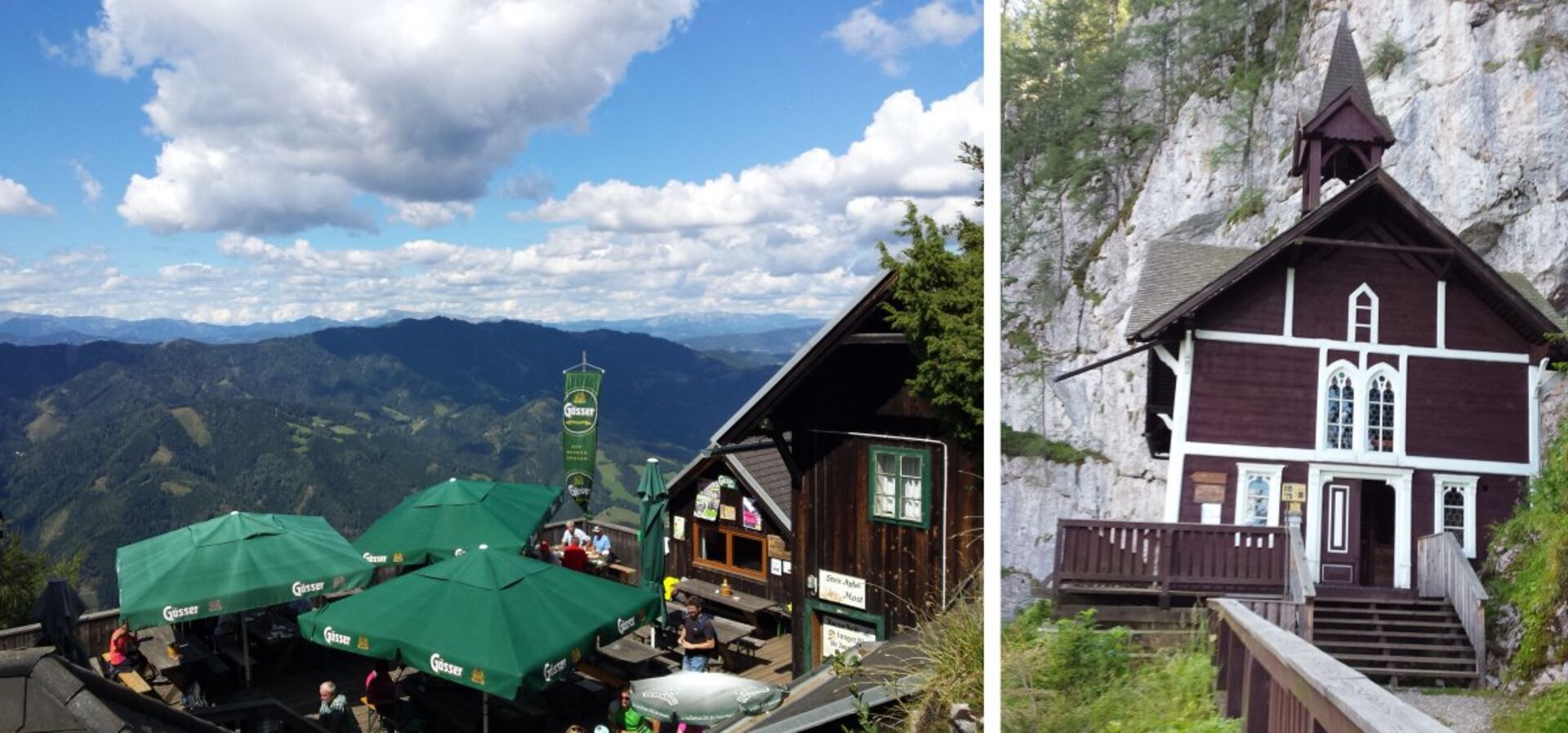 Im wahrsten Sinne des Wortes, denn von da an ging es über Leitern und Stege steil bergauf. Der Bach, der diese Klamm formt, zog uns förmlich in seinen Bann. Ein wunderbarer Ort, um im Getoße des Wassers neue Energie zu tanken. Gerade an heißen Sommertagen ein Genuss. Am oberen Ende der Klamm lässt die Gegend jedes Wanderherz höher schlagen. So gibt es unzählige Wege, die noch beschritten werden wollen. Wir entschlossen uns, dem steirischen Jokl und Schüsserlbrunn, einer Wallfahrtskirche auf 1363 Meter Höhe, die direkt auf einem Fels-Plateau errichtet wurde, einen Besuch abzustatten. Auch hier wurden wir mit einem spektakulären Fernblick in die Region Sölkpass belohnt.