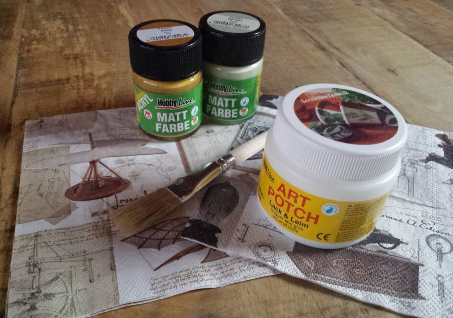 Hier zählt auf jeden Fall eine gründliche Vorbereitung. Die gewünschten Motive aus der Serviette ausschneiden oder reißen (ergibt einen nahtloseren Übergang) und alle Schichten - bis auf die oberste - entfernen. Da beim Auftragen der Bilder mittels Serviettentechnik-Kleber der Untergrund durchscheint, kann man sich überlegen, ob man diesen nicht noch farblich anpassen möchte. Das geht am leichtesten mit Acrylfarben. Durch Mischen verschiedener Töne oder Aufbringen mittels Pinsel, Schwamm, Tuch, Rolle etc. kann man tolle Effekte erzielen, die das Endergebnis noch interessanter wirken lassen. Um gerade Linien zu erhalten, den gewünschten Bereich einfach mit Malerkrepp abkleben, das sich nach getaner Arbeit rückstandslos abziehen lässt.