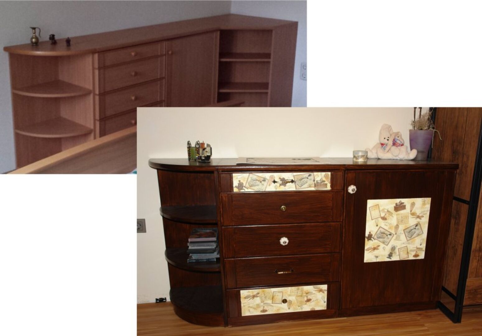 Die alte Vollholzkommode mit Buchendekor wird mein Versuchsobjekt. Mehr als dass ich sie nachher entsorgen muss, kann ja nicht passieren. Als erstes mache ich mich an die grobe Planung. Welche Möglichkeiten gibt es, um dem guten Teil ohne großen Aufwand ein neues Farbmäntelchen zu verpassen?