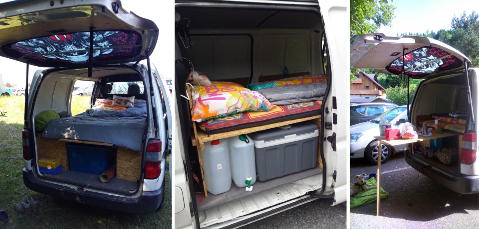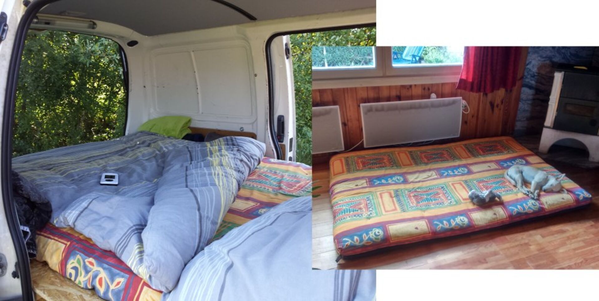 … zumindest ist das meine Anforderung an ein Nachtlager, Niko sah das natürlich aus einem anderen Blickwinkel, und so wurde auch die Funktionalität zu einem wichtigen Auswahlkriterium. Von der "normalen" Matratze über Schaumstoffauflagen und klappbare "Besucher -Ungetüme" kamen wir zu der für uns optimalen Lösung: eine Futonmatratze. Entdeckt im Internet bekamen wir sie auch noch völlig gratis. Nur die Abholung aus der schönen Mondsee-Region mussten wir selbst übernehmen. Sie ist zwar nicht ganz so leicht wie manch andere Matratze, hat aber den Vorteil, dass sie sich ganz einfach zusammenklappen lässt und somit auch als Sofa fungiert. Wir lehnen einen Teil an die Innenseite des Busses und haben so eine bequeme Lehne.