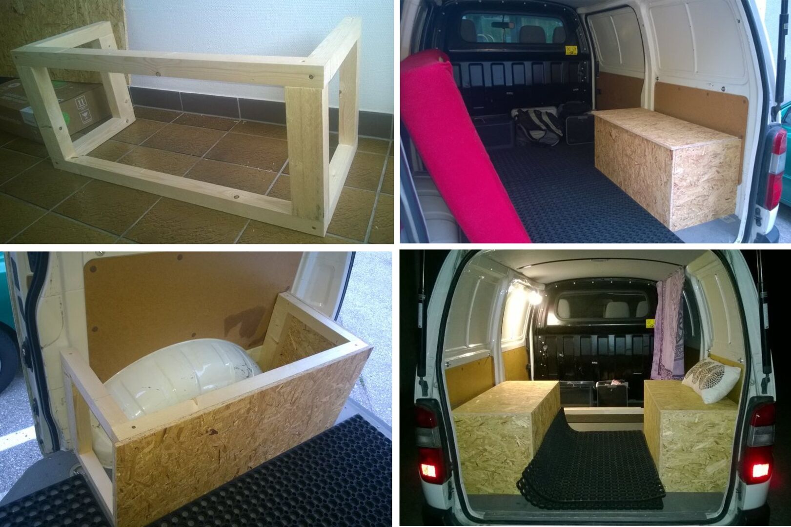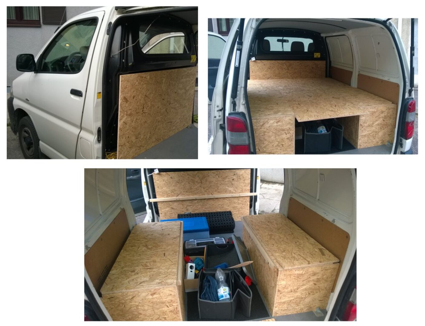 Es entstanden zwei Truhen mit aufklappbarem Deckel über den Radkästen (in weiterer Folge haben wir die hinteren Seitenteile entfernt, um auch ohne Bettumbau Zugriff zu haben), zwei kleine entnehmbare Seitenplatten im vorderen Bereich, eine Mittelplatte, die sowohl als Bettgestell als auch als ausziehbarer Tisch genutzt werden kann, und eine Trennwand zur Fahrerkabine mit Wartungsluke, hinter der sich die Technik verbirgt.