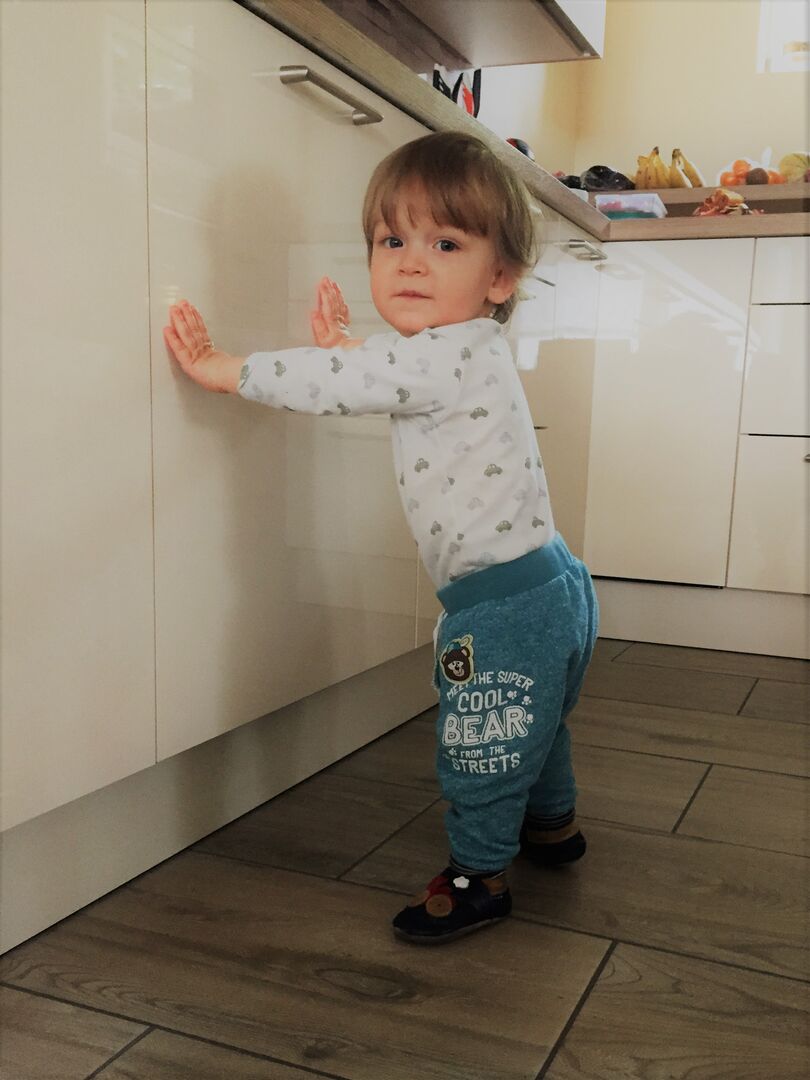 Das 10. Monat war in Konstantins Entwicklung enorm. Nicht nur, dass die ersten Zähnchen kamen, er zog sich zum ersten Mal im Laufgitter in die Höhe und lächelte mich verschmilzt an, während er da einfach so stand. Voll gepumpt mit Vaters Ehrgeiz konnte er dann drei Monate später auch von selbst aufstehen.