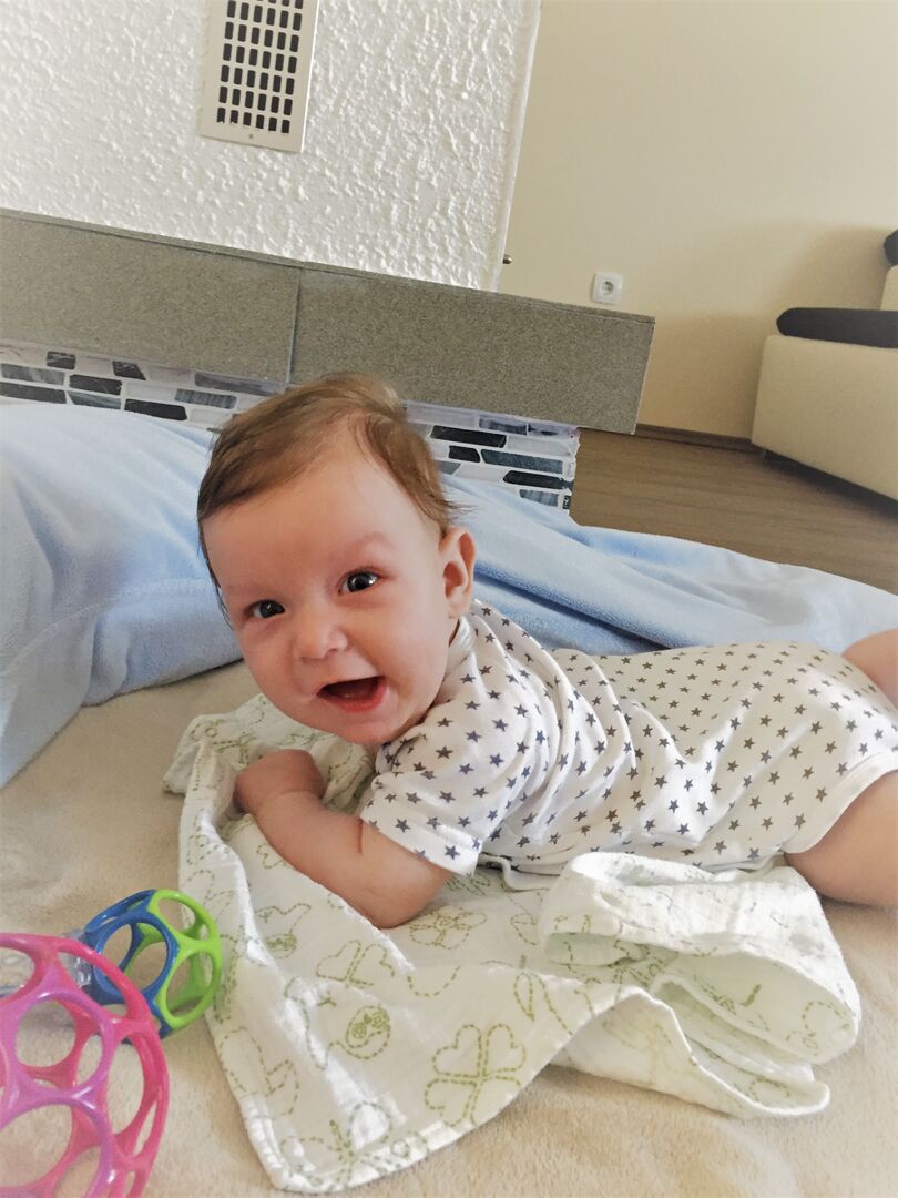 Im 4. Monat konnte sich Konstantin zum ersten Mal vom Bauch auf den Rücken drehen. Juhu, die erste Rolle ist geschafft. Ab diesem Zeitpunkt begann die mobile Zeit und nach vielen Wochen rollte er sich von seiner Krabbeldecke in Richtung Heimkino- und Radioanlage oder in die Küche. Da wurde mir beim Zusehen der acht aufeinander folgenden Rollen schon schwindelig. Aber er hatte sichtlich Spaß dabei, seine Beweglichkeit zu entdecken.